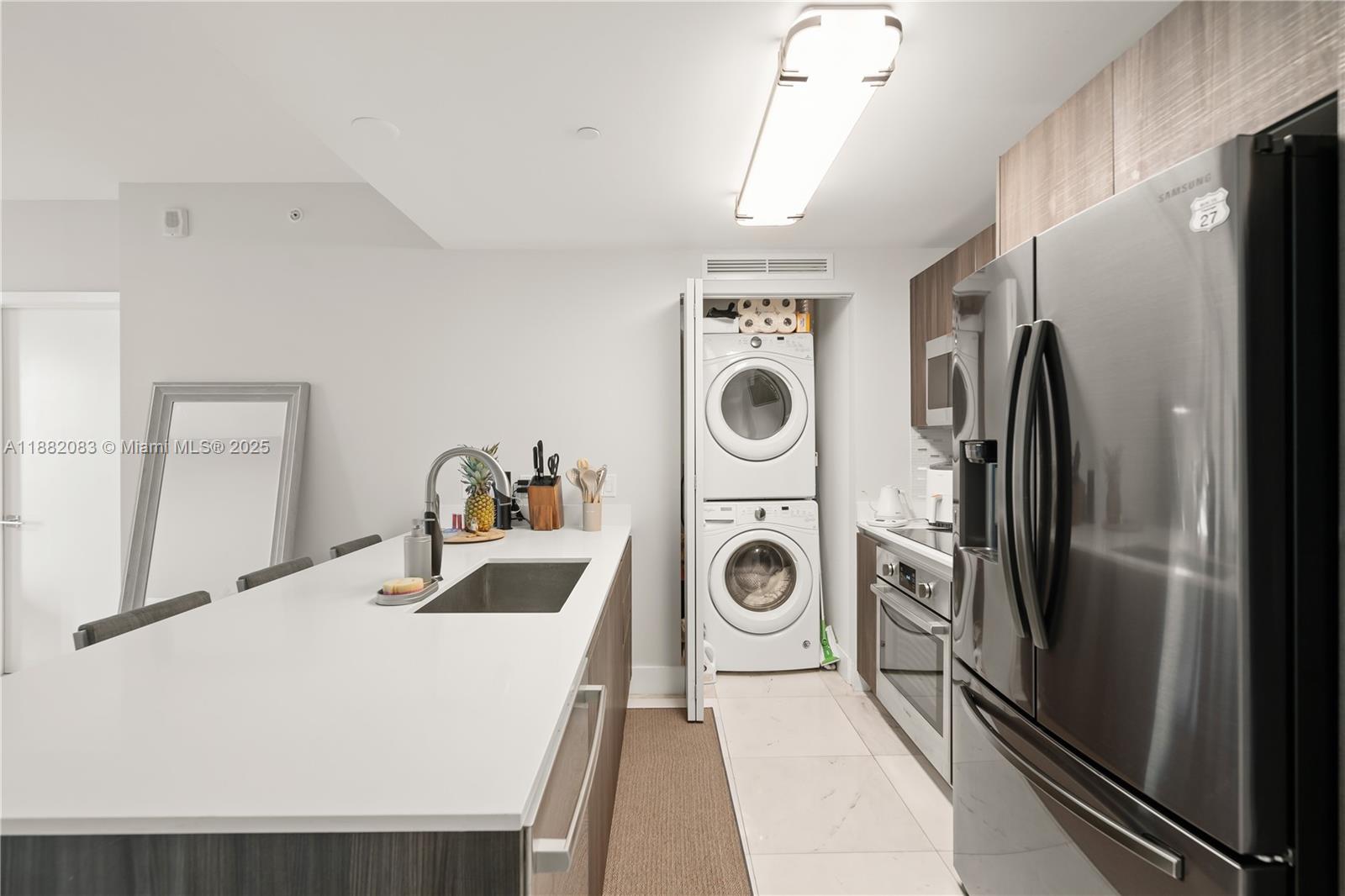Experience luxury living in this upgraded 1-bedroom plus den fully enclosed as a second bedroom residence featuring a private elevator entrance in a stunning, newly built high-rise. This elegant unit boasts white Uber marble flooring throughout, sleek stainless steel Bosch appliances, custom-designed closets, and motorized window treatments.The spacious primary bathroom offers both a soaking tub and a walk-in shower, along with dual vanities.Step onto the generously sized balcony and take in the breathtaking water views, perfect for relaxing or entertaining.Enjoy world-class amenities including two resort-style pools, a state-of-the-art fitness center, spa, hot tub, BBQ area, theater room, party lounge, and more. Vacant! Easy to show.