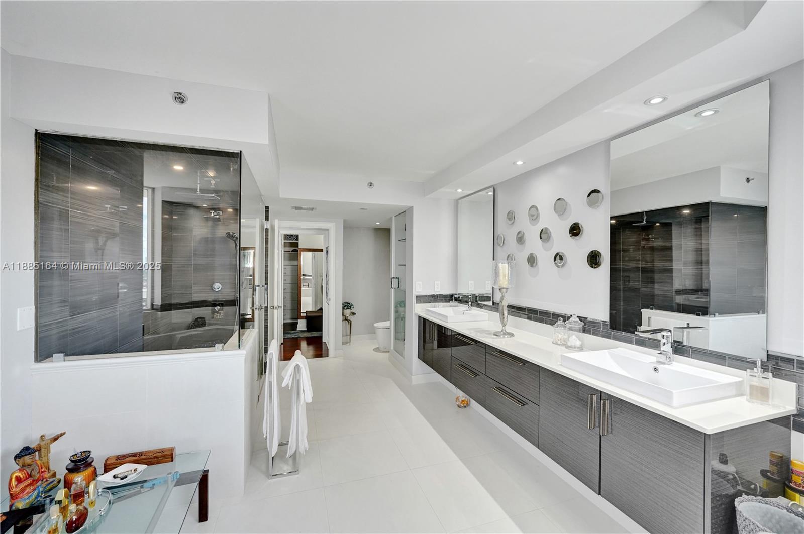 Stunning two-story sky home at The Landmark, fully renovated with designer finishes. Features 2,470 sq ft of living area, private interior elevator and stairs, open kitchen, white cabinets, quartz counters & Thermador stainless steel appliances including a wine cooler, marble floors 36x 36 throughout the 23rd floor and engineer on the stairs and lower level (22nd floor). Electric blinds. 2 en-suite bedrooms in the lower level plus enclosed den (can be 3rd Bd) in the upper level, 2.5 baths, and laundry room. Enjoy panoramic views of the ocean, Intracoastal, golf course & Aventura skyline seen from inside the unit & from the 2 spacious balconies. Hurricane shutters being installed. Luxury living in the heart of Aventura, great amenities! Building passed 40th yr. recertification.