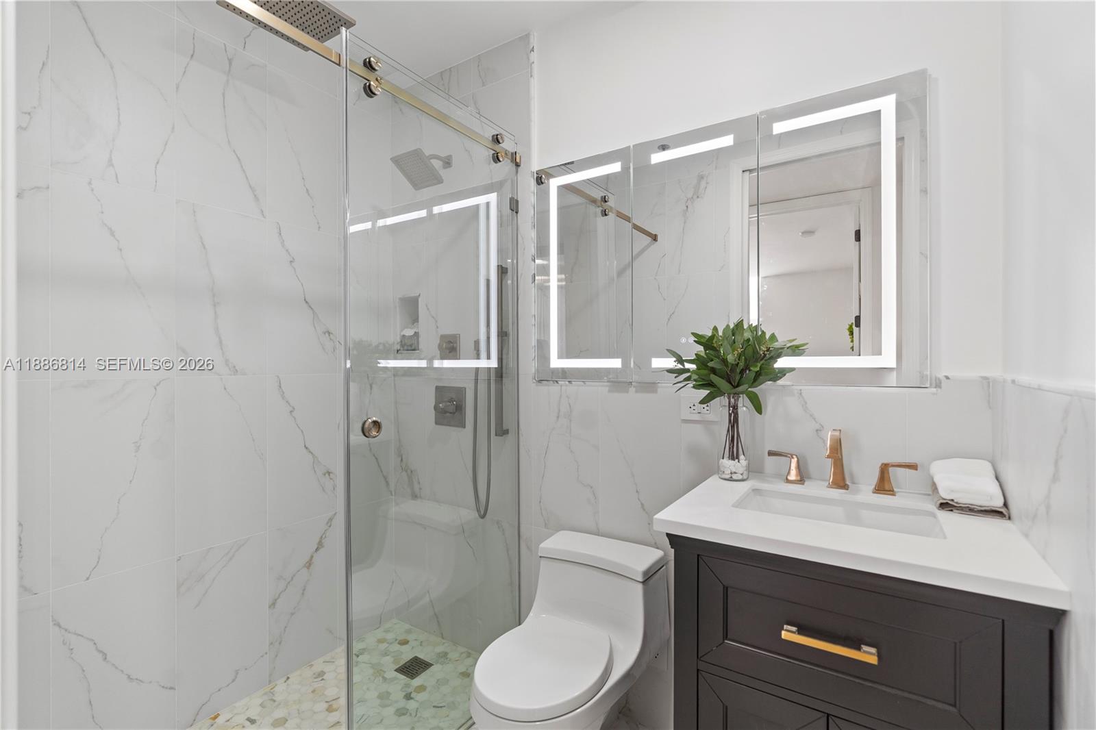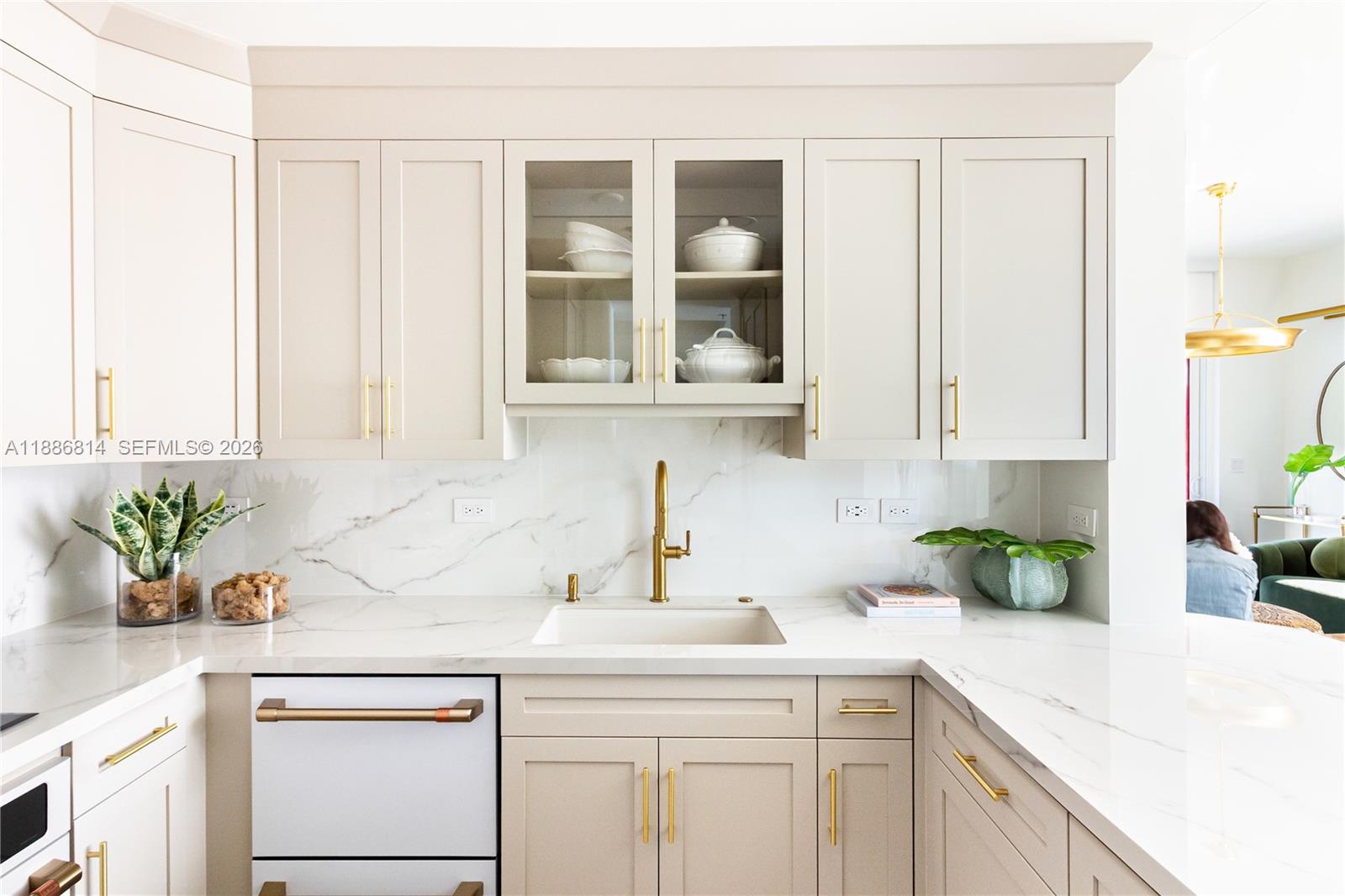 Luxury is measured in the feel ....immerse yourself in the luxury of elevated living in this premium home overlooking Granda Golf course and green tree canopies. This fully renovated three-bedroom two-bath home delivers curated comfort bathed in an abundance of natural light. This turnkey opportunity invites you to move in and simply enjoy exceptional finishes, 10-foot ceilings, and new floor to ceiling impact glass. The luxury of natural colors come to life in color drenched rooms showcasing mixed metals of solid brass and bronze, EMTEK hardware, Visual Comfort lighting, custom glass wall partition, Kohler fixtures, Italian porcelain wood look flooring, marble bath flooring , the exquisite soft veining of Calacatta gold oro, and custom cabinetry throughout. Newly reimagined, the tailored kitchen packs a punch with built in organizational features behind every door and a full suite of new Smart GE Cafe Series appliances in matte white and polished brass. All situated in one of Coral Gables' most desired condominium communities offering 24 hour concierge, privacy, security, renovated meeting rooms and gym, pool, and (soon to be completed well ahead of most other Gables condominium communities) a full exterior restoration resulting in a magnificent premium property.
