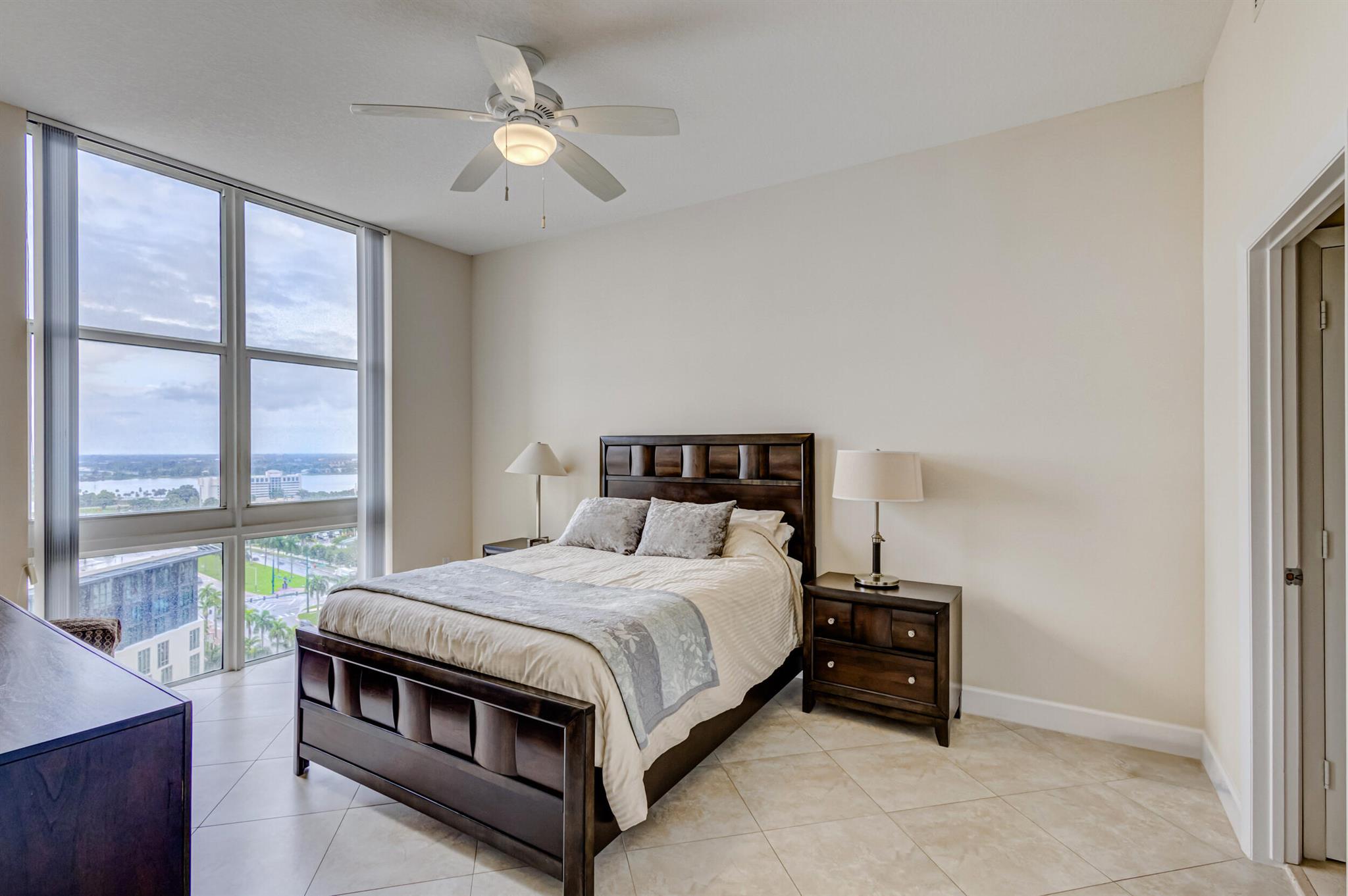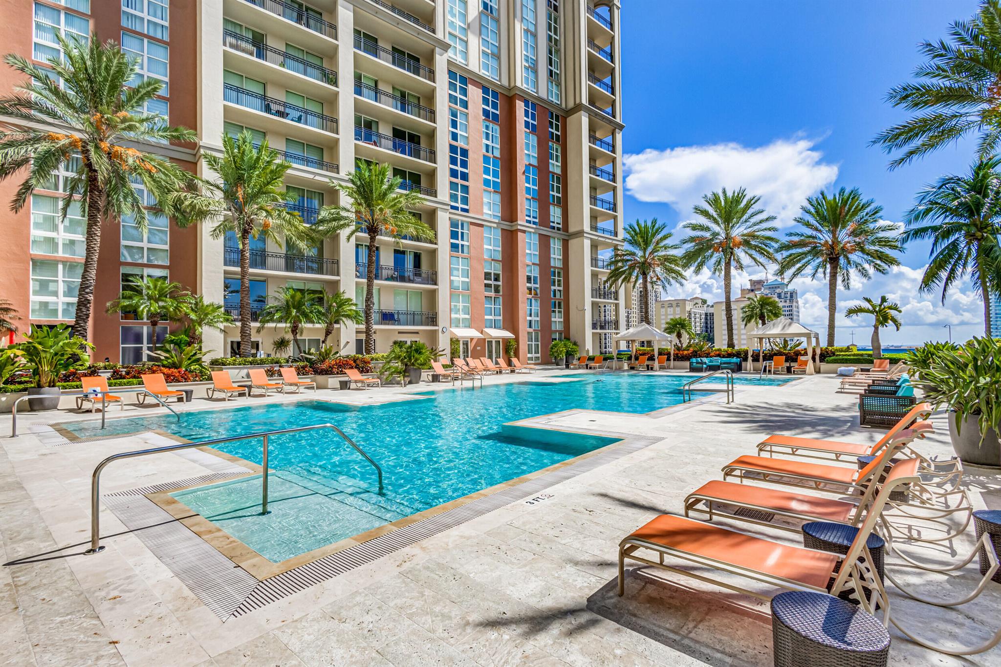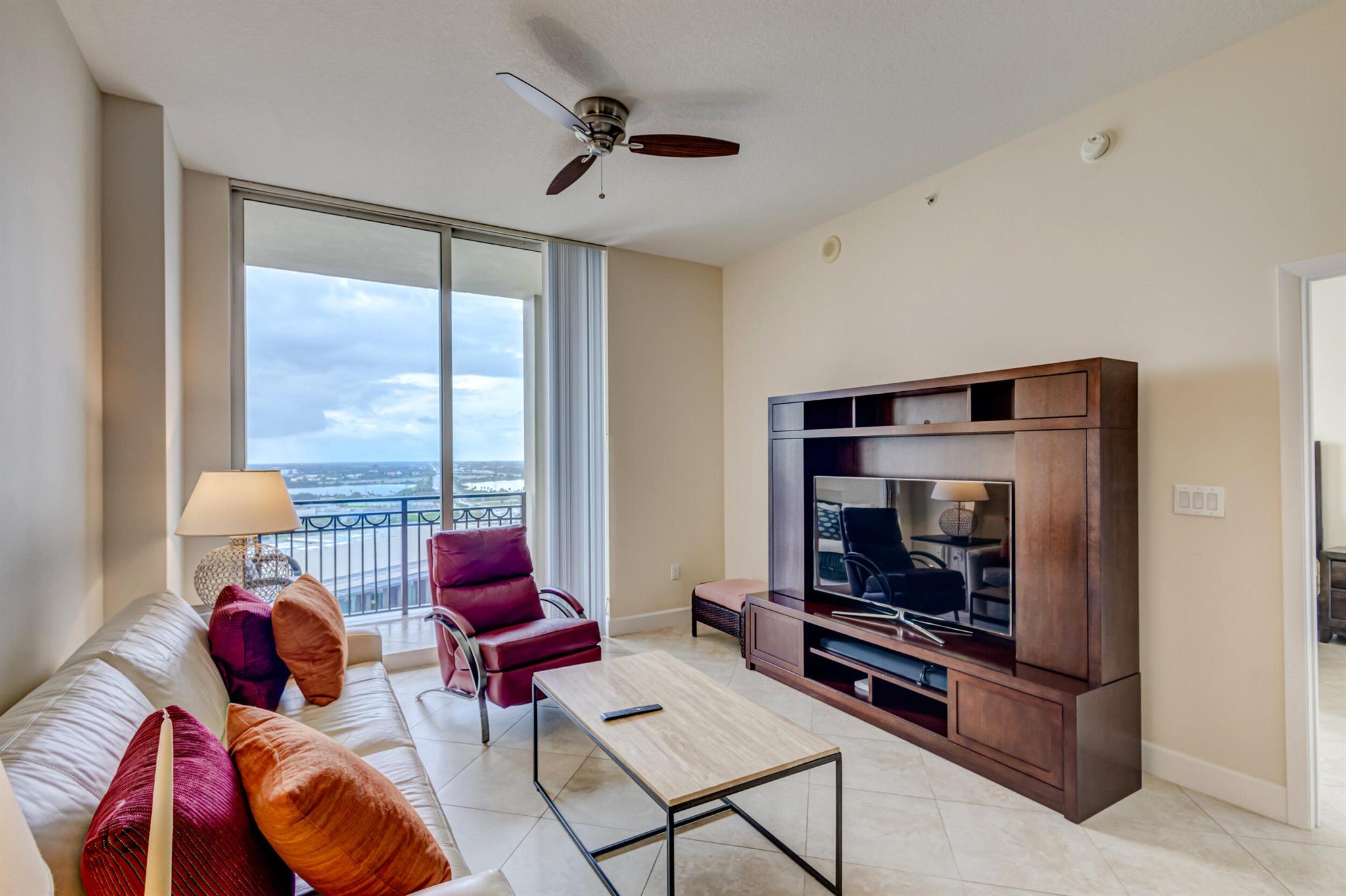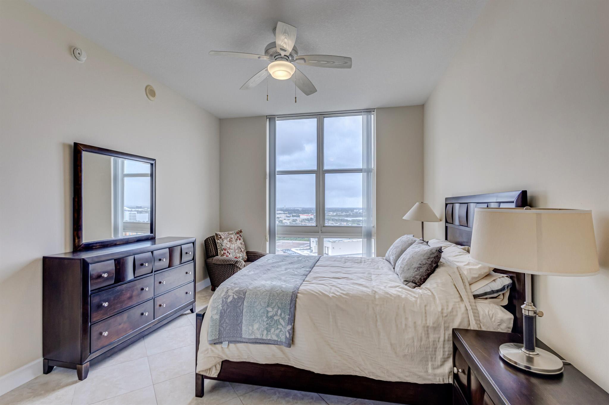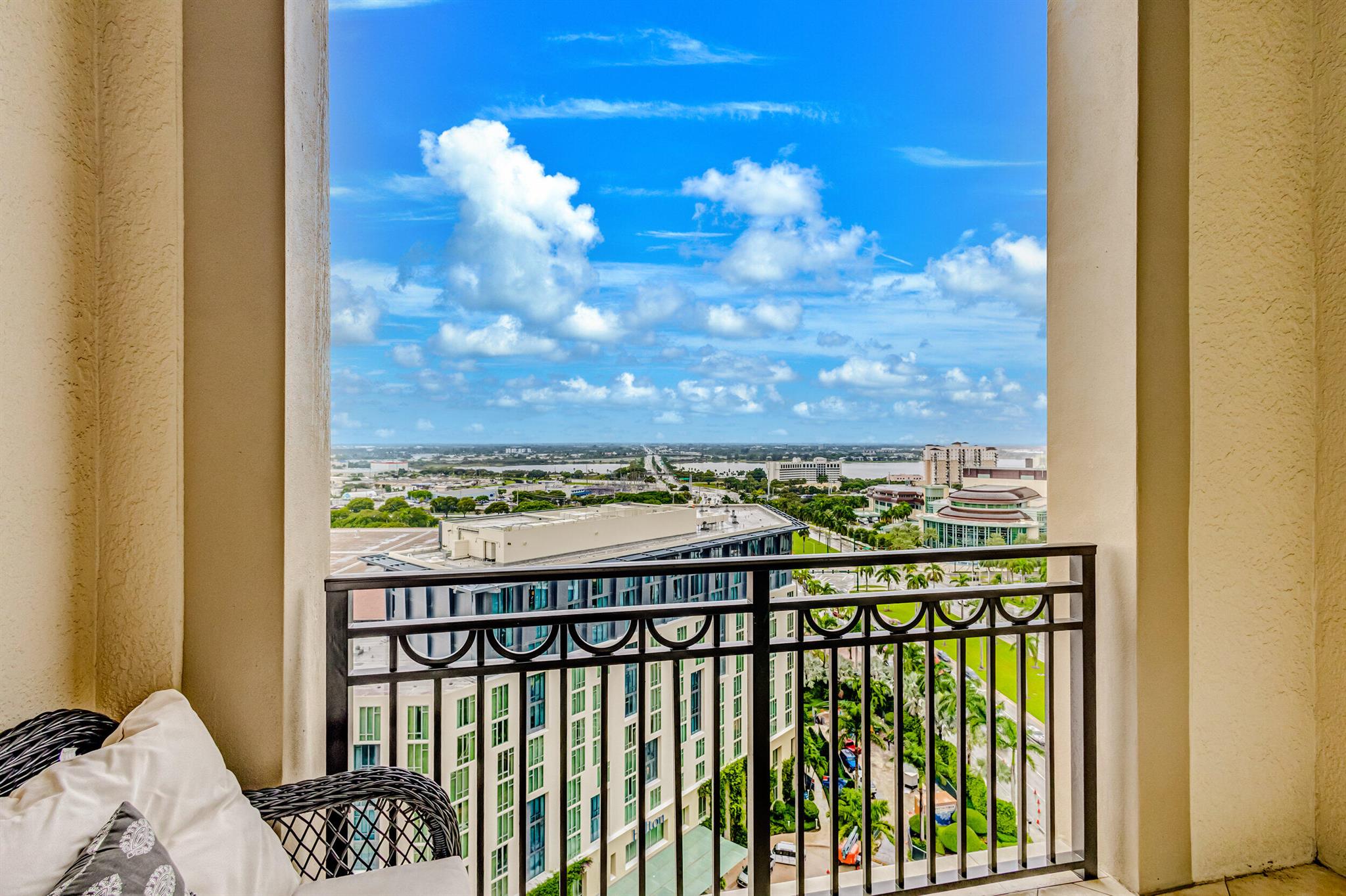 Beautiful LOWER PENTHOUSE residence features 1 bedroom, 1 bath, completely tiled with all impact windows throughout! This immaculate condo is equipped with modern kitchen cabinets, beautiful granite countertops, stainless steel Kitchen Aid appliances, Bosch air conditioner, and laundry closet with full size front load Samsung washer and dryer. Live in luxury as you enjoy your morning coffee or evening views of Downtown West Palm Beach from your covered and tiled balcony. Discover South Florida living in the prestigious Cityplace South Tower. This resort style building offers first class amenities including 24-hour front desk, valet parking, heated infinity pool and spa, state-of-the-art fitness center, lounge, summer kitchen and more!