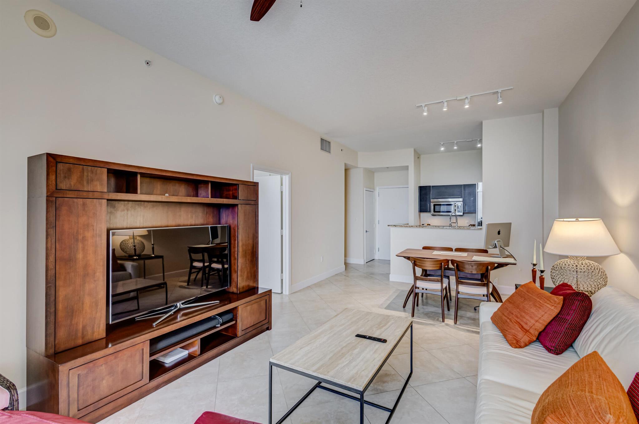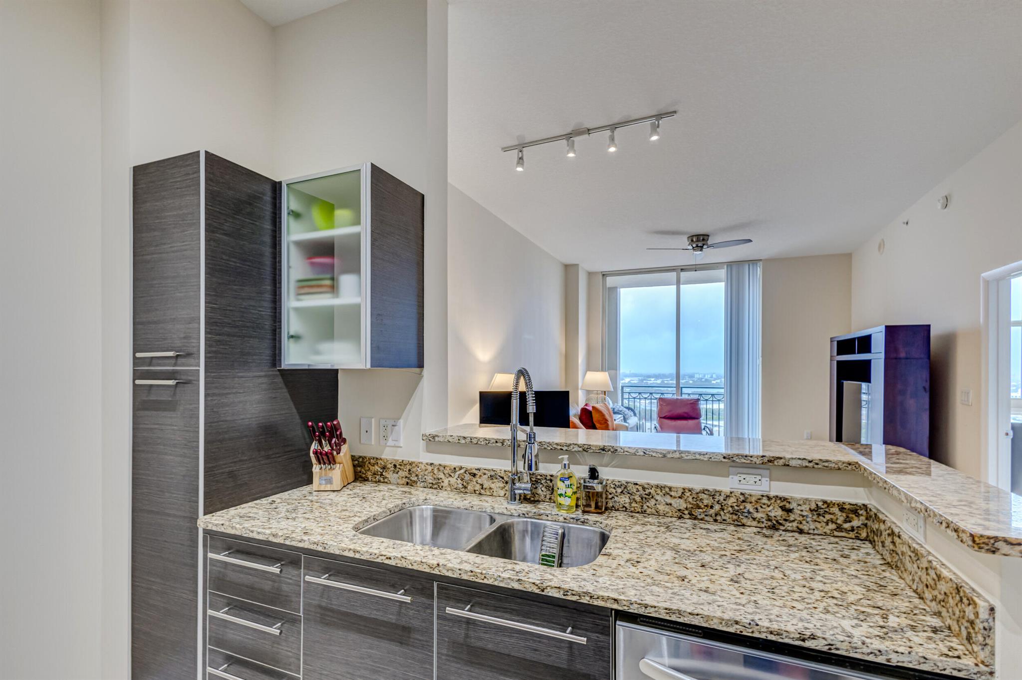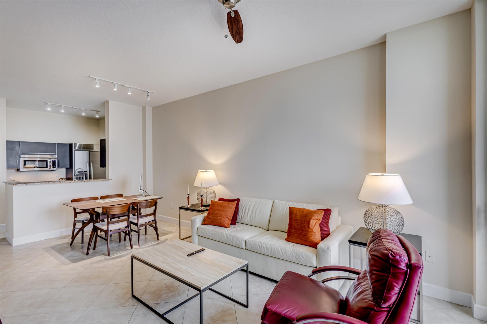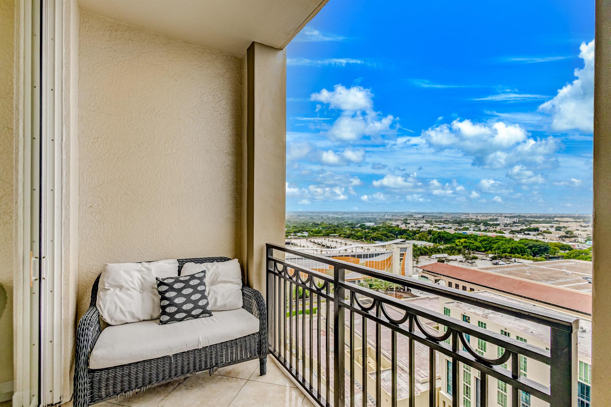 Beautiful LOWER PENTHOUSE residence features 1 bedroom, 1 bath, completely tiled with all impact windows throughout! This immaculate condo is equipped with modern kitchen cabinets, beautiful granite countertops, stainless steel Kitchen Aid appliances, Bosch air conditioner, and laundry closet with full size front load Samsung washer and dryer. Live in luxury as you enjoy your morning coffee or evening views of Downtown West Palm Beach from your covered and tiled balcony. Discover South Florida living in the prestigious Cityplace South Tower. This resort style building offers first class amenities including 24-hour front desk, valet parking, heated infinity pool and spa, state-of-the-art fitness center, lounge, summer kitchen and more!