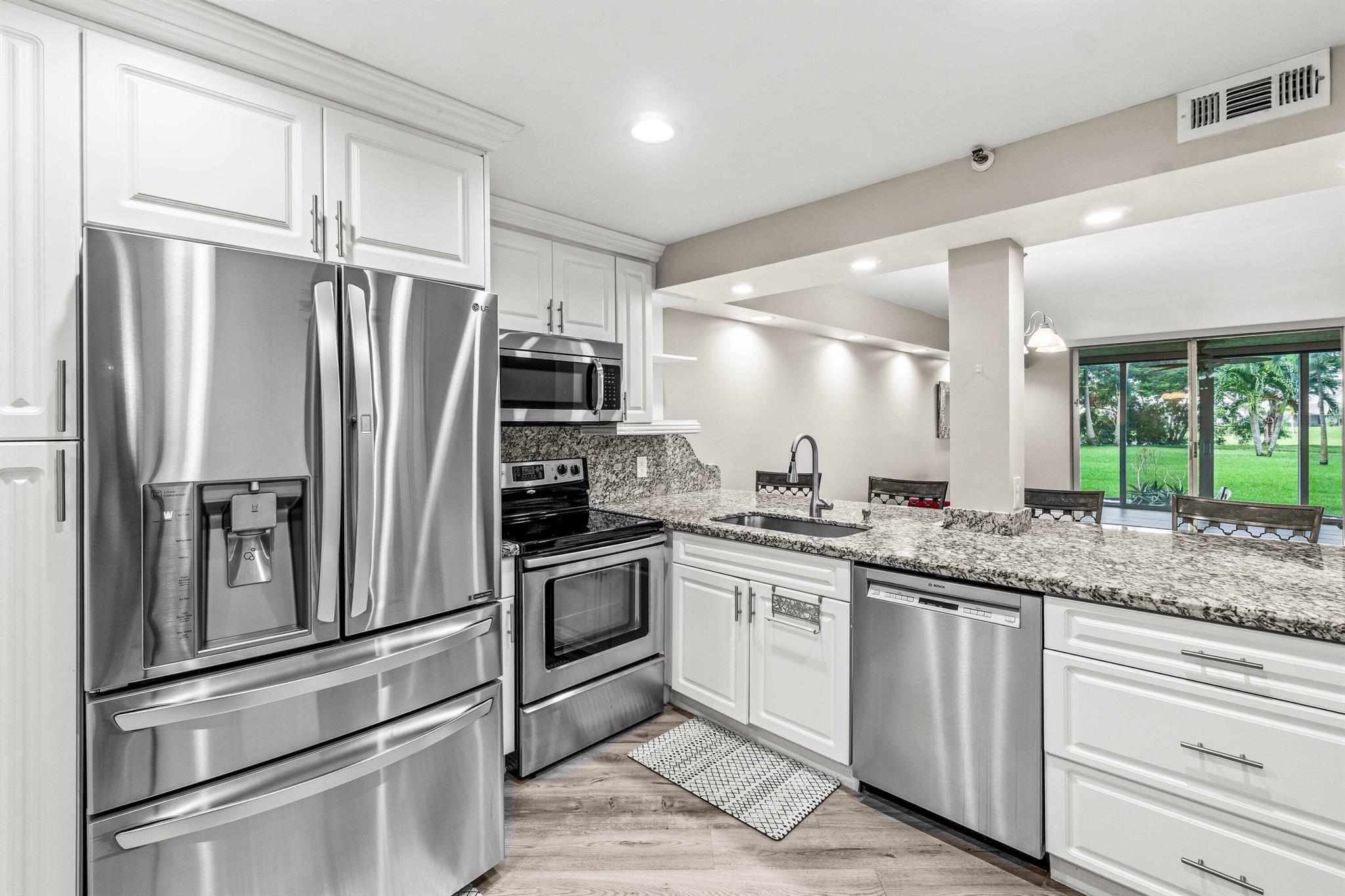 Step into this beautifully renovated and reimagined condo featuring an open kitchen with high-end appliances, stunning countertops and cabinetry, and a spacious pantry with pull-out drawers and built-in lighting. Electronic window treatments add a touch of modern convenience throughout. Every room has been thoughtfully updated with quality craftsmanship and top-of-the-line materials, creating a truly move-in-ready home. As an end unit, you'll enjoy fantastic water views from every window, filling the space with natural light and serenity. Recent upgrades include a 3-year-old A/C system and a new washer and dryer (installed last year). Accordion hurricane shutters on all windows, plus high impact, low heat glass sliding patio doors so you can enjoy added space the patio has to offer.