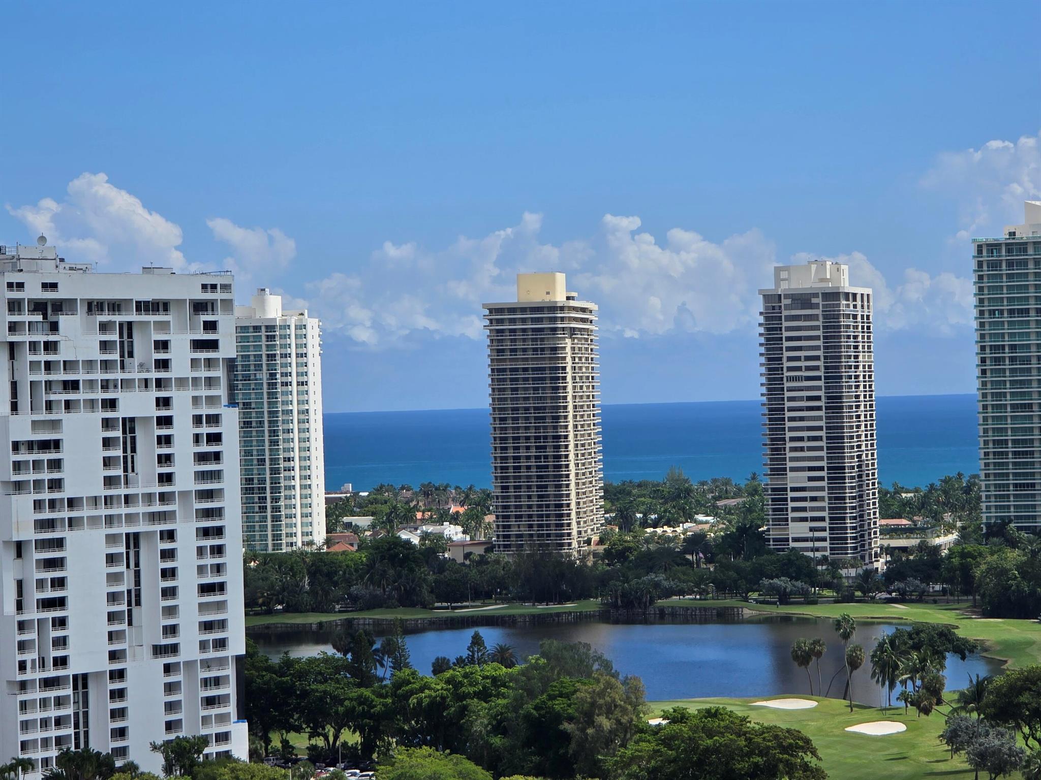 BREATHTAKING VIEW OF THE PRESTIGIOUS TURNBERRY GOLF COURSE AND LAKES ALONG WITH A GLIMPSE OF THE OCEAN FROM YOUR BALCONY. THIS UNIT HAS BEEN REMODELED WITH GEORGEOUS TILE AND CARPET. BATHROOM WAS ALSO REDONE. 24 HOUR GUARD GATE COVERED PARKING, LOVELY POOL, EXERCISE ROOM, MINUTES FROM MAJOR HIGHWAYS, BEACH, STORES, CASINOS, RESTAURANT. COURTESY BUS TO THE MALL., BRIGHTLINE TRAIN. ALL AGES WELCOME.