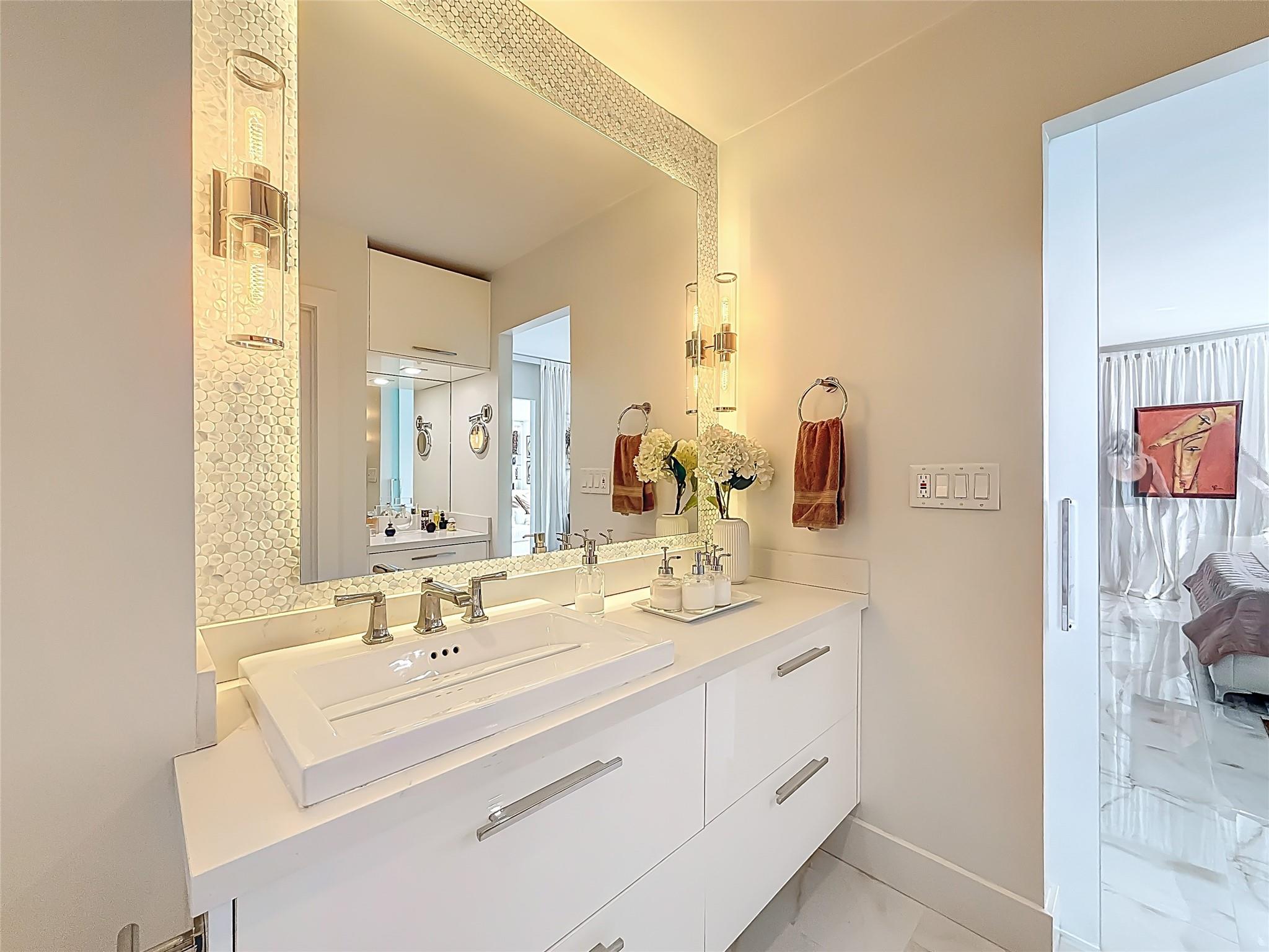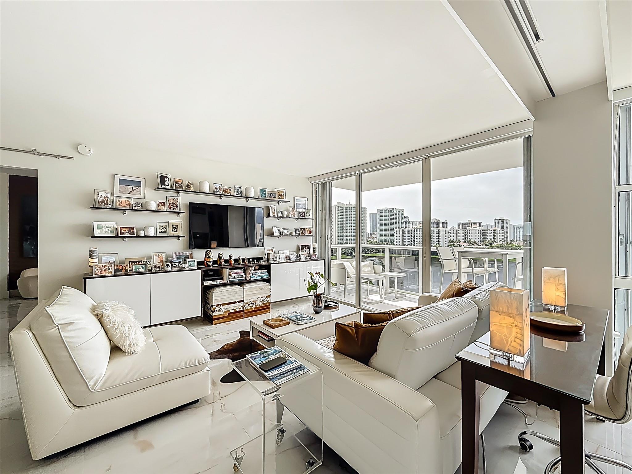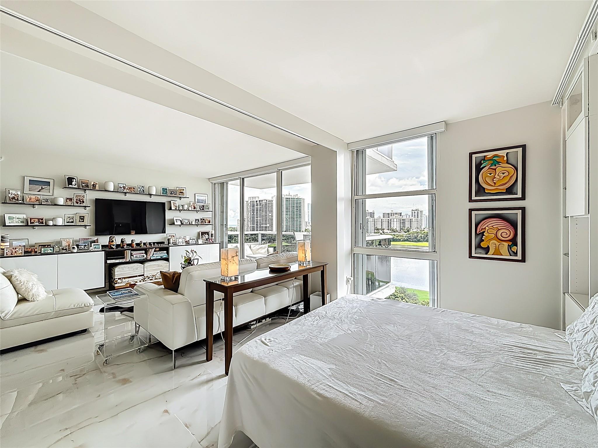 Architect’s residence with turnkey fully furnished option. 180-degree views of sunrises over the ocean, majestic sunsets, shimmering moonrises & serene lake reflections. Innovative living area seamlessly integrates the LR, DR & 2nd BR for open concept, but can be portioned into an office/bedroom w/ a panel pocket wall system. Artfully concealed Murphy bed creates a BR w/ closet & en-suite bathroom. Interior features: 3D accent walls, exquisite mother of pearl tile, custom kitchen, bar w/ built-in cabinets, entertainment center w/ floating shelves, motorized blackout shades, WIC, lots of storage, hurricane shutters & deeded parking (2nd available). Location is on the Soffer nature trail & Turnberry lakes…Walk to Aventura mall, restaurants, houses of worship, dog park, horse track