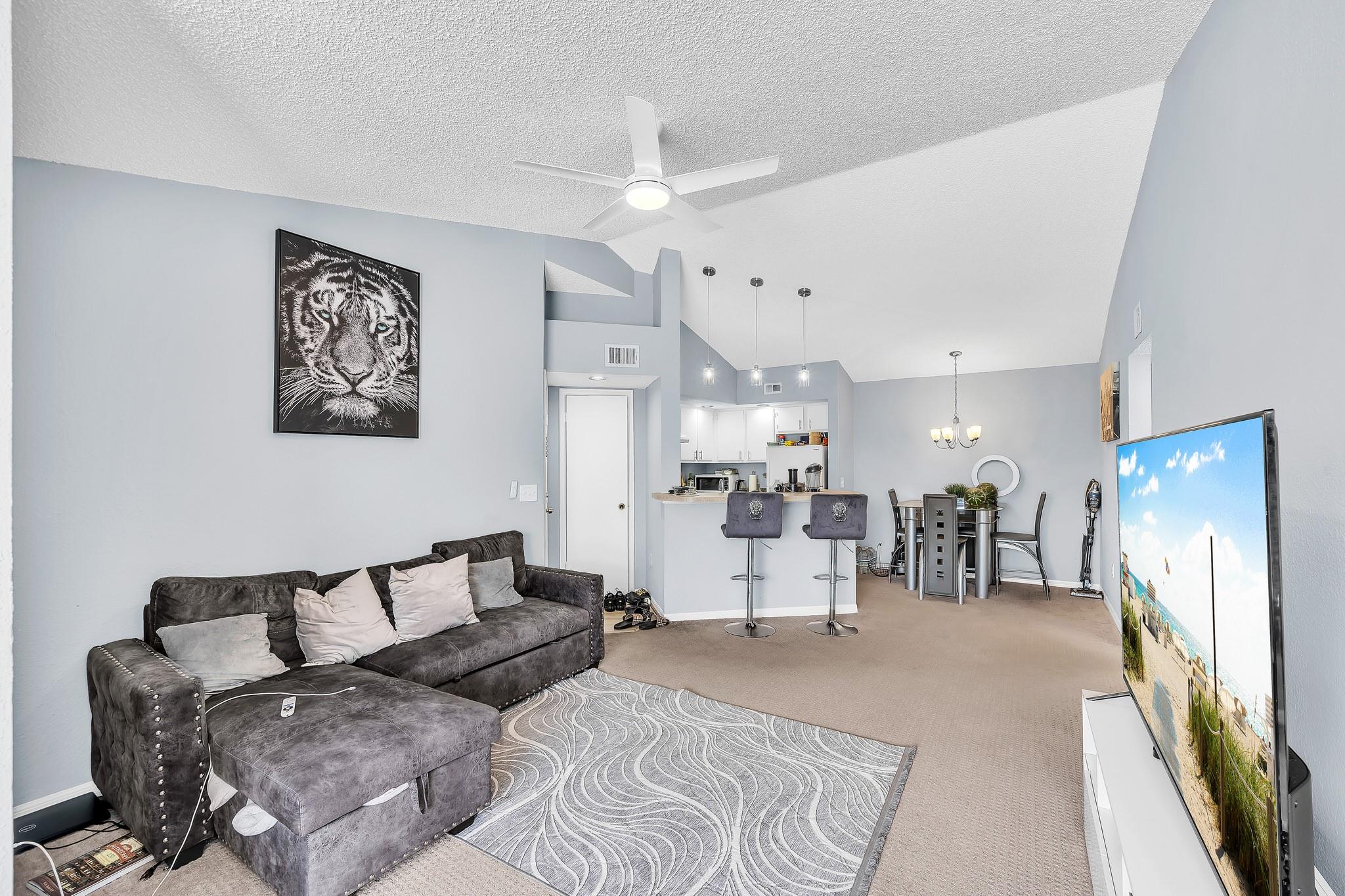 Beautiful 1 Bed 1 Bath condo with a open living-dining area with a bonus space for a small den or Office. Ceiling fans, central A/C, a spacious bathroom, and a walk-in closet. Washer and dryer are conveniently inside the apartment. Located in a peaceful spot, away from the parking lot. Enjoy all amenities including pools, a gym, and tennis courts. Located minutes from Palm Beach International Airport, Keiser University, Village Commons Shopping Center, Beach, CityPlace, restaurants, and more!