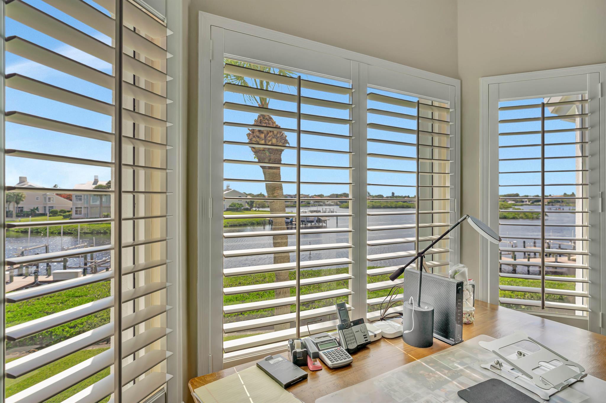 Come home to a beautifully renovated second-floor Harbor Home featuring bright southern exposure and wide water views! This residence offers impact windows, a private elevator, and elegant wood flooring. The custom kitchen showcases rich wood cabinetry, while the primary bath impresses with dual vanities, a freeform soaking tub, and shower. The guest bedroom includes a convenient king-sized Murphy bed, easily converting the space into a home office. Enjoy the screened lanai, perfect for lounging, reading, or savoring your morning coffee and meals al fresco while overlooking the tranquil waters. A boat lift and composite dock accommodate up to a 34-foot boat with ocean access. Ideally located on a quiet, tree-lined cul-de-sac on Spyglass Way, this home benefits from newly painted buildings