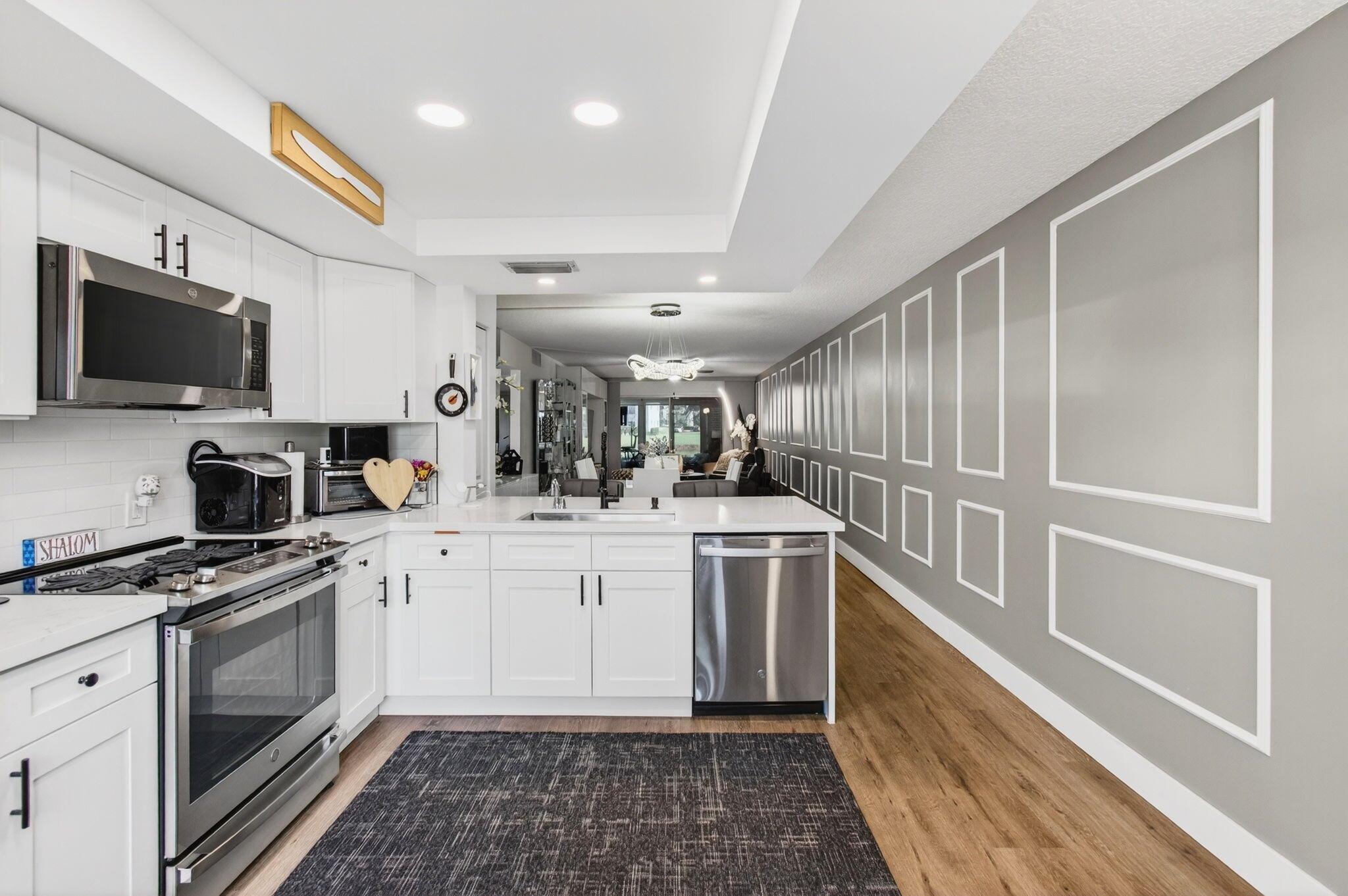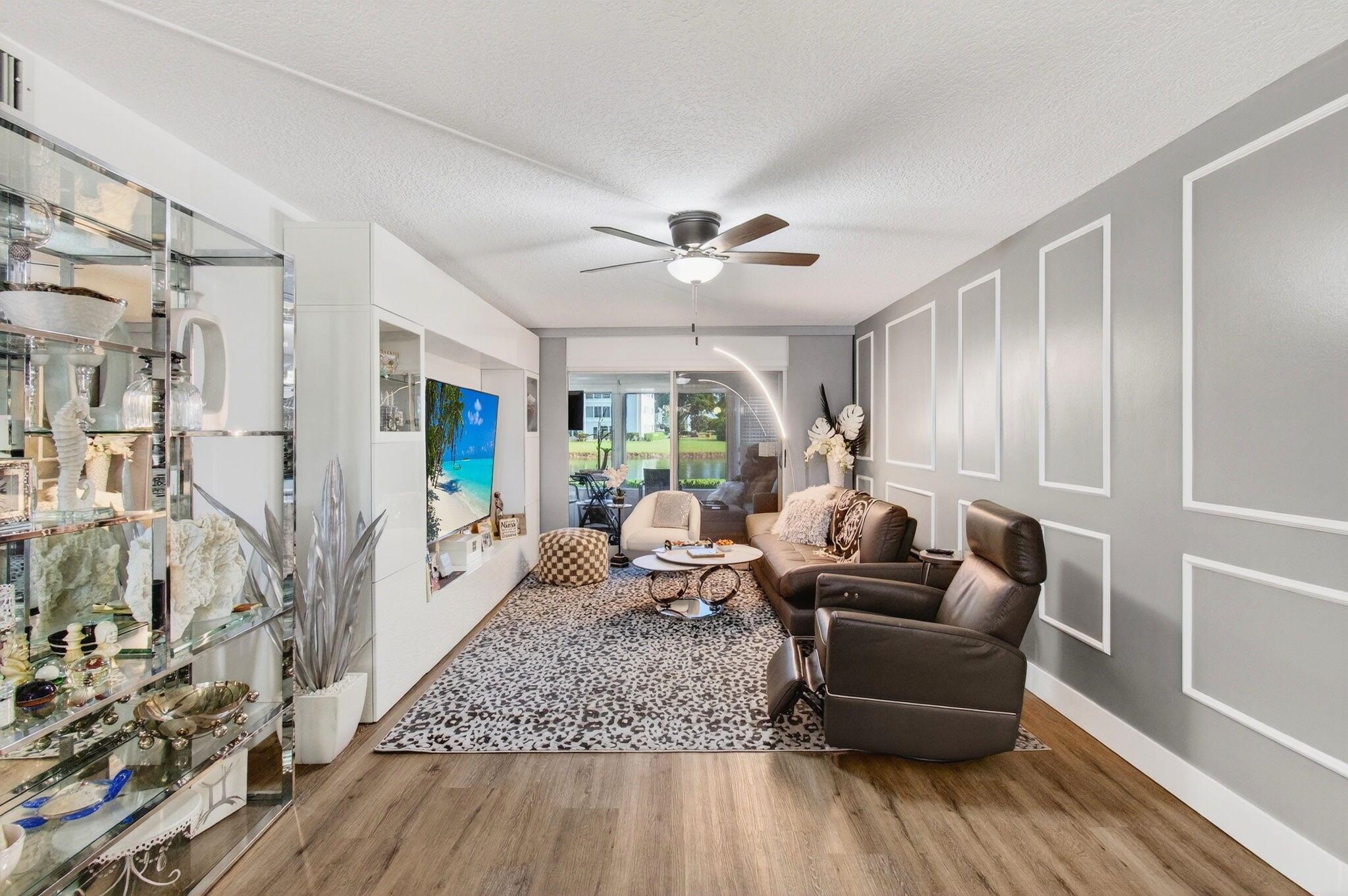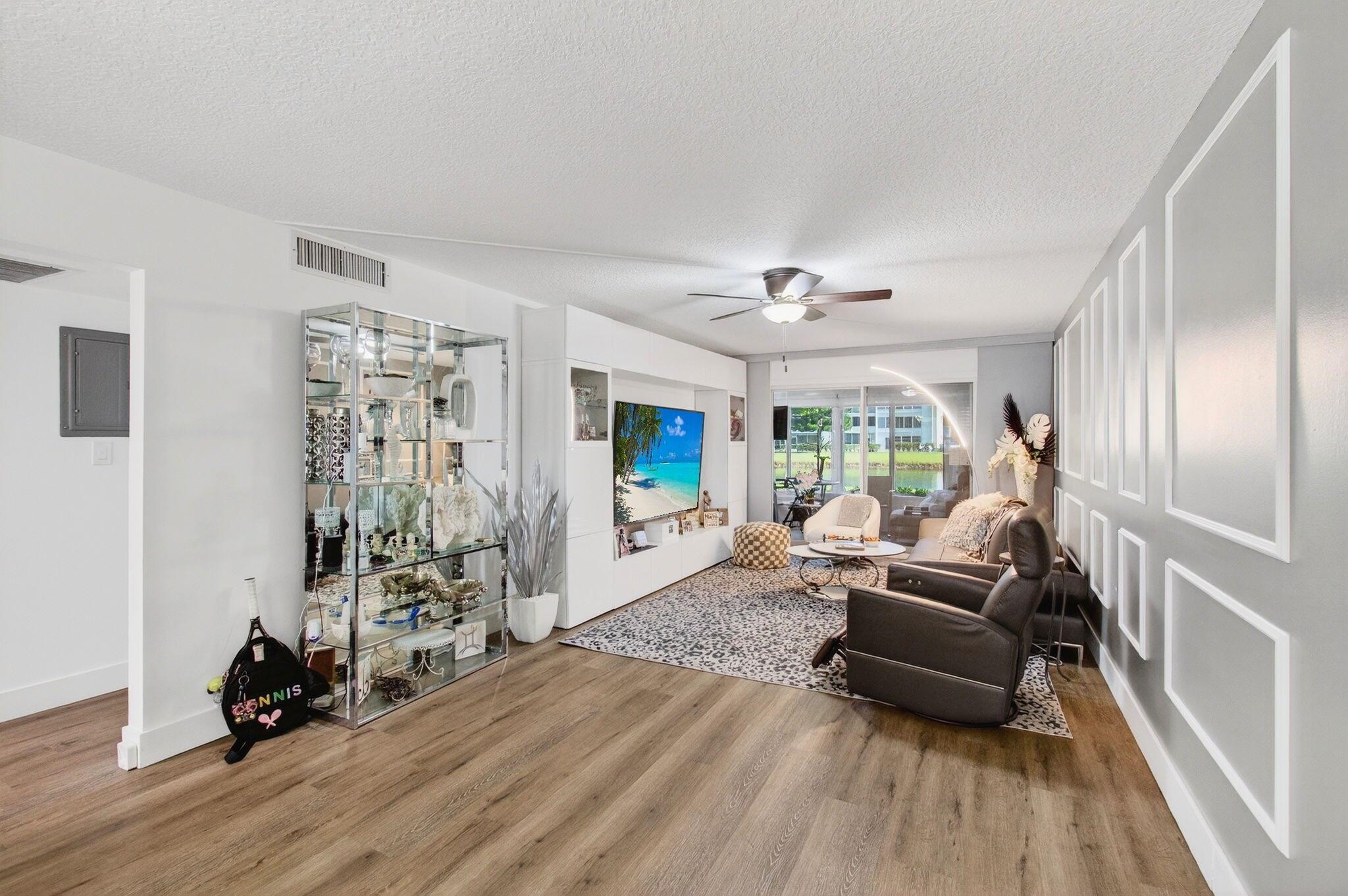 CENTURY VILLAGE, BOCA RATON--SUPER ACTIVE ADULT COMMUNITY.This stunning, fully renovated corner ground-floor condo captivates with its smooth ceilings and luxury vinyl flooring throughout. Key features include a knockdown ceiling, an updated electrical panel, and newer air conditioning and hot-water-heater systems. With impact windows, the condo ensures both safety and energy efficiency. The open-concept kitchen is a chef's dream, showcasing quartz countertops, soft-close kitchen cabinets, a beautiful farmhouse sink, stainless steel appliances, and a tray ceiling with recessed lighting. Convenient features like instant hot water and a water filtration system enhance the experience, along with ample storage space and an additional pantry.