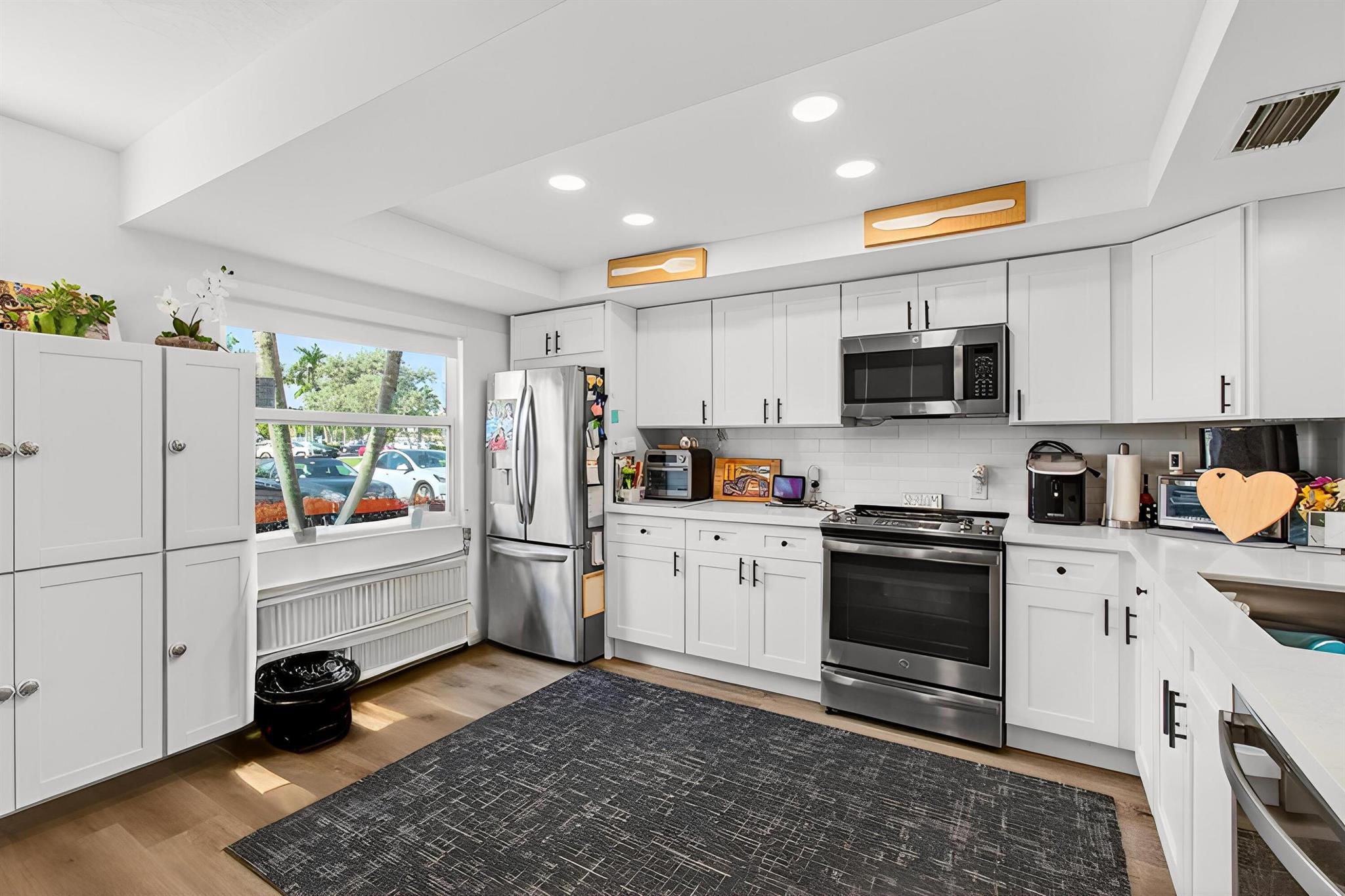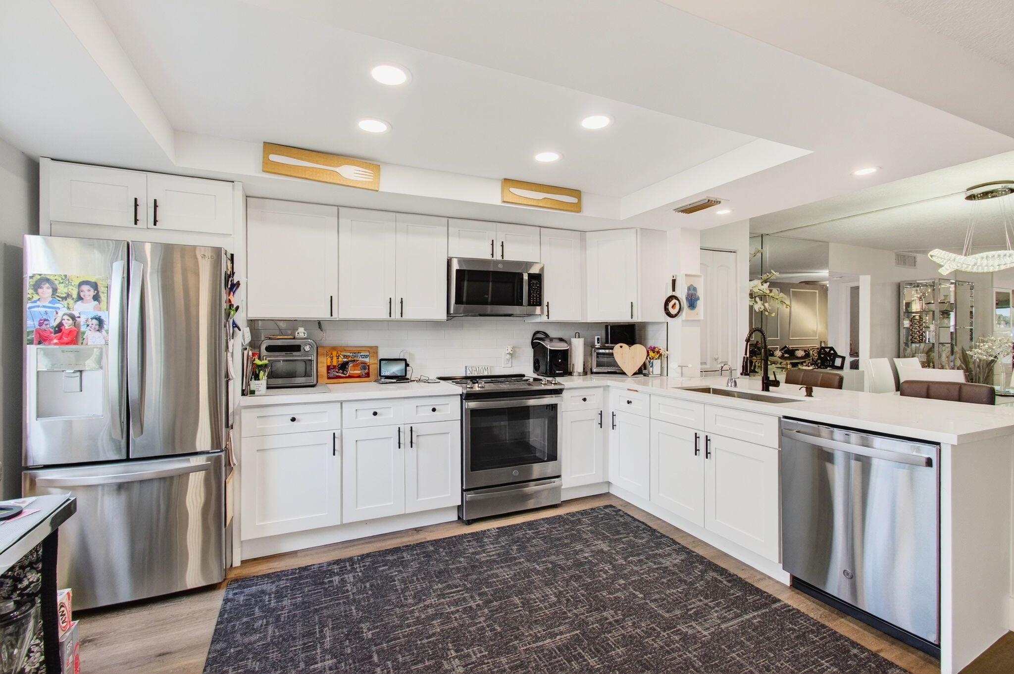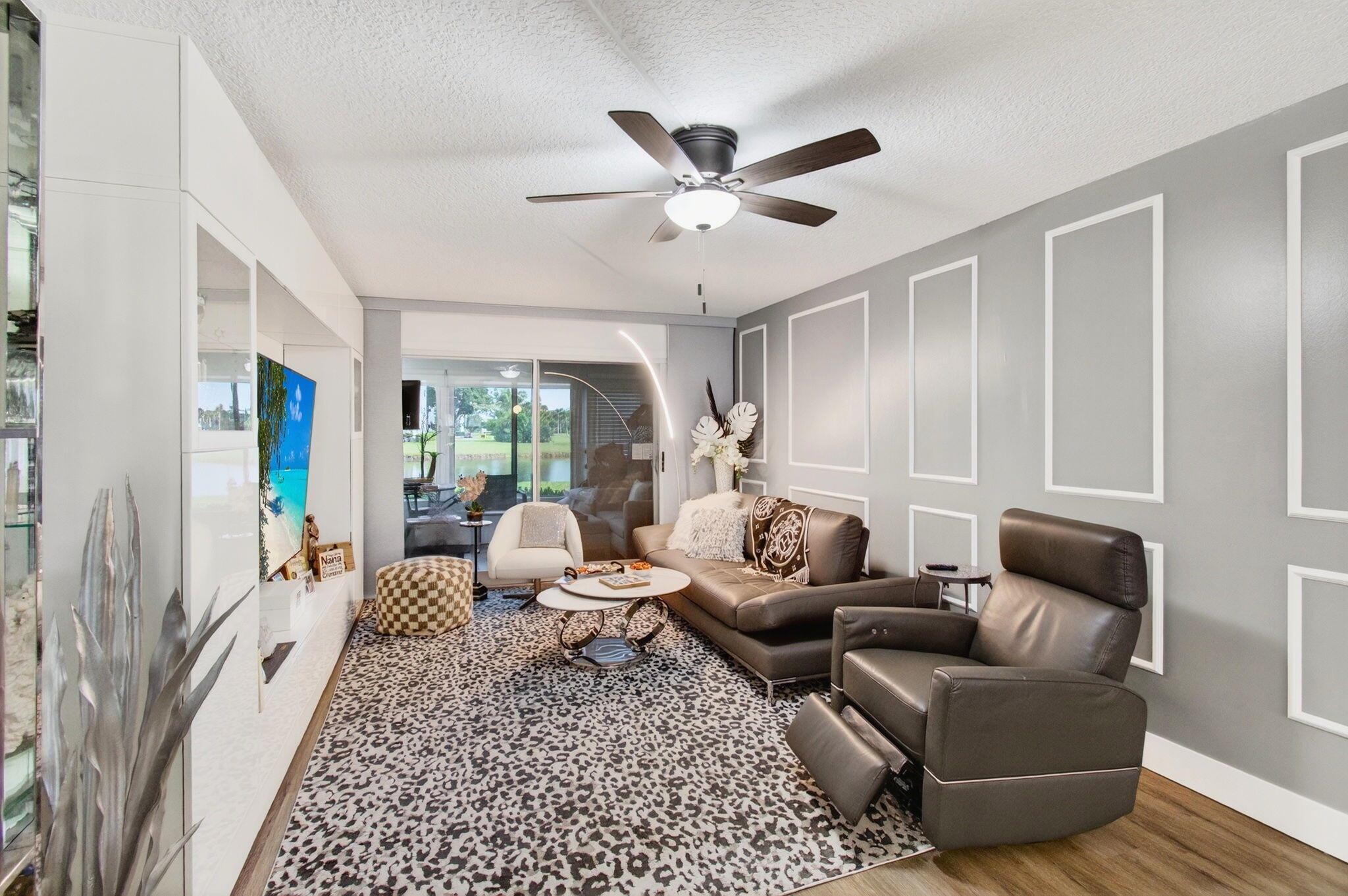 CENTURY VILLAGE, BOCA RATON--SUPER ACTIVE ADULT COMMUNITY.This stunning, fully renovated corner ground-floor condo captivates with its smooth ceilings and luxury vinyl flooring throughout. Key features include a knockdown ceiling, an updated electrical panel, and newer air conditioning and hot-water-heater systems. With impact windows, the condo ensures both safety and energy efficiency. The open-concept kitchen is a chef's dream, showcasing quartz countertops, soft-close kitchen cabinets, a beautiful farmhouse sink, stainless steel appliances, and a tray ceiling with recessed lighting. Convenient features like instant hot water and a water filtration system enhance the experience, along with ample storage space and an additional pantry.