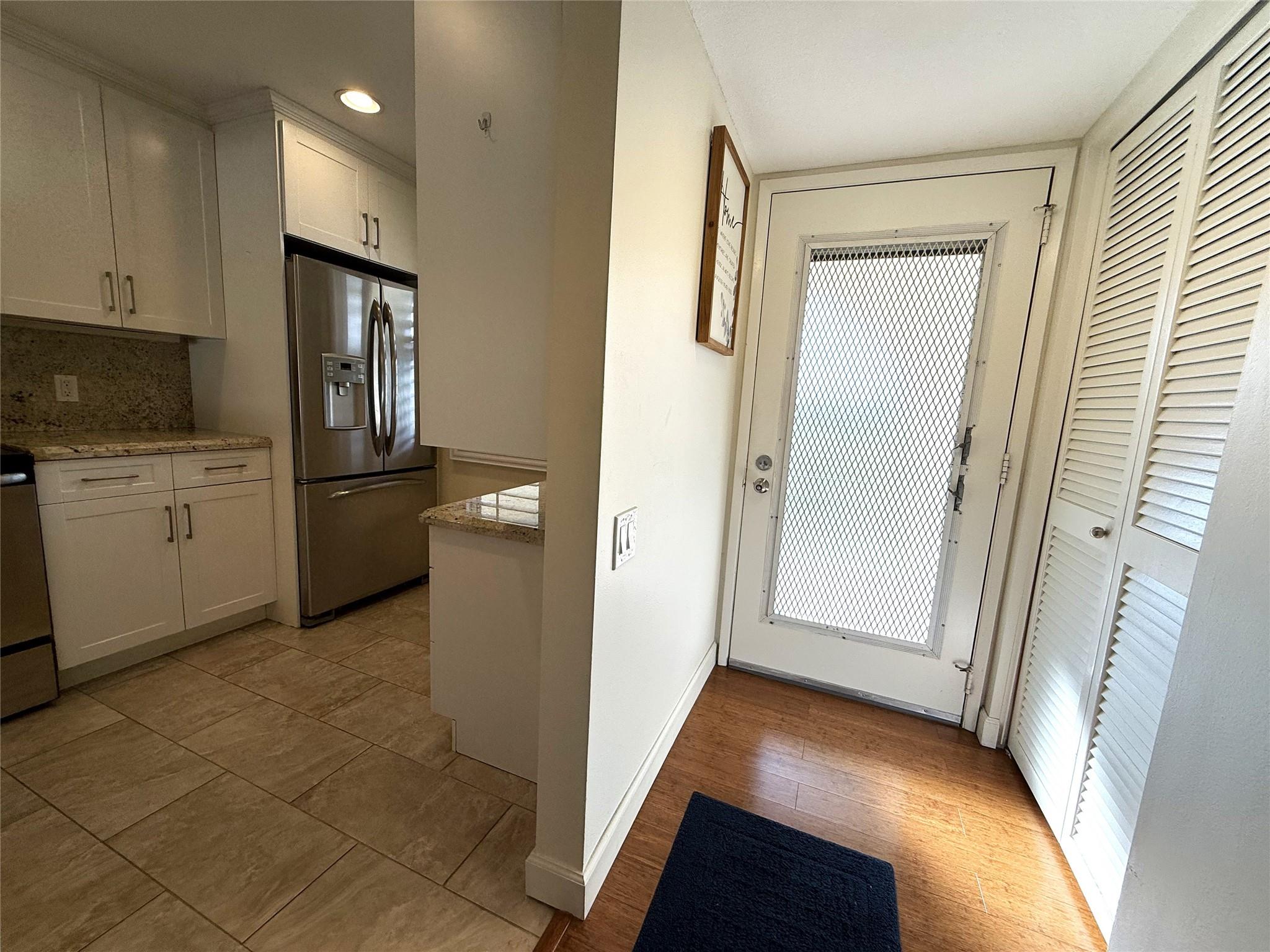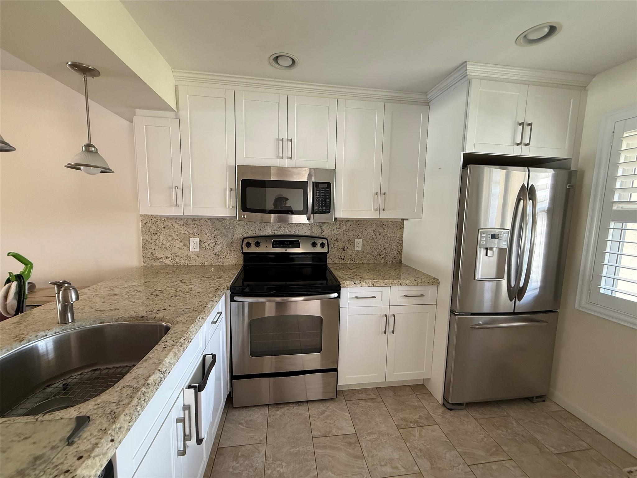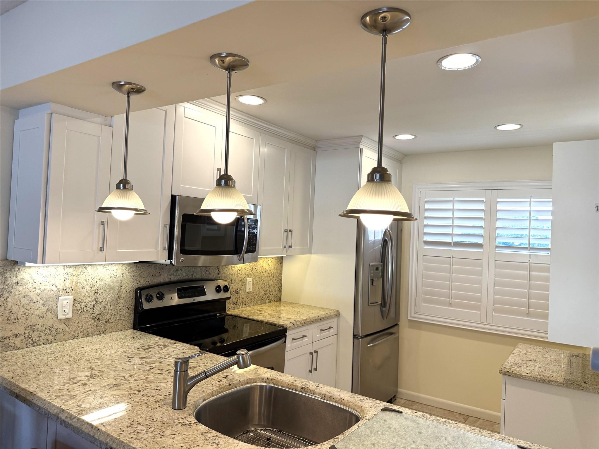 CORNER This property features all high-impact windows and a glass-enclosed patio that opens to the living area. Surrounded by water on every side, the patio faces east. The interior has been remodeled, with no carpet; laminate /vinyl flooring throughout. The kitchen and living room boast granite countertops and recessed lighting (hi-hats), SS Appliances, while all windows are fitted with plantation shutters. Be sure to see all the photos, then come see it for yourself!
