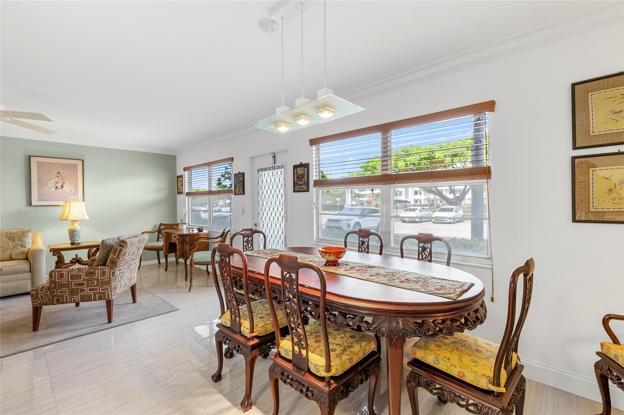 Immaculate and move-in ready first-floor condo offering 1,000 sq. ft. of bright and comfortable living space. This spacious unit features 2 bedrooms, 2 full bathrooms, and a generous sunroom that can also serve as an office. Beautiful, shiny tile flooring flows throughout the home. Being sold fully furnished — all furniture and paintings are included in the price. Parking #12 is conveniently located right in front of the building. Enjoy the lowest HOA fee in the Village at just $609. Electric Panel was replaced in 2024. Only 4 miles to the beach! Century Village offers exceptional amenities including free transportation to shopping plazas, tennis courts, pickleball, a Fitness Club with sauna, and both indoor and outdoor swimming pools. This beautiful and safe home is waiting for you!