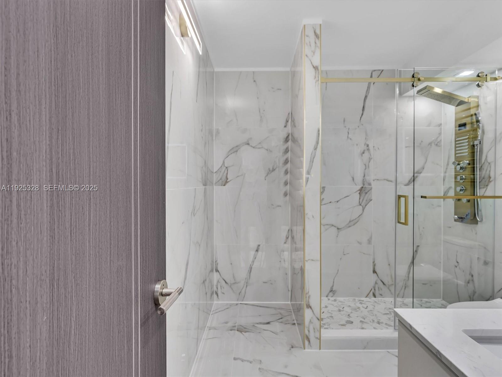 One-of-a-kind, spectacular luxury residence in the heart of Sunny Isles Beach. This brand-new, fully redesigned corner unit features the largest 2-bedroom, 2-bath floor plan in the entire Winston Towers community. Curated and rebuilt by a professional designer, the home showcases a flawless blend of modern elegance, exceptional craftsmanship, and smart-living upgrades. Premium Australian stone, hand-selected for this project, seamlessly integrates the floors and countertops and is accented with a refined gold inlay that ties beautifully into the two-tone hardware and designer accessories. The modern kitchen offers stainless steel smart appliances, generous counter space, and custom details ideal for both cooking and entertaining. Every closet and pantry is custom-built and fully air-conditioned, ensuring comfort and preserving stored items. Each room reflects meticulous design, balancing style, functionality, and long-lasting quality. This is the only building in Winston Towers that has completed both the 40-year and 50-year recertifications, offering exceptional structural confidence. A rare chance for the buyer to be the very first person to use every feature of this home—the stove, dishwasher, showers, fixtures, and all other brand-new elements. Enjoy resort-style living with a renovated pool and community amenities, just steps from the beach, restaurants, cafés, parks, shops, and top-rated schools. A fully reimagined residence designed to impress—a true masterpiece.