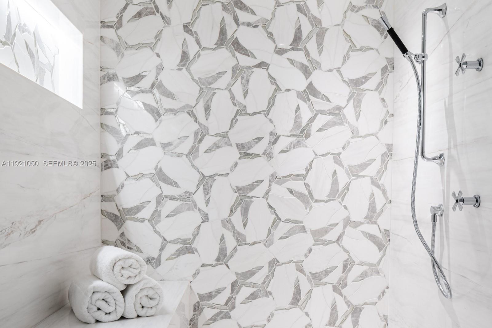 Stunning remodeled southeast corner 3-bedroom residence at MEi Miami Beach, showcasing over $1M in upgrades by designer Janet Patterson. The complete renovation features Nero Marquina marble floors, custom wood wall paneling and flush doors, a European hybrid kitchen with Miele appliances and recessed hood, and designer marble bathrooms. The primary suite includes a steam shower and Toto smart toilet. Additional enhancements include trimless recessed lighting, indirect LED cove lighting, motorized Lutron shades, custom closets with integrated lighting, soundproofing, a Control4 smart home system, new HVAC with linear diffusers, and a striking semi-precious crystal quartz backlit ledge. Floor-to-ceiling glass opens to an expansive wraparound terrace with spectacular ocean views. MEi offers resort-style amenities including beach and pool service, spa, fitness center, tea lounge, concierge, and valet.