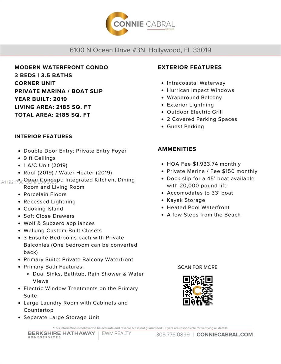 WELCOME TO THE ULTRA EXCLUSIVE SEASIDE VILLAGE COMMUNITY IN HOLLYWOOD DIRECTLY ACROSS FROM THE BEACH. THIS IS TRULY A BOATER'S DREAM! STEP INSIDE THIS ABSOLUTELY FLAWLESS LUXURY CONDO SITUATED ON THE INTERCOASTAL WATERWAY WITH PRIVATE MARINA AND DOCK SLIP. IMAGINE LIVING ON THE WATER IN A MODERN NEWER BUILT BOUTIQUE BUILDING, COMPOSED OF ONLY 5 RESIDENCES IN EACH BUILDING. THIS RESIDENCE WILL GIVE YOU THE FEEL OF A SINGLE-FAMILY HOME STARTING WITH YOUR PRIVATE ELEVATOR ENTRY INTO THE UNIT, GRAND OPEN CONCEPT AND ENDLESS STORAGE THAT YOU WOULD ONLY FIND IN A HOME. IMAGINE UNOBSTRUCTED WATERVIEWS INCLUDING SUNSET VIEWS FROM YOUR WRAPAROUND BALCONY. EVERY BEDROOM ENCOMPASSES AN EN-SUITE BATHROOM IN ADDITION TO PRIVATE BALCONY, CHEF’S KITCHEN WITH SUBZERO & WOLF APPLIANCES, FULL LAUNDRY ROOM, LARGE STORAGE UNIT, HURRICANE IMPACT WINDOWS AND 2 COVERED PARKING SPACES IN ADDITION TO GUEST PARKING. AMENITIES INCLUDE A MARINA THAT IS FULLY EQUIPPED WITH WATER & ELECTRICITY, BOAT SLIP ACCOMMODATES A 45’ BOAT HOWEVER WITH CURRENT LIFT A 33’ BOAT. CENTRALLY LOCATED BETWEEN MIAMI AND FORT LAUDERDALE. FTL INTERNATIONAL AIRPORT IS LESS THAN 10 MINUTES AWAY . A MODERN MASTERPIECE COMBINING LUXURY, EXCLUSIVITY COMBINED WITH PRIVACY ! CALL LISTING AGENT PRIOR TO SUBMITTING REQUEST