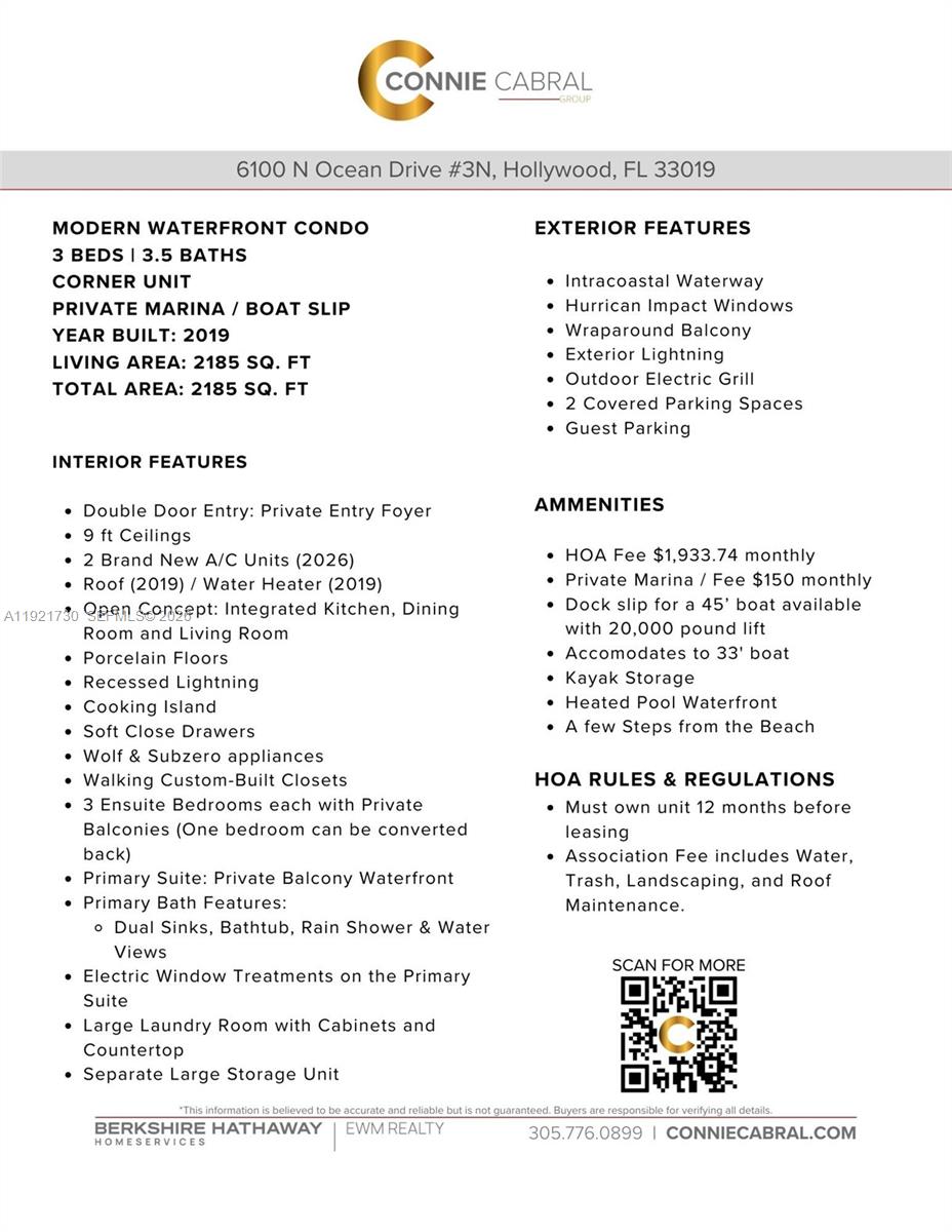Rare opportunity, new costruction on the beach that does not exist anywhere in Hollywood! Welcome to Seaside Village, an ultra-exclusive luxury boutique community in Hollywood Beach offering true elevated waterfront living. This modern 3BR, 3.5BA condo includes a private boat slip, accommodates a 45’ vessel, and sits directly on the Intracoastal Waterway, just steps from the beach. Enjoy private elevator entry, expansive open layout, wraparound balcony with sunset views, chef’s kitchen with Sub-Zero & Wolf appliances, full laundry room, and hurricane impact windows. Each bedroom has an en-suite bath and private balcony. Includes 2 covered parking spaces, guest parking, and a large storage unit. The gated community features a fully equipped marina with water/electric. No rental restrictions. Centrally located between Miami & Fort Lauderdale, just minutes to FTL Airport. Boat slip may be rented or sold to another homeowner, offering added flexibility and value. Approximate slip value is $250,000. Perfect for boating enthusiasts seeking convenient water access and premium waterfront living.