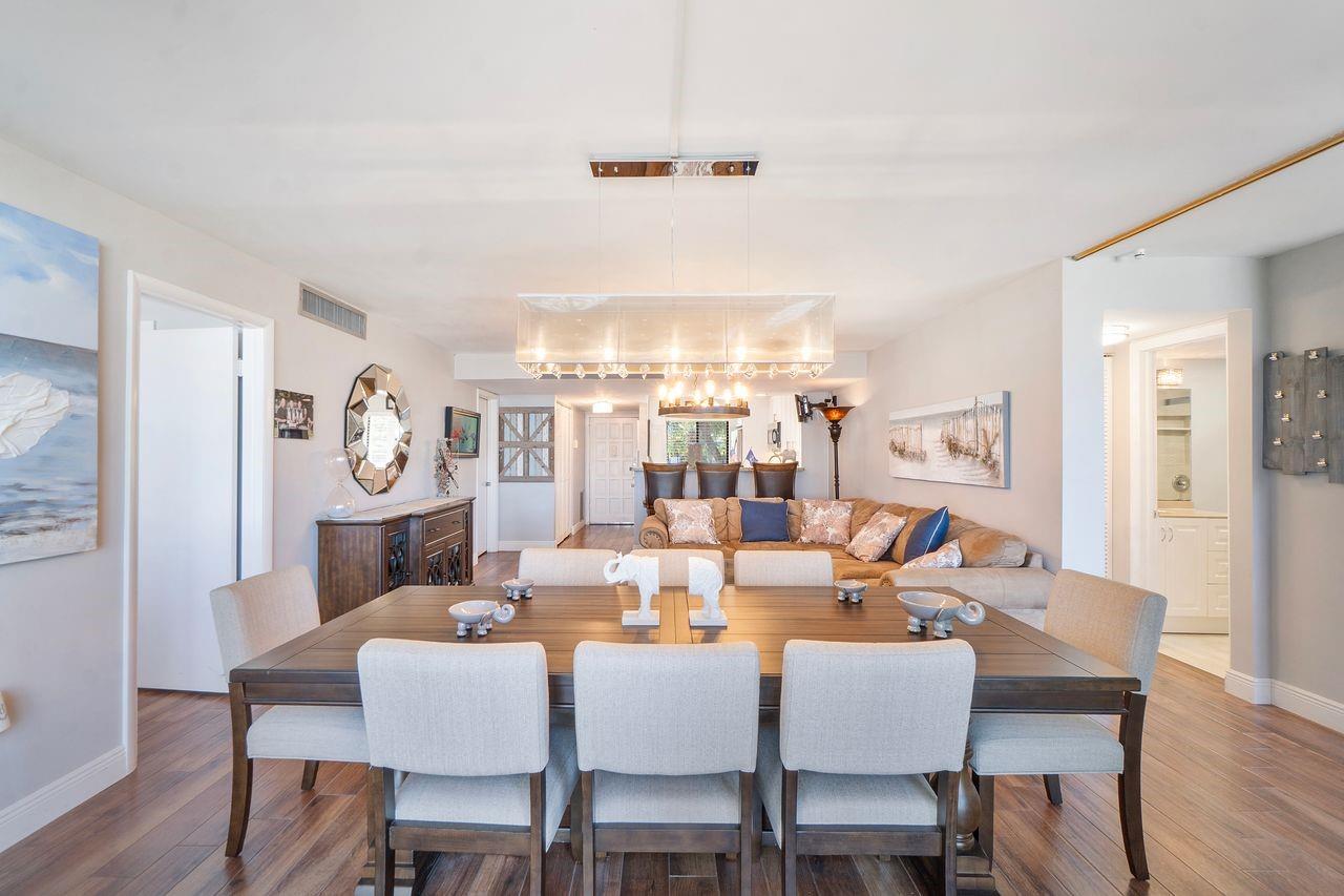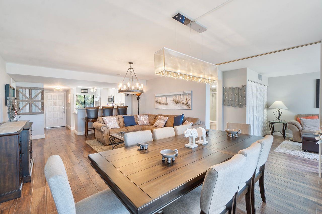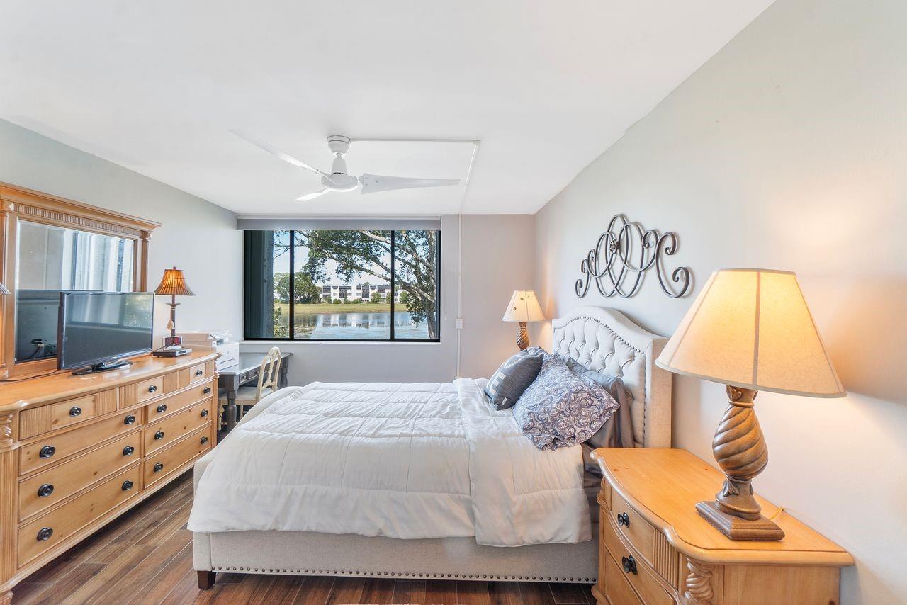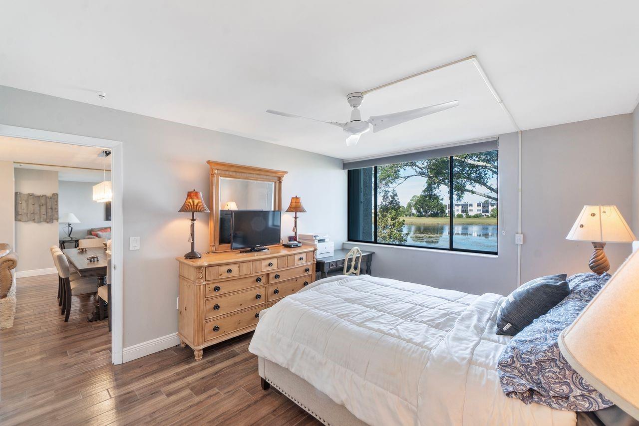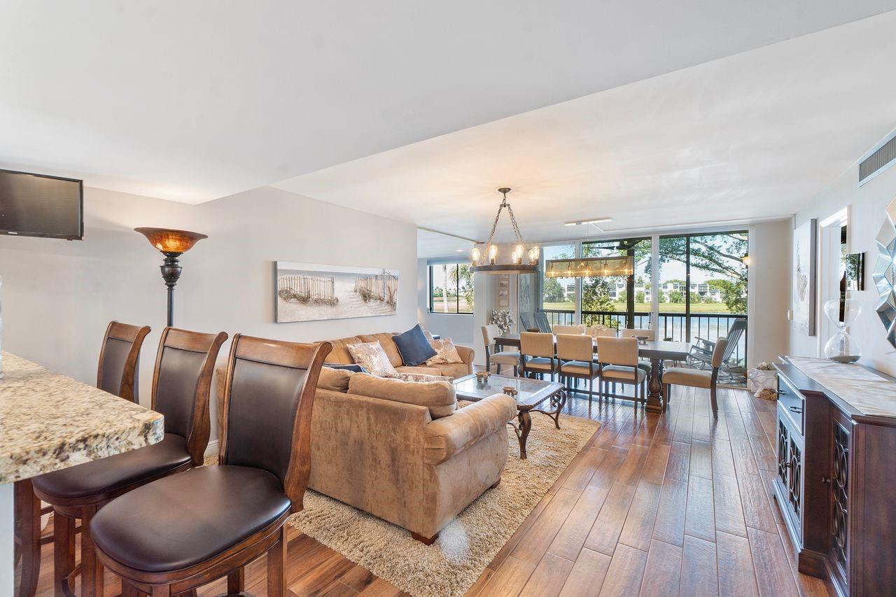 Stunning remodeled 3 bedroom 2 bathroom condo with breathtaking panoramic lake and golf course views—the best in the community! Enjoy water and golf views from every room and window. This immaculate one level condo features tile-wood floors throughout, soft-close cabinets, new modern LED recessed lighting, upgraded kitchen and baths, accordion shutters, and an in-unit washer/dryer. Relax on the private patio overlooking the water. 24-hour manned gate. Community offers 3 championship golf courses, tennis courts, dining restaurants, and a fitness center. Top-notch upgrades throughout—this is an absolute must-see!