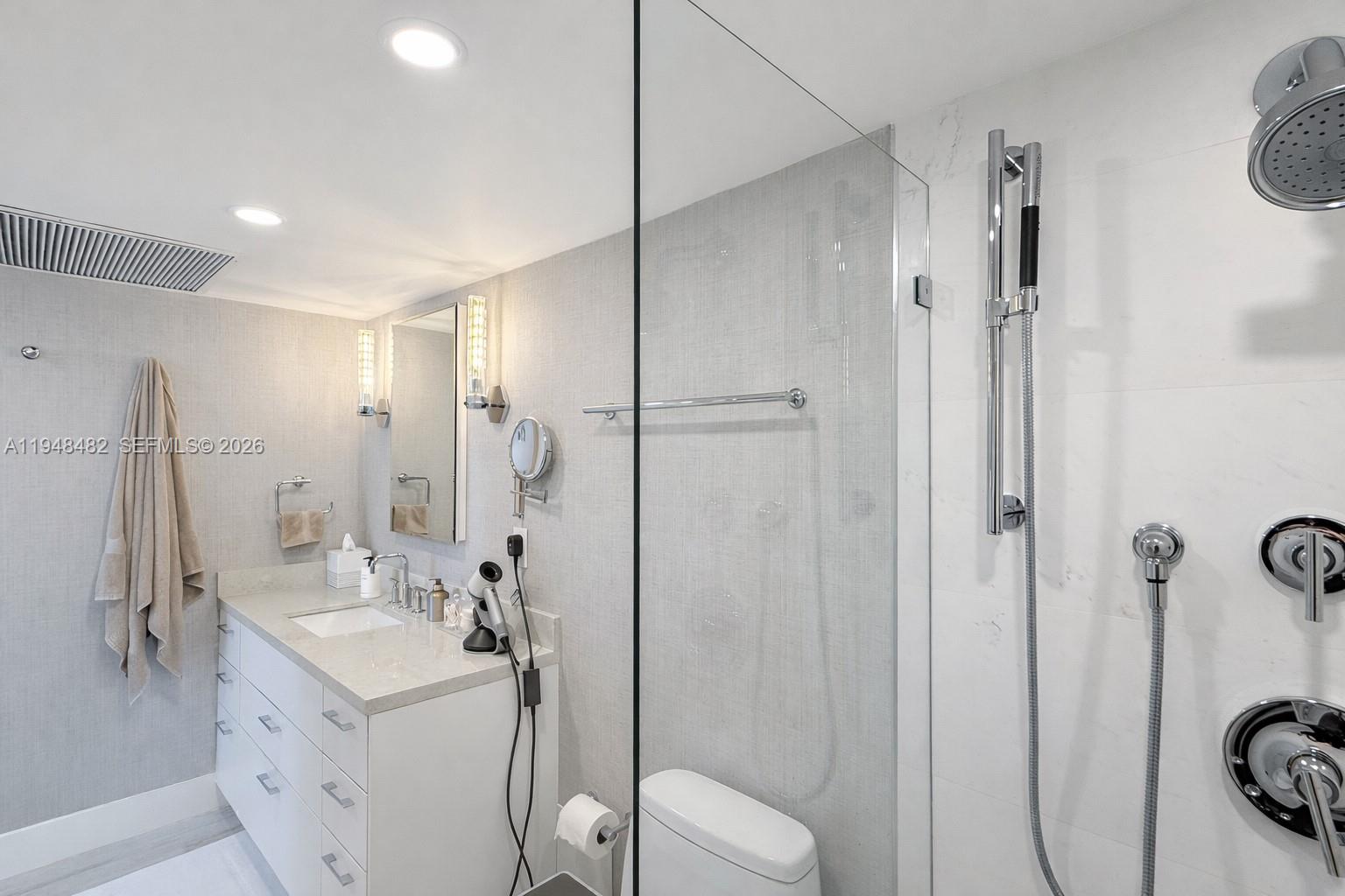 MOTIVATED SELLER: This south-facing, oceanfront residence, is truly move-in ready. Unit has been completely gut renovated & redesigned w/ the highest-quality finishes & a sophisticated, on-trend aesthetic & smart home full functionality w/ RH lighting & Kohler fixtures. 2 true bdrms, split-floorplan layout, ea. w/ its own ensuite bathroom & custom California closets. The primary is exceptionally appointed, w/ 2 walk-in closets. South exposure provides abundant natural light all day. The kitchen is designed for both functionality & style, equipped w/ high-end KitchenAid SS appliances, including a gas range, perfect for the serious home chef. Enjoy ocean vws from your glass enclosed balcony. W/D may be added to the unit, but laundry room/storage is directly across the hall. (owner has an additional storage ROOM at $1500/yr). An iconic Morris Lapidus–designed building, the property has been fully brought up to current inspection and SIRS standards. No lease 1sr yr. owned. Min lease term of 3 months, 1x/year. Amenities include 24-hour security, valet service, fitness center, pool, sauna, whirlpool, & an on-site convenience store.