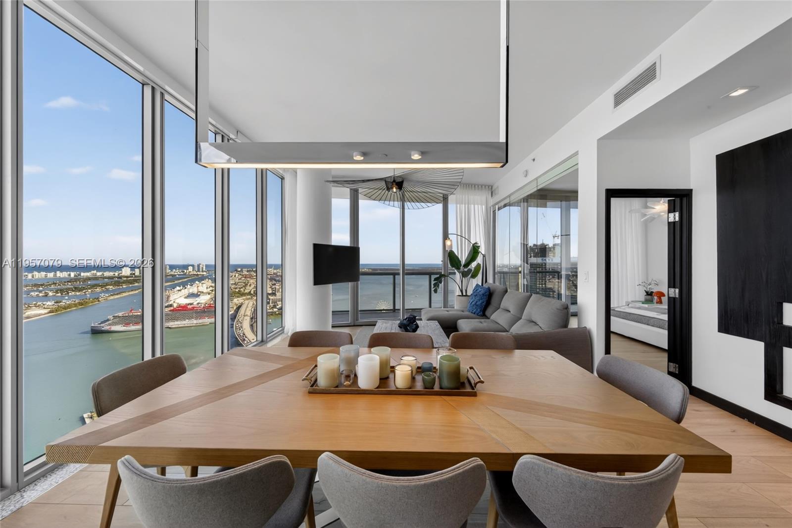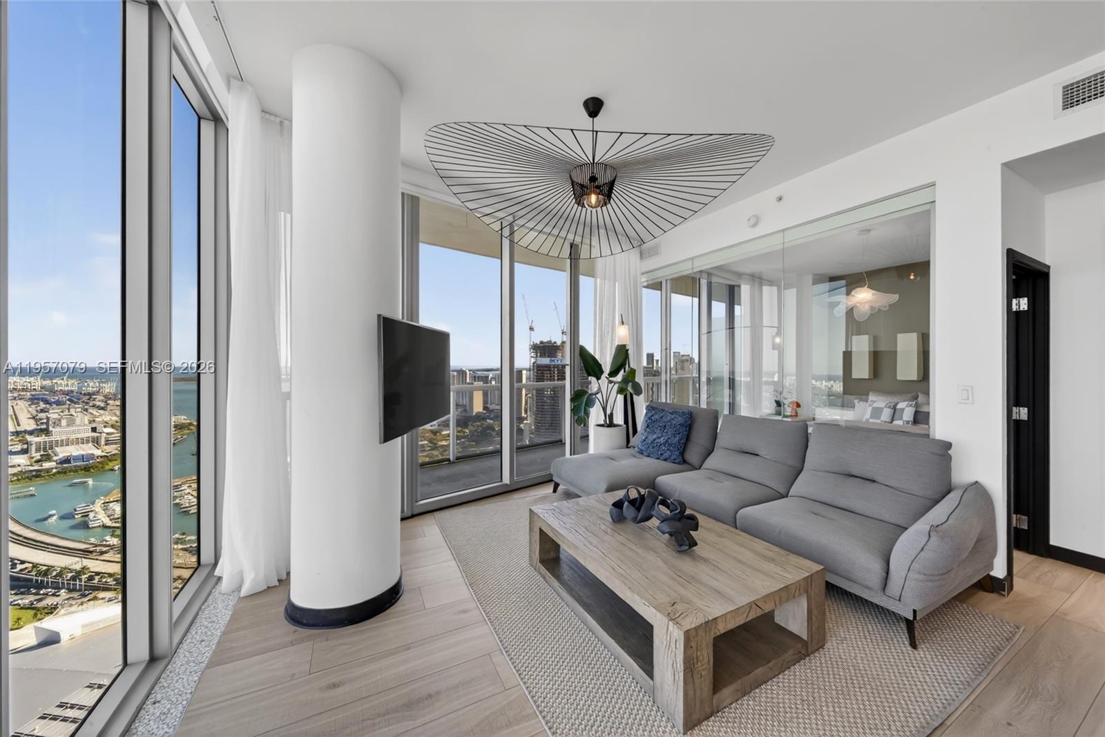 Experience Marina Blue’s coveted 08 line, known for its sweeping, unobstructed views spanning Sunny Isles, Miami Beach, Key Biscayne, Edgewater, Brickell, and Downtown Miami. One of only three residences crowning the building’s uppermost waterfront tier, this high-floor home offers a rare panoramic vantage point seldom available. Featuring 10-foot ceilings, the residence has been thoughtfully updated with brand new flooring and a refined floor plan designed to enhance the living area and fully capture its panoramic exposure. The home offers 2 bedrooms, 2 baths, floor-to-ceiling glass, electric blackout shades, in-unit washer and dryer, and stunning water and skyline views from every room. An additional west-facing balcony provides sunset and city light views. Ideally located across from Kaseya Center and one block from Miami Worldcenter, dining, shopping, and the Apple Store. Marina Blue offers resort-style pools, fitness center, business center, jacuzzi, BBQ areas, mini market, and CVS on site. A limited opportunity for the next fortunate owner at the architectural apex of the 08 line.