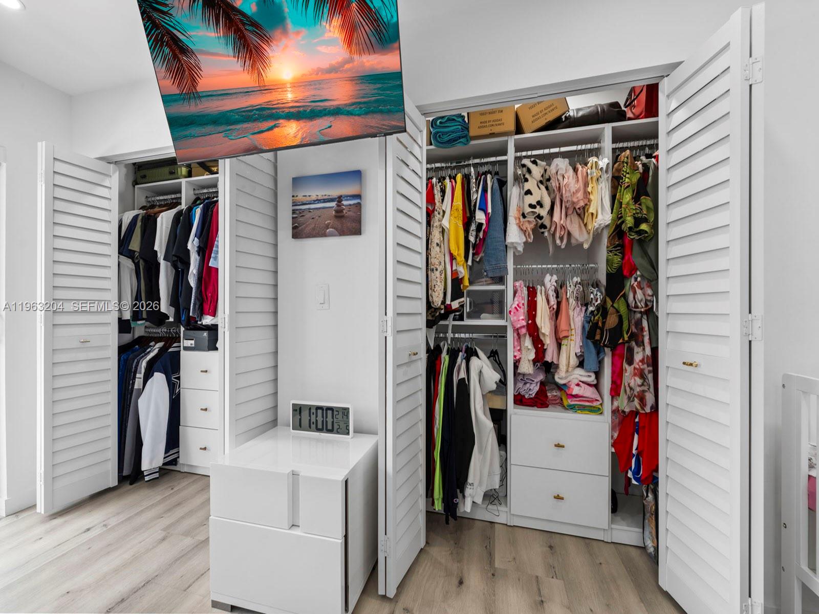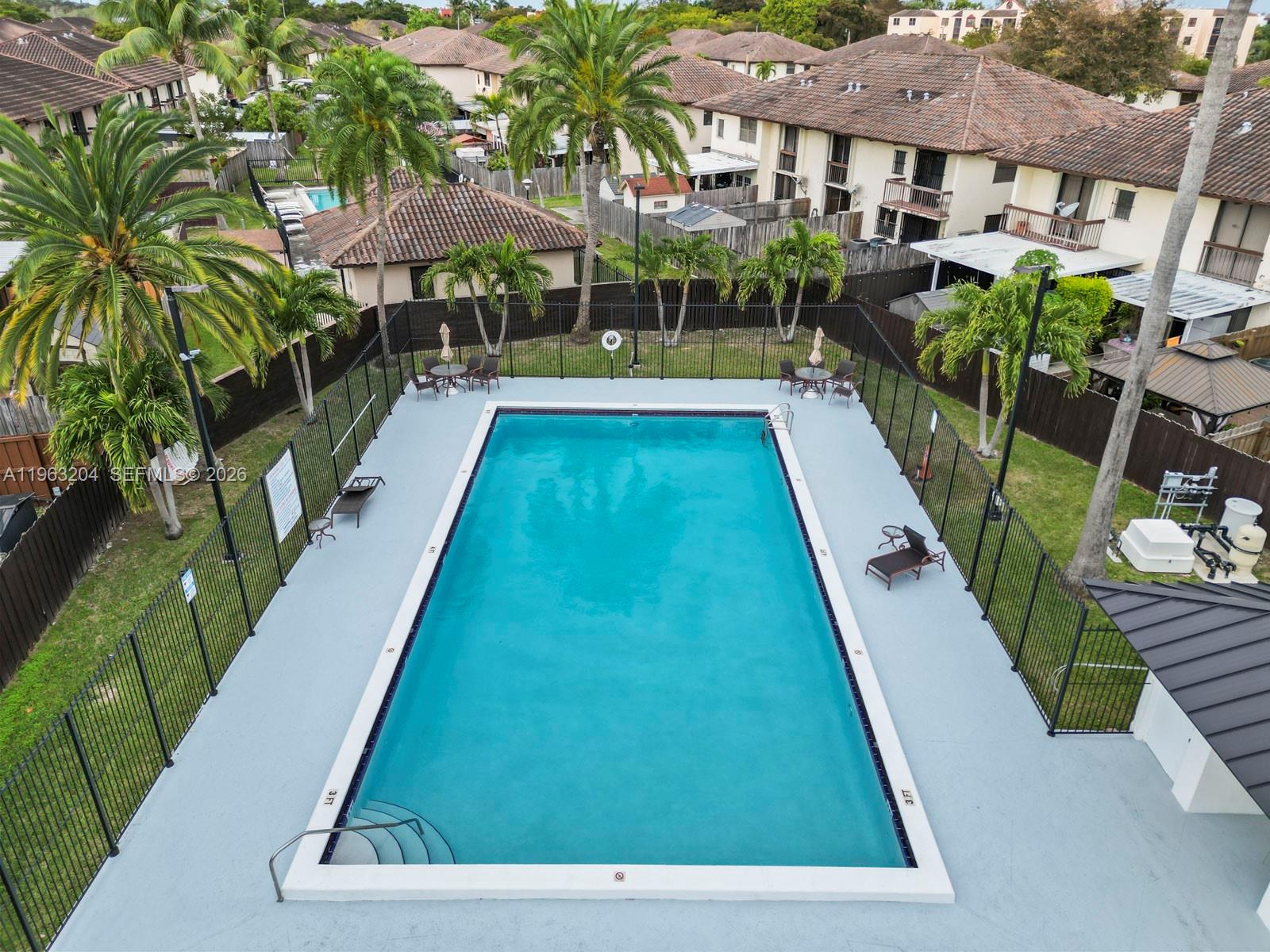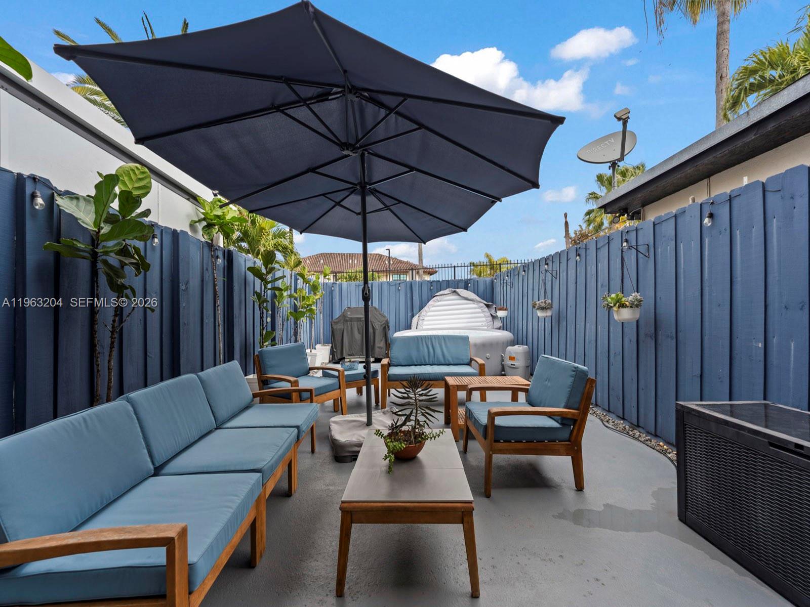Welcome to this rare, design-forward, completely turnkey home that stands out from anything else currently available in the community, this is not your average home. Fully remodeled inside & out, featuring new floors, ceilings, walls, recessed lighting throughout & impact windows & doors. The open-concept downstairs offers a bright, modern layout ideal for entertaining and everyday living. Major systems have been upgraded, including a tankless water heater,3-ton A/C (2023), all-PVC plumbing, and a Google Nest thermostat. The home also includes an LG Touch stacked washer and dryer. Both bedrooms feature private en-suite bathrooms, with an additional half bath downstairs. Each bedroom closet is custom built-in furniture, complemented by custom carpentry throughout the home. The primary suite offers a spa-like experience with a double rainfall shower and blackout blinds. Enjoy a private backyard with a spa/hot tub, perfect for relaxing or entertaining. The front entry has been upgraded with modern exterior tile flooring creating strong curb appeal and welcoming feel. The property offers a private outdoor space & multiple homes within the community have expanded or reconfigured their layouts, making this home especially attractive for buyers seeking long-term flexibility. Additional features include, zebra blinds throughout, new PVC closet doors, direct parking & ample guest parking throughout the community along with a pool & security.A true gem,hurry it will not last