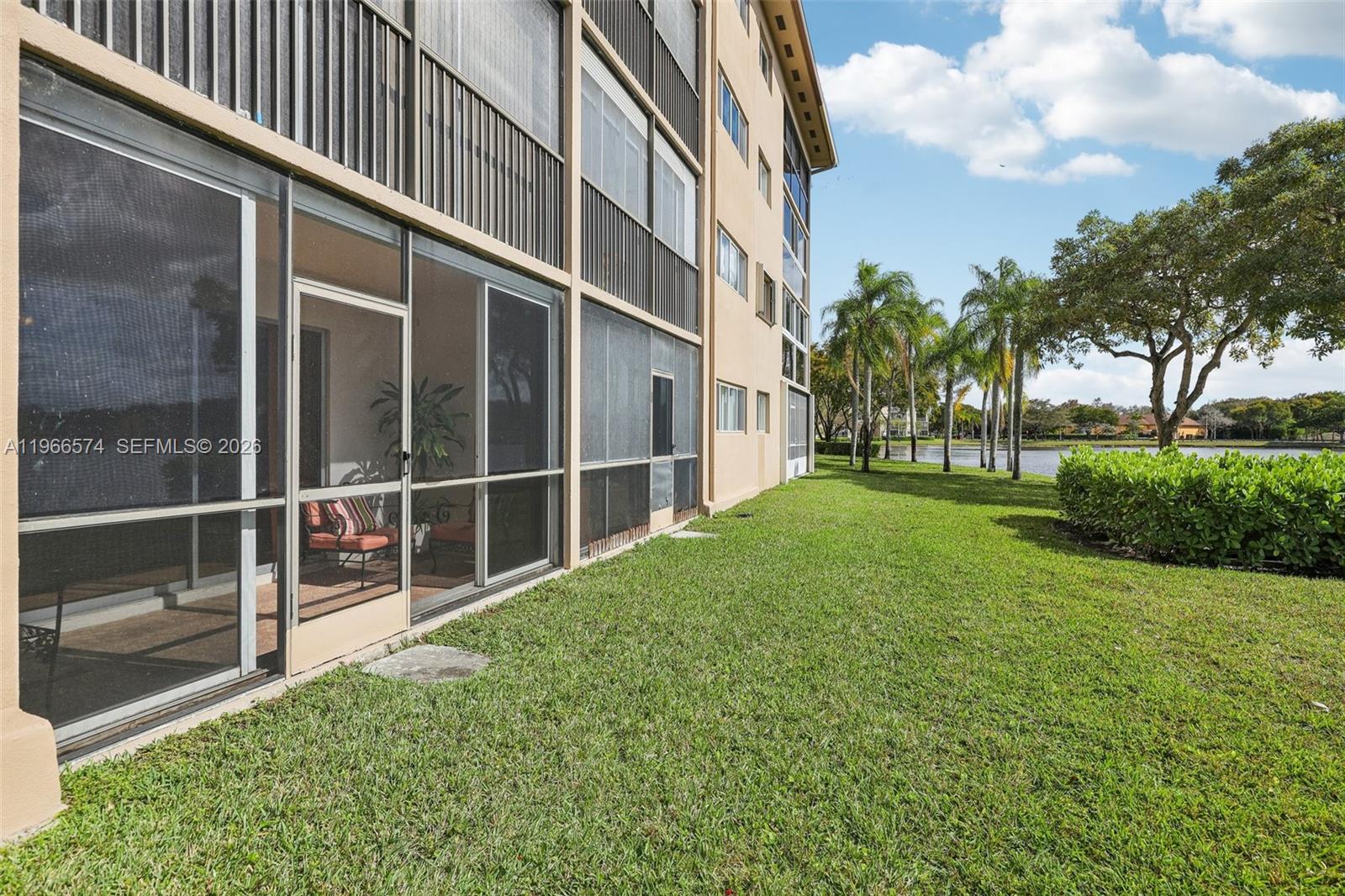 Welcome to this beautifully maintained 2-bedroom, 2-bathroom WATERFRONT condo located in the desirable 55+ active adult community of Century Village. This first floor residence, features neutral, warm tones throughout with an upgraded kitchen offering stylish cabinetry, ample storage, and serene lake views right from your window. The spacious primary suite includes a private and well maintained bath as well as generous closet space, while the second bedroom and full bath provide comfort for guests or a home office. Enjoy your morning coffee or evening unwind in the sliding glass–enclosed patio overlooking expansive water views — a peaceful retreat you’ll appreciate year-round. Additional highlights include washer and dryer in the home, 1 assigned parking space conveniently located right out front and move-in ready condition. Maintenance includes, Wi-Fi, cable, water, building insurance, common areas and more! Community amenities include a grand clubhouse, pools, fitness center, tennis, pickleball, complimentary bus service, on site medical center, social activities and more — offering an active and engaging lifestyle with opportunities to connect and enjoy every day. Experience relaxed waterfront living in a welcoming 55+ community — schedule your showing today!