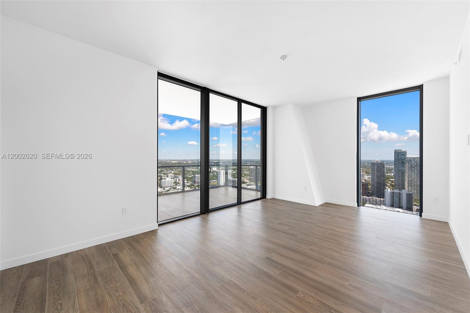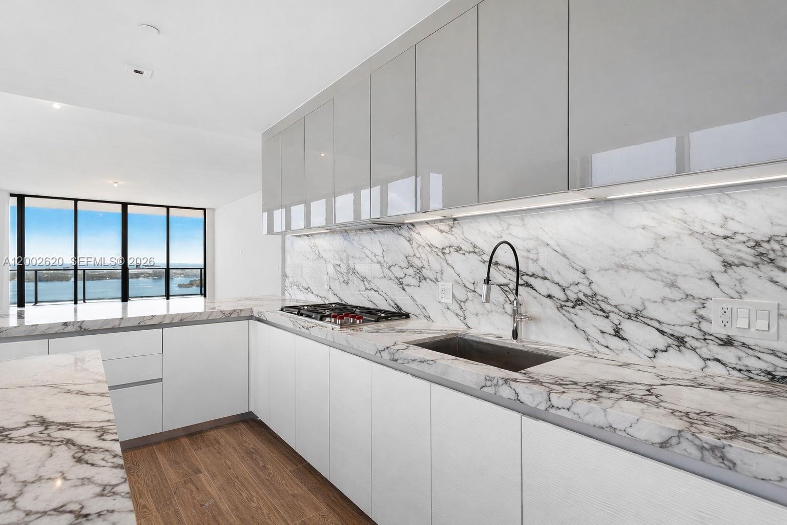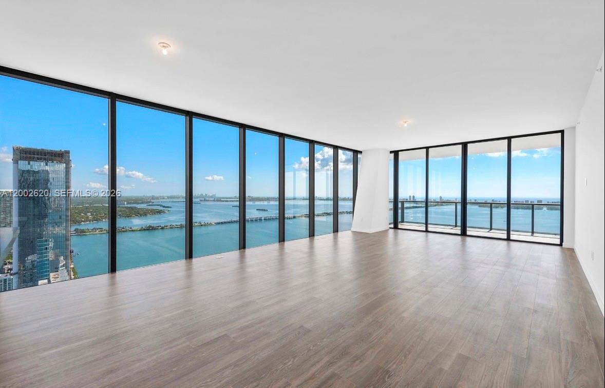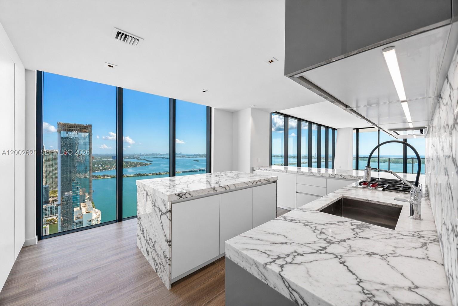 Located on the 48th floor of Elysee, this flow-through residence enjoys panoramic views from sunrise to sunset. Floor-to-ceiling glass and an east-to-west layout create a light-filled interior with open sightlines throughout. The living room, kitchen, primary bedroom and east-facing terrace overlook Biscayne Bay and the Miami Beach skyline, while the west-facing terrace offers expansive sunset and city views. The residence is accessed via a private elevator and foyer and features 4 bedrooms, 4.5 bathrooms, and a spacious den. The primary suite includes floor-to-ceiling windows, a spa-style bathroom with a large soaking tub, custom marble shower, and an oversized walk-in closet by California Closets. The kitchen is thoughtfully designed for both daily use and entertaining, featuring Italkraft cabinetry, Wolf and Sub-Zero appliances, and a gas cooktop. Well-proportioned living spaces and refined finishes provide comfort, functionality, and flexibility. Building amenities include sunrise and sunset pools, a state-of-the-art fitness center, a private owner’s lounge on the 30th floor, a children’s playroom, valet service, and 24-hour concierge. Offering privacy, generous living space, and full-service amenities, this residence is ideally positioned in one of Edgewater’s premier waterfront buildings.