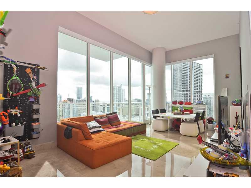 Miami's Urban Sanctuary!Impressive designer 4/4.5 w/smart technology. Private elevator to corner residence w/180 degrees of breathtaking water & city views. 12' ceiling, ledger stone foyer, flr to ceiling windows w/elec blinds. Marble flrs, top of line gr anite gourmet kitchen w/wine cooler, cappuc machine, walk-in custom closet. 3 pkg spaces, WiFi & same flr storage rm. Tennis, fitness cntr, resistance pools, racquetball. Island w/marketplace, bank, cleaners & playground.State of art bldg w/123 residences