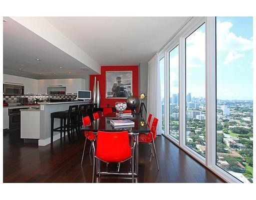 Breathtaking views of Miami Bay and Miami Skyline, from every room in this amazing two story corner penthouse that features floor to ceiling high impact glass walls (up to 22 feet in height); 3/3.5. Former famous clothing designer's unit. Custom furniture . Comes completely furnished and finished.