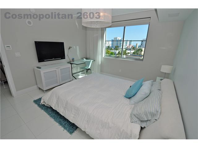 Totally upgraded designer unit at The Cosmopolitan. Fully furnished, this turn-key unit features ocean views, & is completely upgraded w/ top-of-the-line finishes, such as 18x18 white quartz floors throughout, A/V surround system, recessed lighting, new bathrooms, frosted glass doors, window treatments, custom closets & more. The Cosmopolitan is a full service building, offering pool, spa, gym, valet, besides the convenient location on South of Fifth, 2 blocks from the ocean and steps from restaurants.