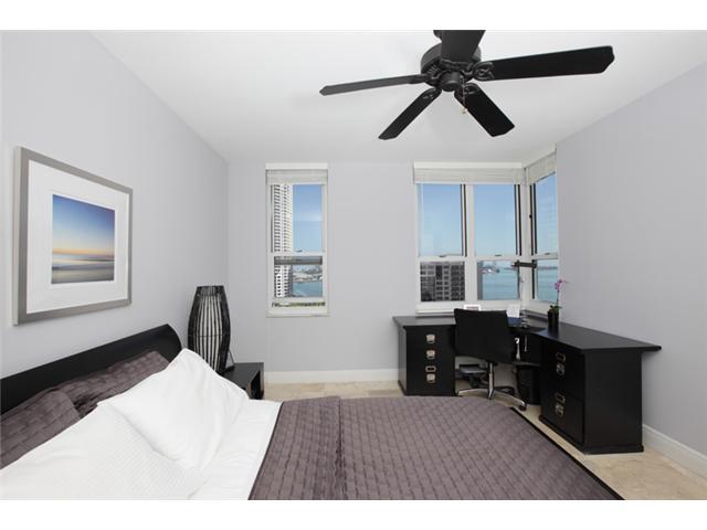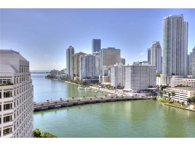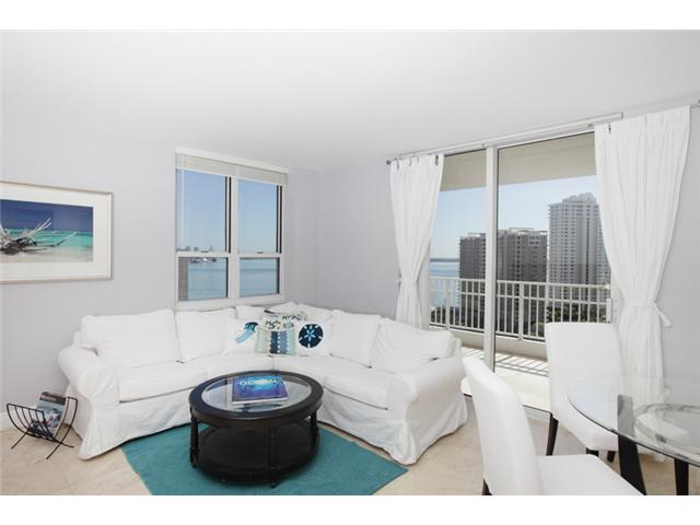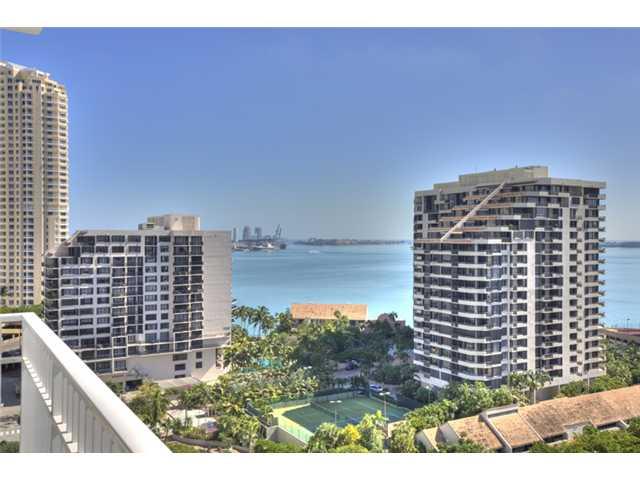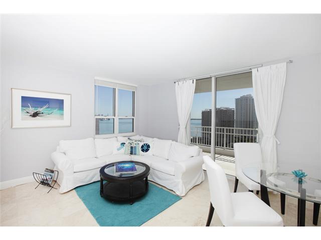 Direct ocean & bay views from this large sunlit SE corner 2BD / 2.5BA on Brickell Key. Beautiful vistas & beach-villa-style furnishings. Granite kitchen & bath counters, newly polished marble floors. Furniture negotiable with purchase. 1 assigned & 2 comp limentary visitor valet spaces daily & 105 cu. ft. storage unit. Enjoy bay views from heated pool, 2-story gym, squash & racquetball courts, billiard/party room, movie theater, biz center & 24 hr desk. Pets up to 50 lbs may enjoy roof top pet park.