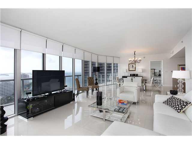 Gorgeous views of Biscayne Bay, Miami River, Brickell Key , Key Biscayne , S. Beach and the ocean beyond!!Spectacular views from every bedroom and living areas. Very spacious 3/2.5 with white , modern porcelain floors, all top of the line Wolf appliances , SubZero fridge, separate shower, whirlpool in Master bath. Enjoy one of Brickell's chicest buildings and it's great amenities. World renown spa, pool area, gym, restaurants, movie theatre and more!Lamps in Dining/master bedr are excluded from the sale.
