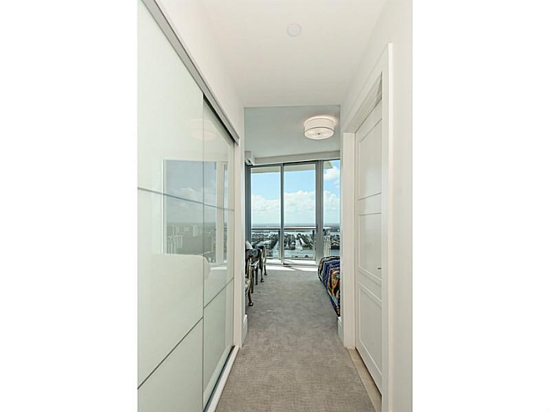 South East Corner Condo with East + West exposures, private elevator/foyer, leading to unobstructed flow-through views of the Ocean, Intracoastal and city skyline. This contemporary Designer-appointed Lower Penthouse features top of the line finishes- whi te glass flooring, custom built-in entertainment center and closets, electric window treatments, Italian light fixtures. Furniture package available separately. Impeccable condition. Easy to show!