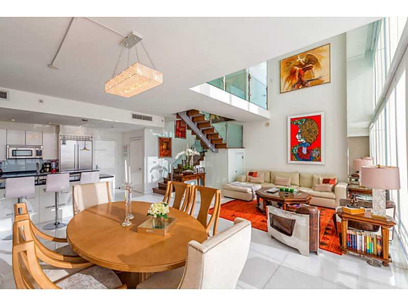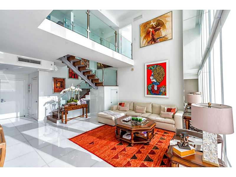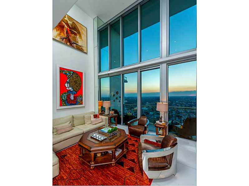 Amazing Two Stories Penthouse featuring beautify sunset views, white glass flooring, power shades and custom lighting.