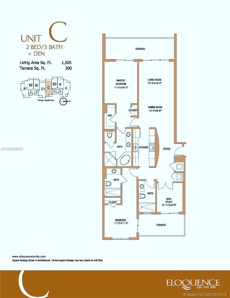 Magnificent East and West views. 2 Bedrooms + enclosed DEN (as 3rd bedroom) + 3 full Bathrooms. This Modern condo offers beauty and comfort all together,in one place, the residences at Eloquence include a stainless steel package in kitchens, floor to ceiling tinted hurricane impact glass windows and doors, designer, wood/stone hardware finishes,and balconies featuring bay and intracoastal views. Pre wired, data and TV included,as well as washer and dryer inside, Pool deck,fitness center, etc