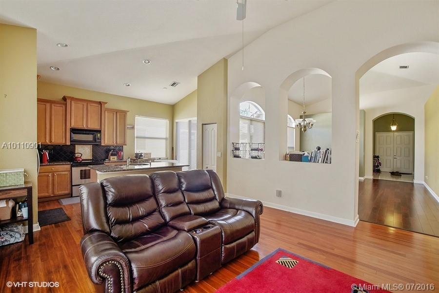 BACK ON THE MARKET!Beautiful home,Large foyer entrance leading to an open floor plan with volume ceilings. Kitchen features S/S appliances, Granite countertops and 42" wood cabinets. Cooking island with plenty of counter space. Large Family room with real wood floors leading to a patio area. A 2nd patio area off the kitchen as well. Master bedroom featuring a tray ceiling, walk in closet and a regular closet. A large laundry room that has been converted to an office. Great home in a great community!