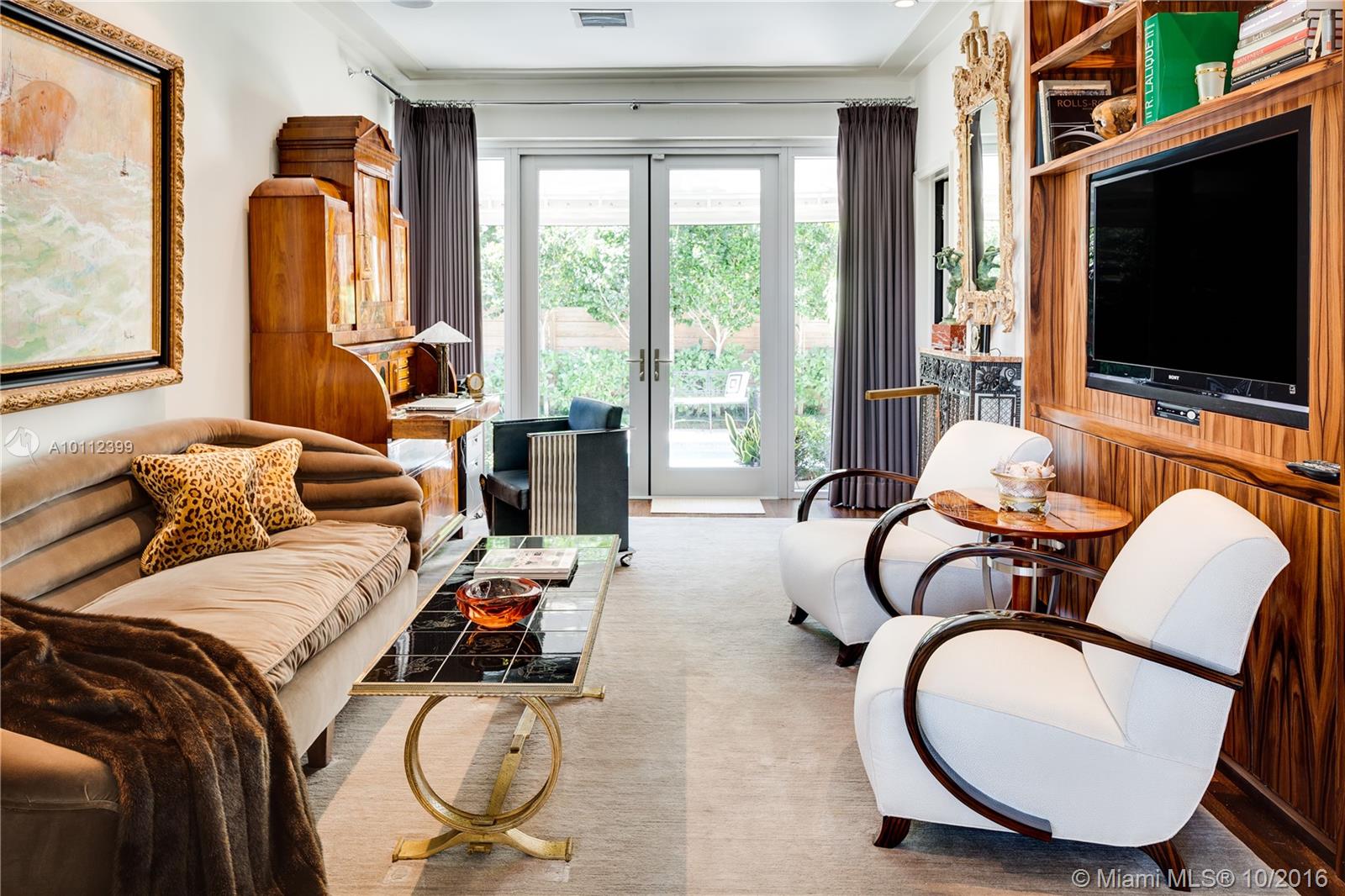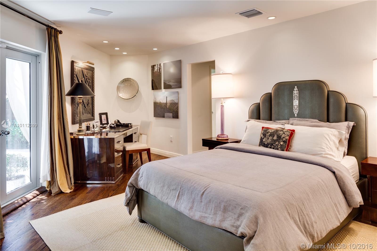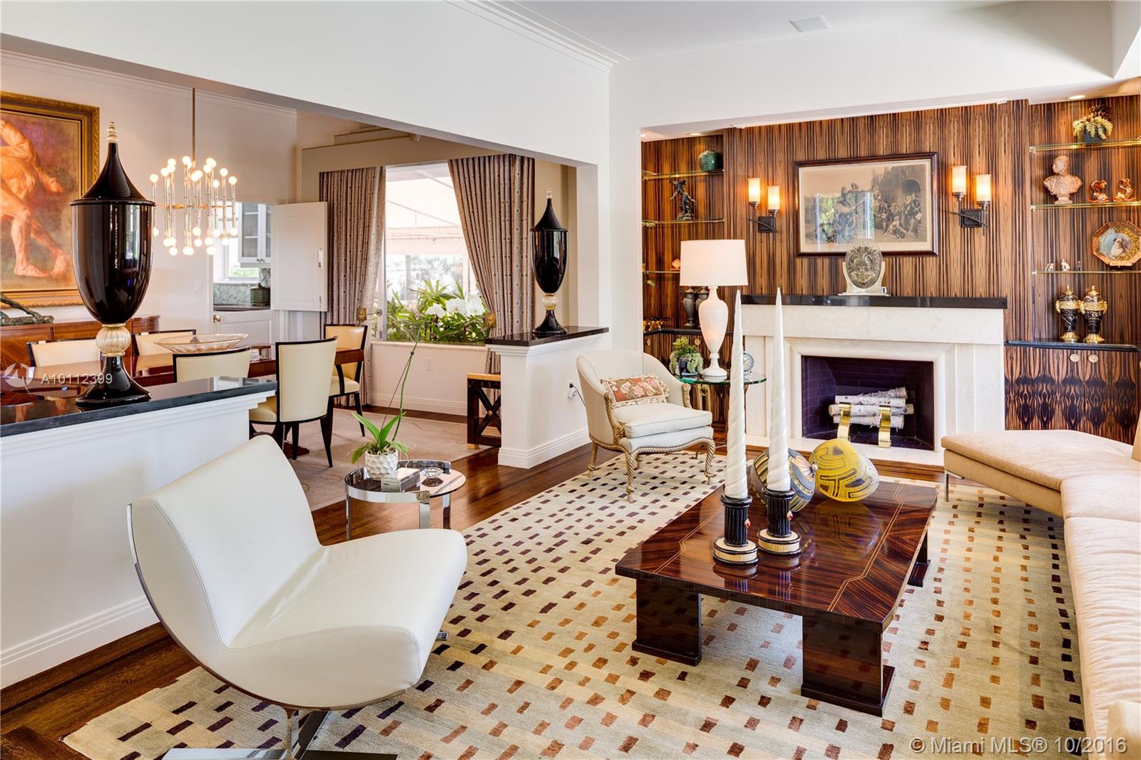 Absolutely beautiful art deco/mid century renovation by world renowned architect Anton Skitzowitz w/ the most value on Miami Beach, a MUST see. Interior features include volume ceilings throughout, a limestone fireplace w/ Macassar wood surround, hardwood floors, & a grand sunken rotunda with marble floors, 15' domed ceiling & cove lighting. Bedrooms are all en suite, master custom closet, & rosewood built-in cabinetry in middle bedroom. Windows & doors are impact. Gourmet kitchen has high end appliances.