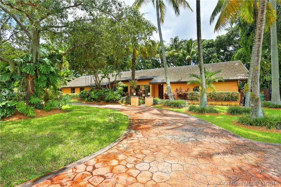Tropical Paradise located on a beautiful corner lot in Pinecrest. Enjoy a very special indoor/outdoor lifestyle with walls of glass to spectacular garden views. High ceilings throughout the spacious split plan. Living, family room, kitchen and master bedroom look out to a large pool and magnificent grounds. Walk hidden paths under tall trees draped with orchids, lush Palms, heliconias and bromeliads. A 100 year old Oak tree. Top schools, shopping, marinas and parks nearby. A quality home in Pinecrest!
