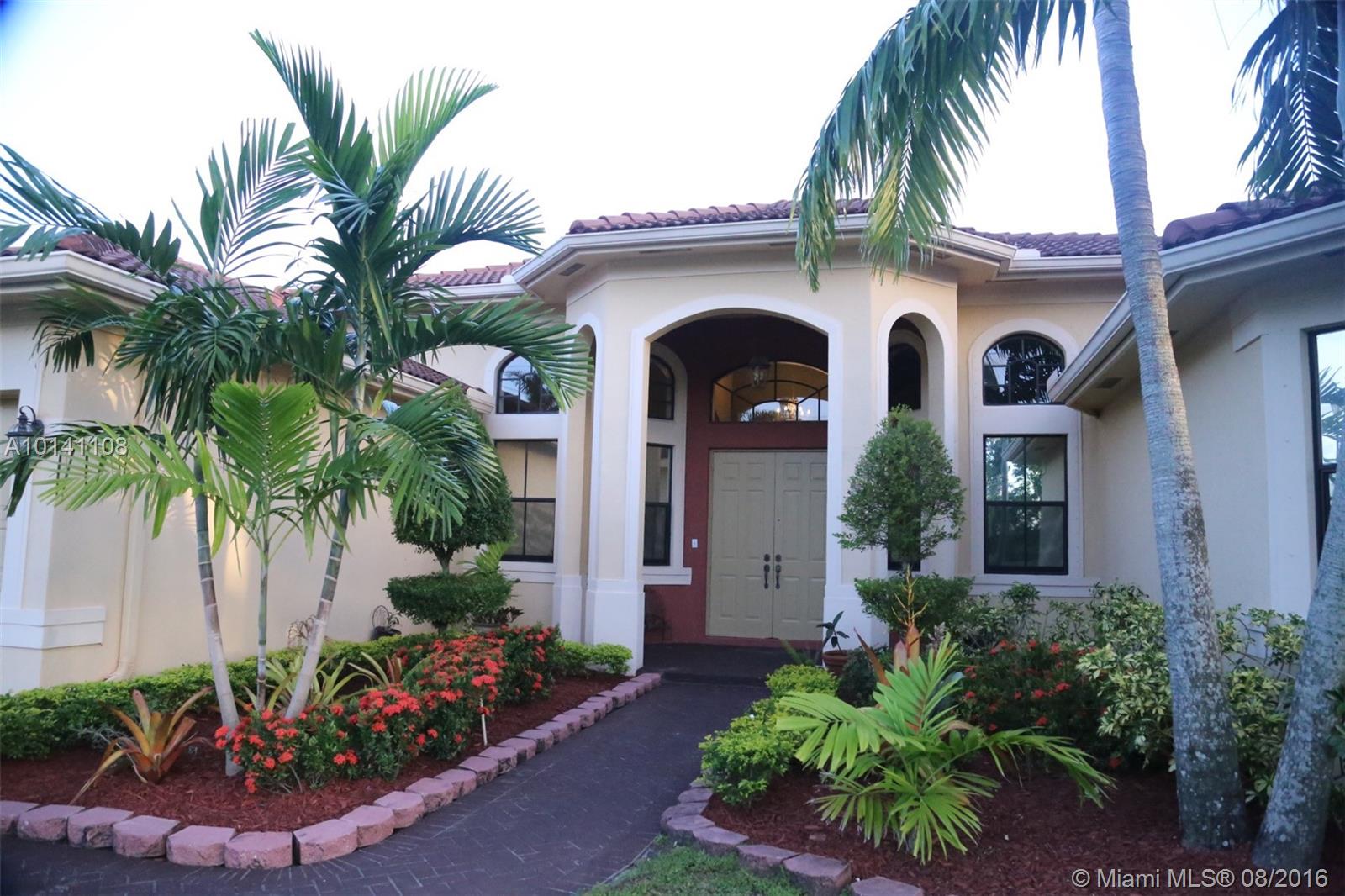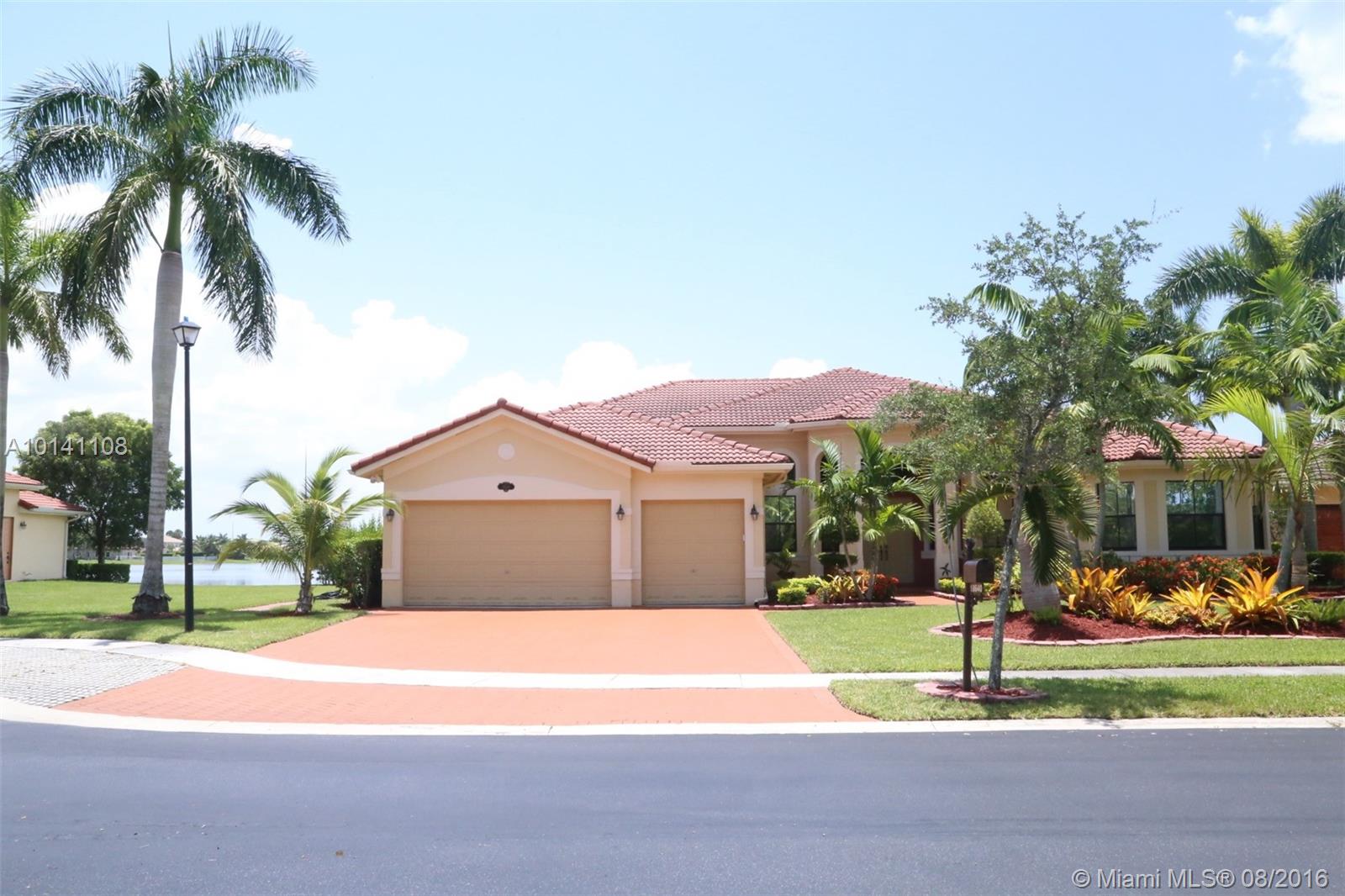 Beautiful 5-Bed/ 3-Bath, waterfront home in desirable gated community Harbor Lake Estates located in West Miramar. Spacious 1-Story with open floor plan, high ceilings & tile though out, kitchen w/granite countertops & wood cabinets, laundry room, 5th additional bonus room/den/office, 3-car garage, paved driveway, storm shutters, huge Premium quarter acre lot/ 11,963 sq. ft. Amazing backyard for entertaining with large screened terrace area and gorgeous panoramic views of 175 acre Lake. A Rated Schools!