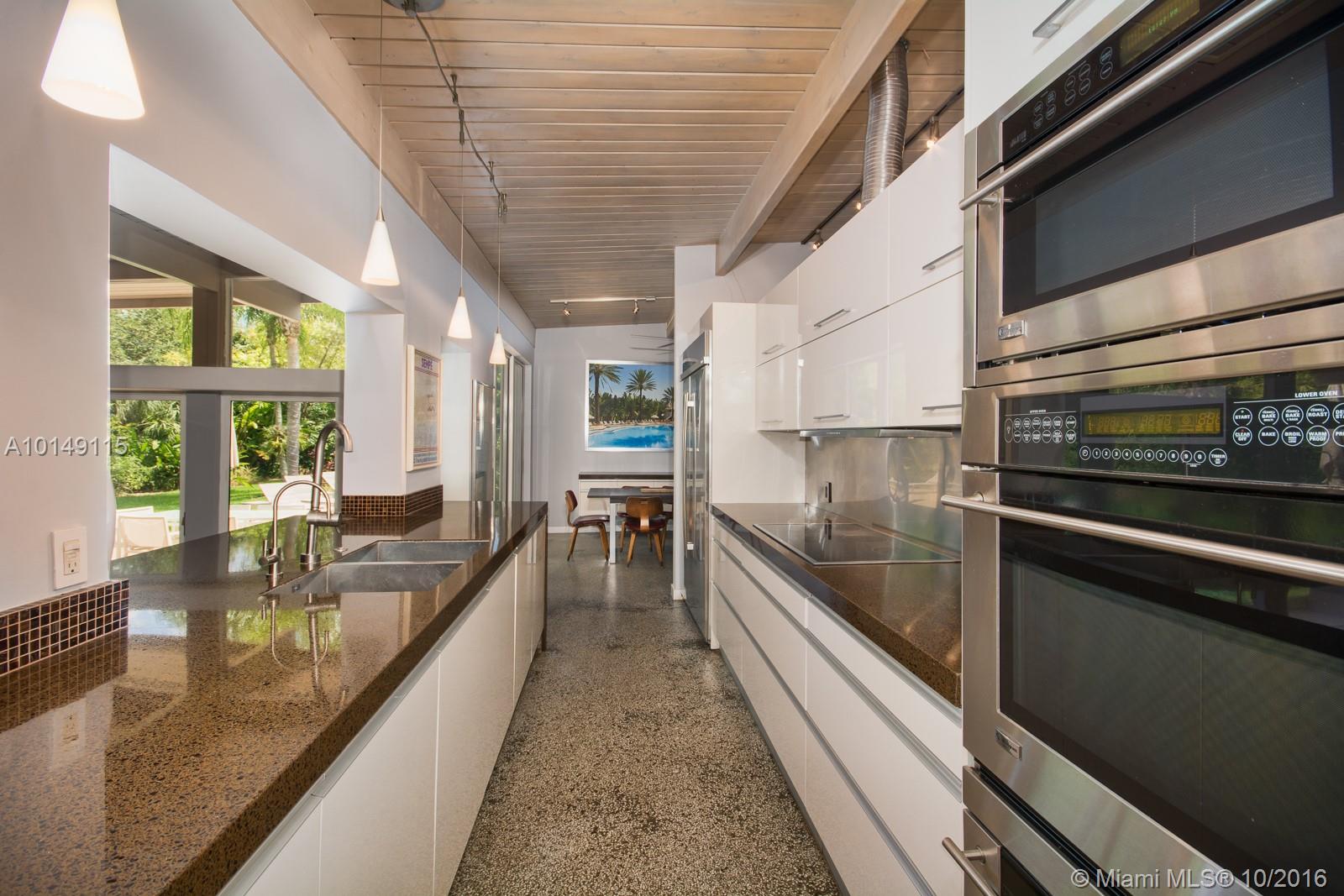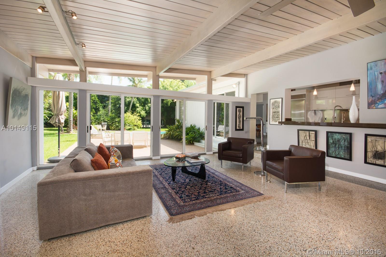 For the Mid-Century Modern enthusiast, a restored gem! Appreciate classic MCM appointments like sun-filled clerestory windows, polished terrazzo & wood flrs, exposed beam ceilings, & wonderfully spacious walls for art. A beautifully updated eat-in kitchen w/ snack court, new roof, fabulous pool, N/S tennis court, chickee hut & an acre+ paradise of magnificent fruit & flowering trees are icing on the cake, as is this magnificent neighborhood in Pinecrest Elementary School district. SF as per architect.