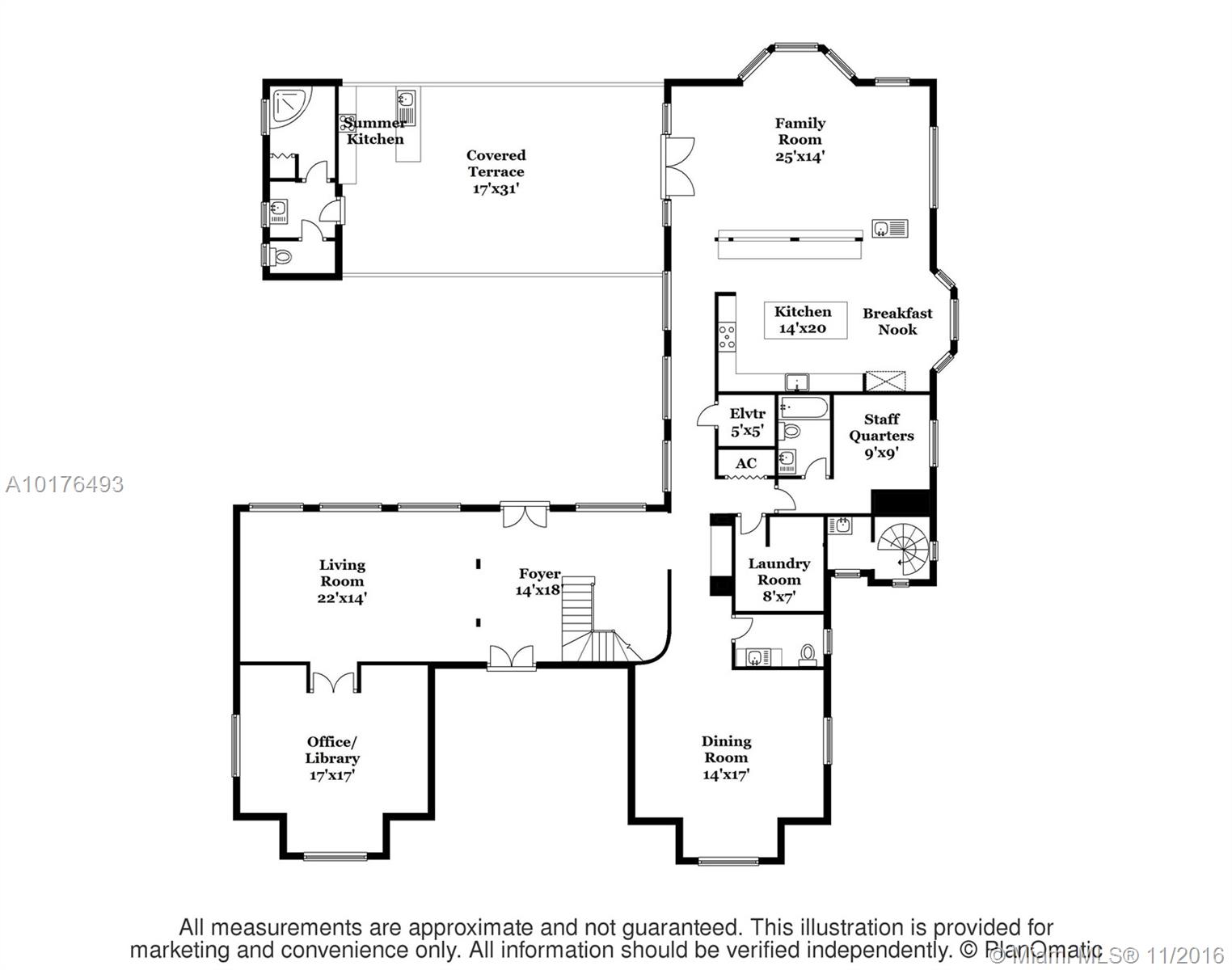 Cocoplum waterfront! Elegant home with onyx & hardwood floors, double tray ceilings, paneled office & elevator. Kitchen redone 2013. Beautiful courtyards, gardens, pool, summer kitchen & cabana w/full bath, upstairs master bedroom. 70' dock on wide canal, one tall bridge to bay. Bonus space! Huge ground level rec room/guest suite with 2 rooms and full bath.