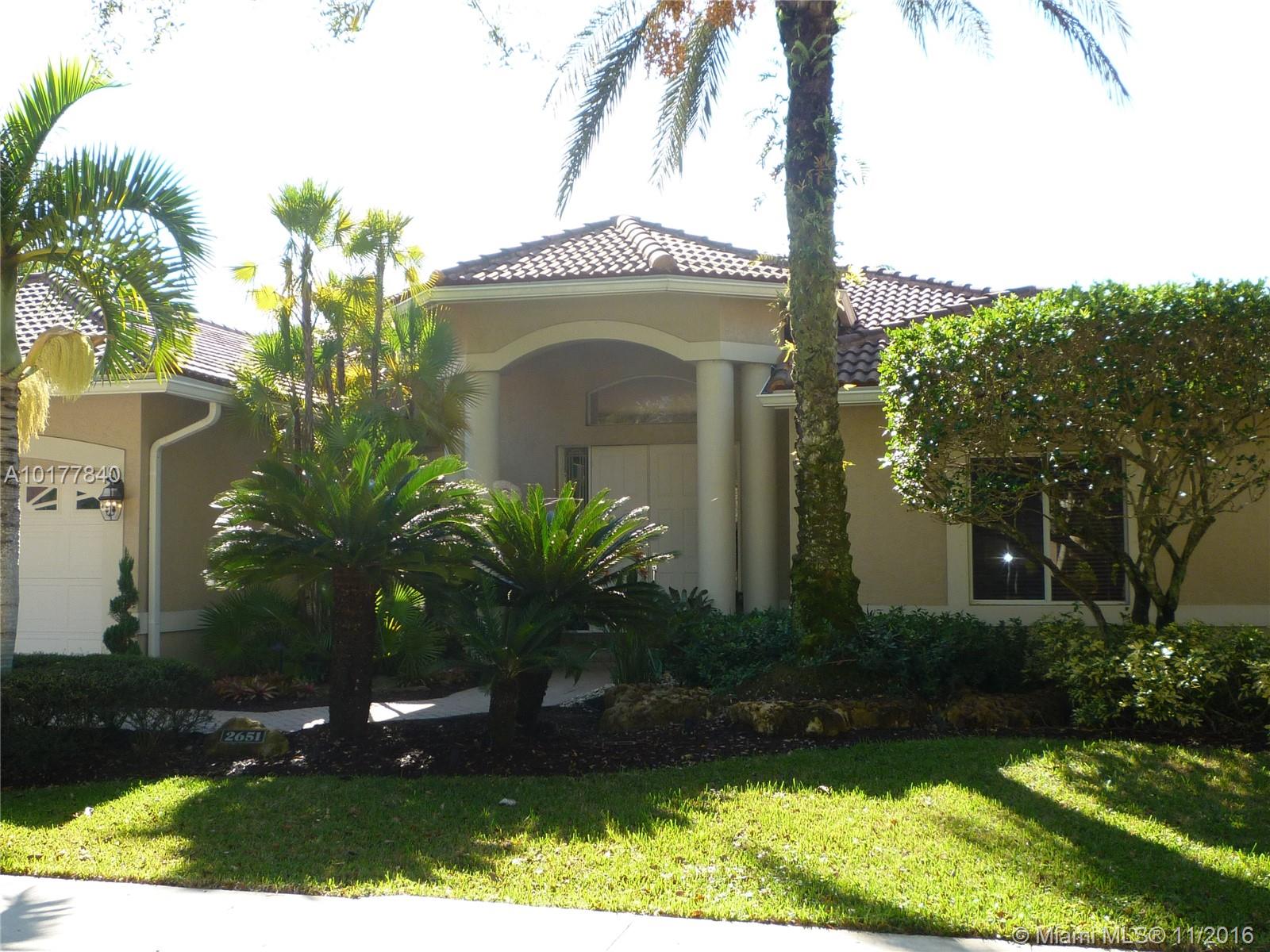 Stunning 5 Bed/3.5 Bath House in the Heart of Weston, Updated kitchen with Granite Counter Tops, S/S Appliances, Traver-tine Floors, High ceilings, Central vac, 2 A/C units, Paved Driveway, Professionally Landscaped, 12V lighting, Gorgeous Custom Screened Pool with Raised Oversized Heated Spa, Private Lot, Perfect for Entertaining, Surround Speakers, Outdoor Speakers, Wet Bar, Cabana Bath, 24 hour Man Guarded Gated Golf Community of Weston Hills, No membership required, Security Patrol, Low HOA.