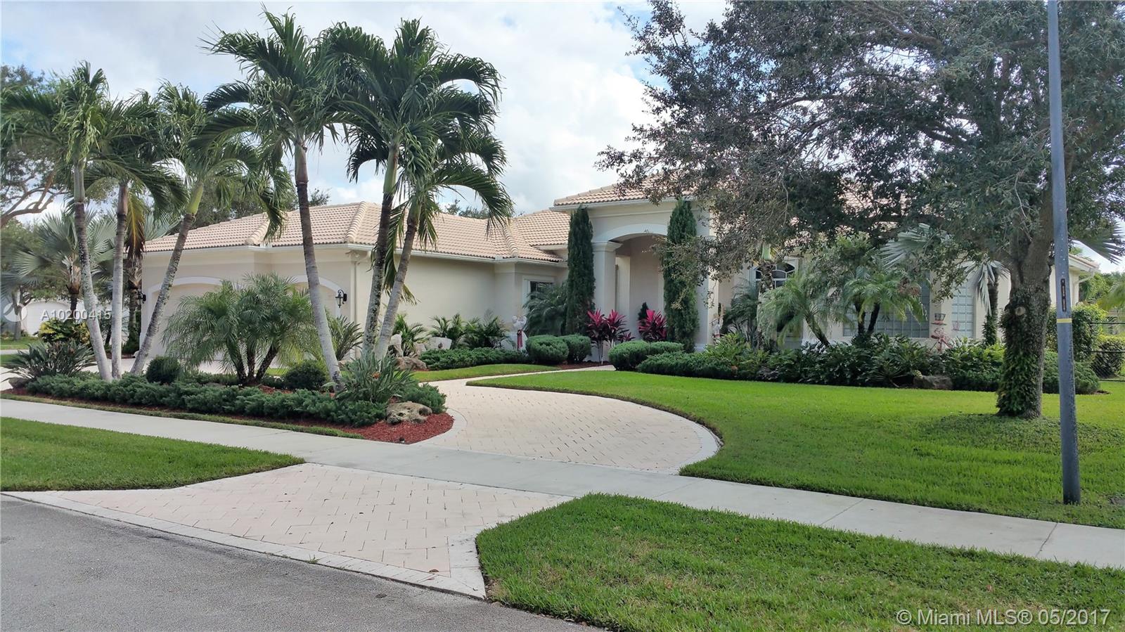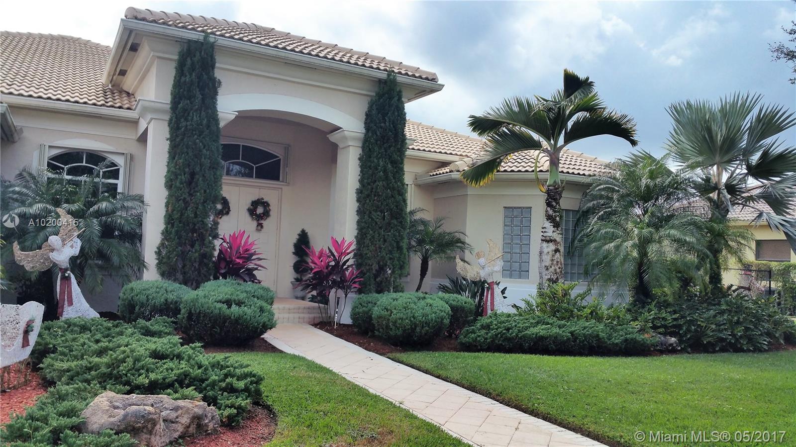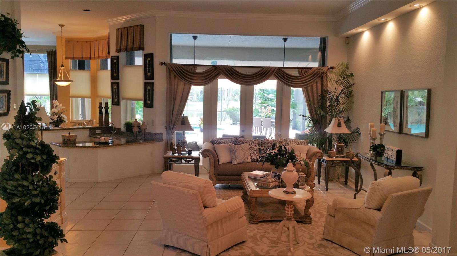 Stunning spacious corner Lake home features 1 story 5 Bdrm 4 Bath , 3 car garage, with open terrace screen in pool with water fall over looking serene lake. This amazing home is equip with top of the line appliances, huge entertainment room with wall to wall unit with TV and surround sound and DVD and CD storage included. Gourmet Kitchen W/ Granite counter top, breakfast nook & wet bar.Crown molding,accordion shutters. One of a kind Bright and clean spacious home. a must see