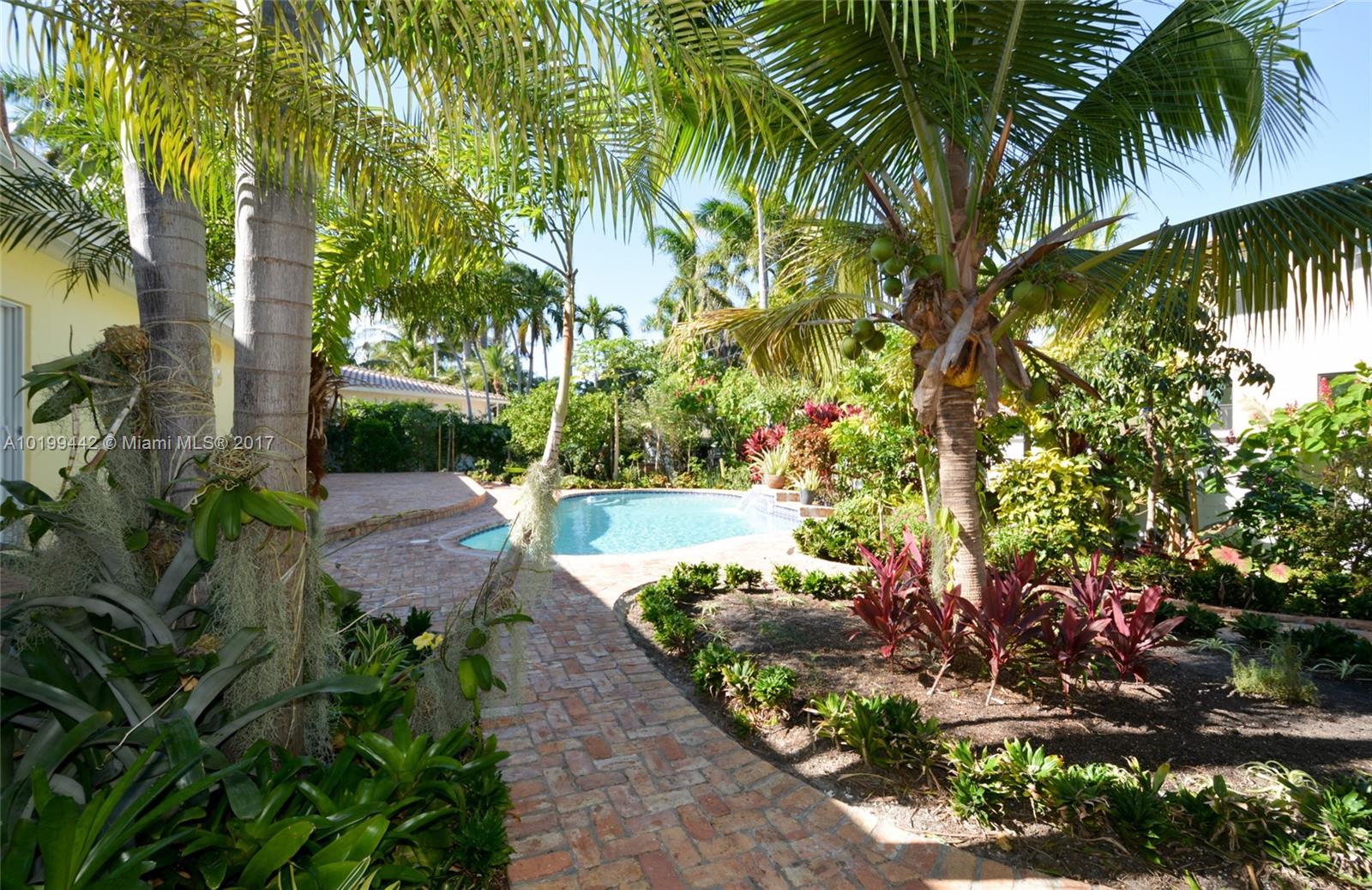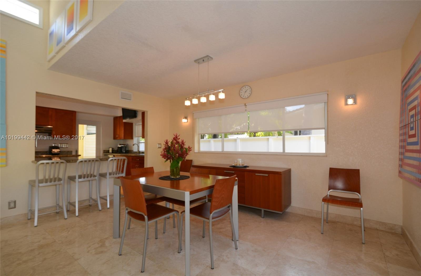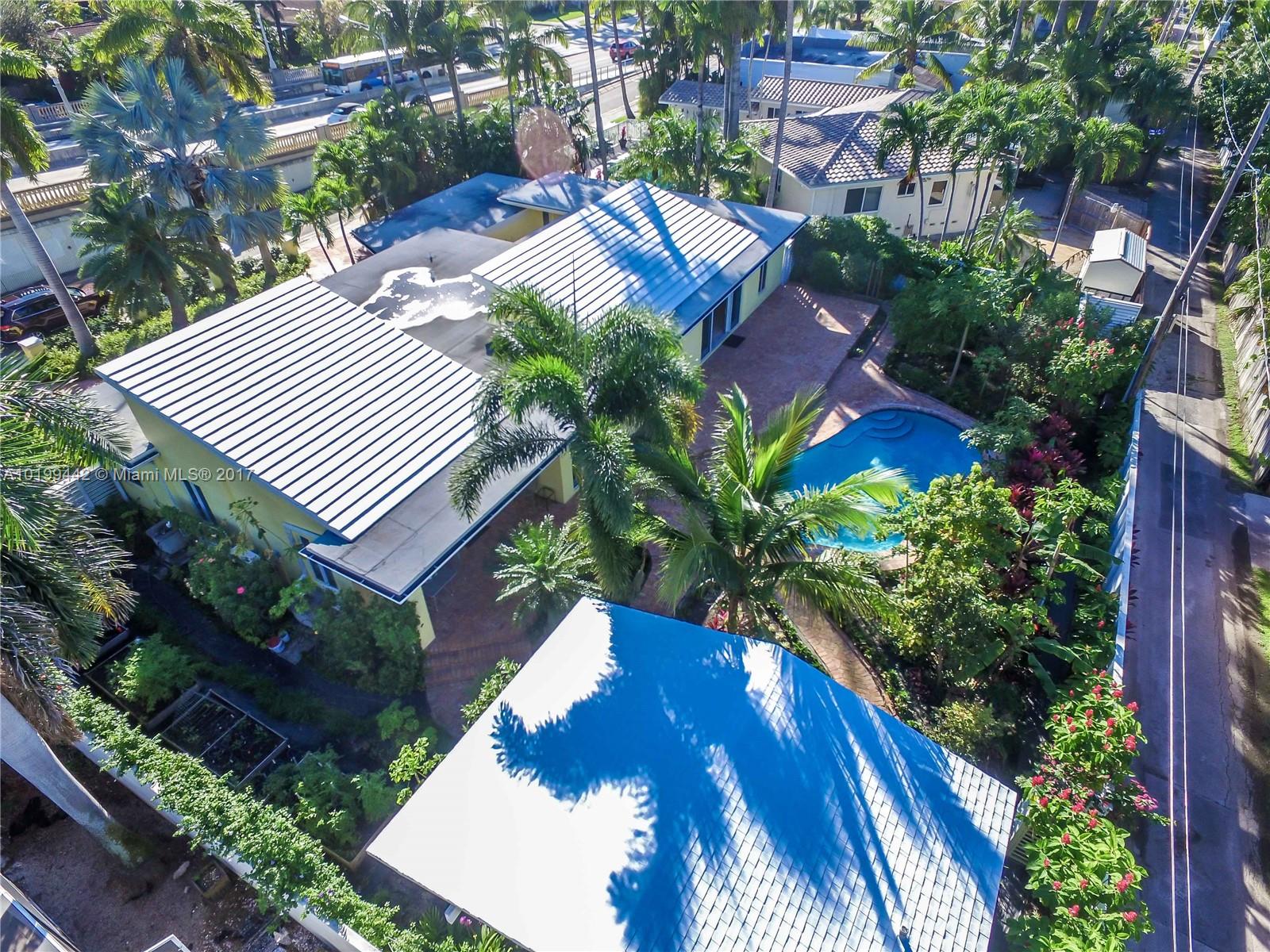 2 Blocks from the beach. Mid-Century Modern Home was remodeled in 2011, almost 3,000 sq. ft on a double lot. Total of 4 BR & 3.5 BA, 1 Car Garage. Spacious kitchen w/wood cabinets, granite countertops. High Vaulted Ceilings. Travertine marble floors. 2 Master suites 1 w/walk in closet. Chicago Brick circle driveway & back patio. Pool w/waterfall. Detached Cabana includes the 1/2 bathroom. Newer roof. Glass inside open patio. Enclosed Fenced backyard has Organic garden with Orchids, fruit & Palm trees.