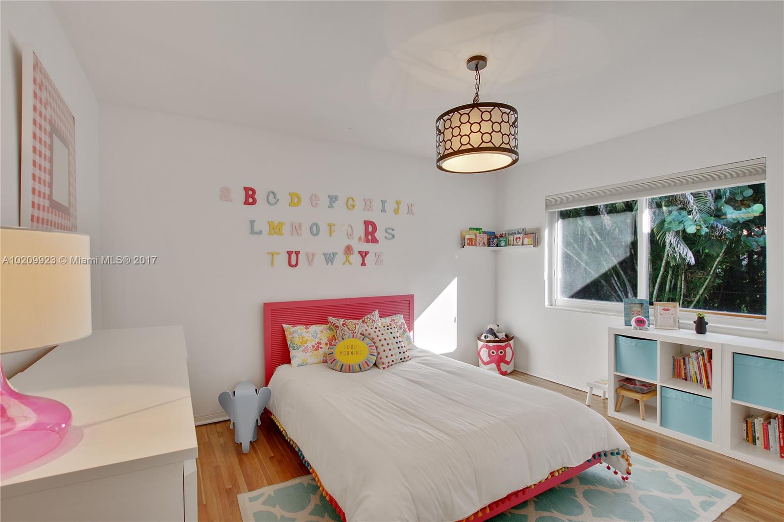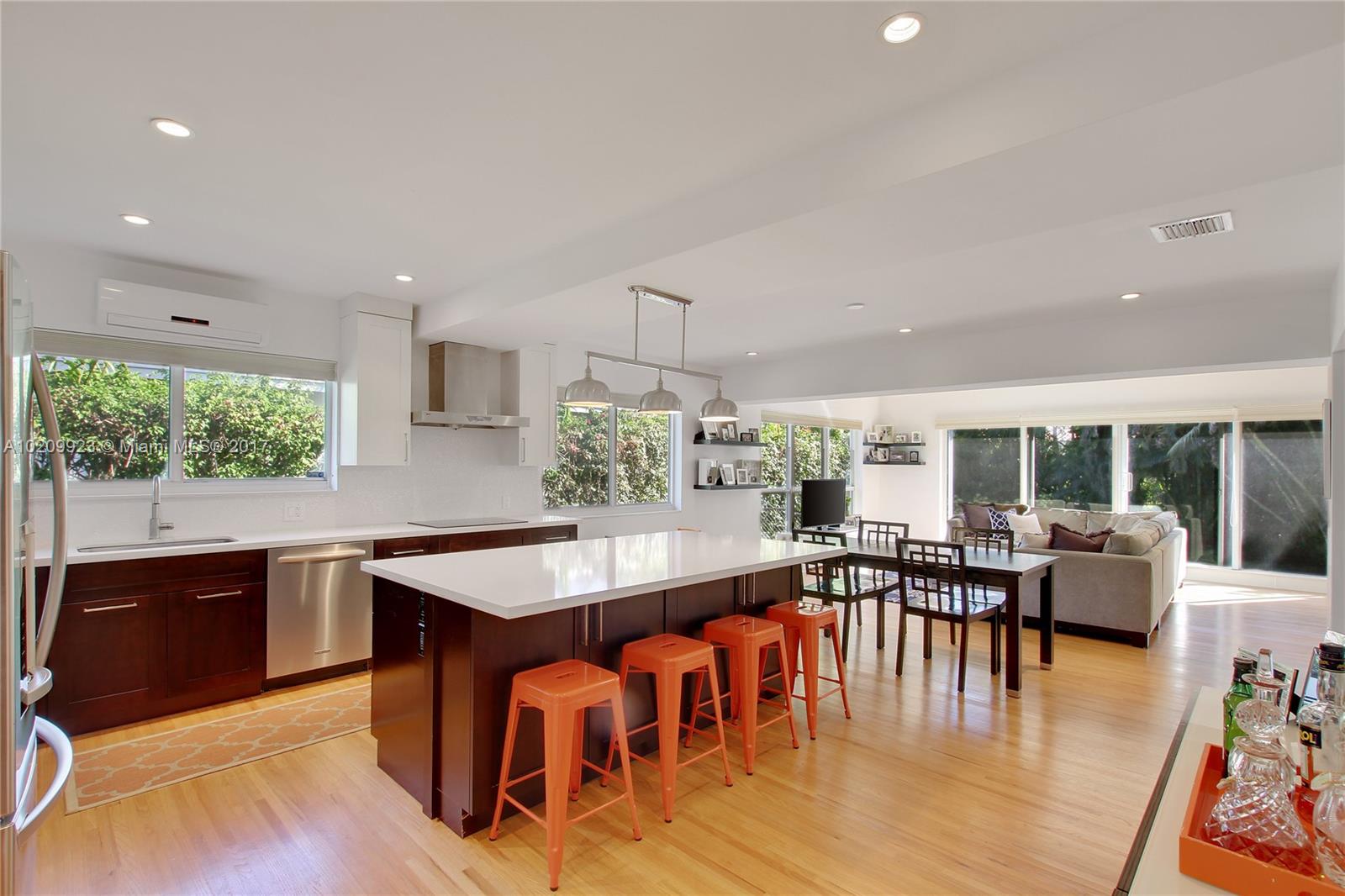 Miami Shores home only half block from the bay! Open floor plan living room, dining room, family room and kitchen w/ oak hardwood floors throughout the house. Stunning remodeled kitchen w/ 8ft center island, quartz counters, double wall oven and glass-top stove. Impact windows provide amazing natural light throughout the house. 3 Large beds w/ custom closets and 2 full baths. 2 car garage with laundry & a half bath. Large patio and private yard w/ room for a pool. New roof being installed as of March