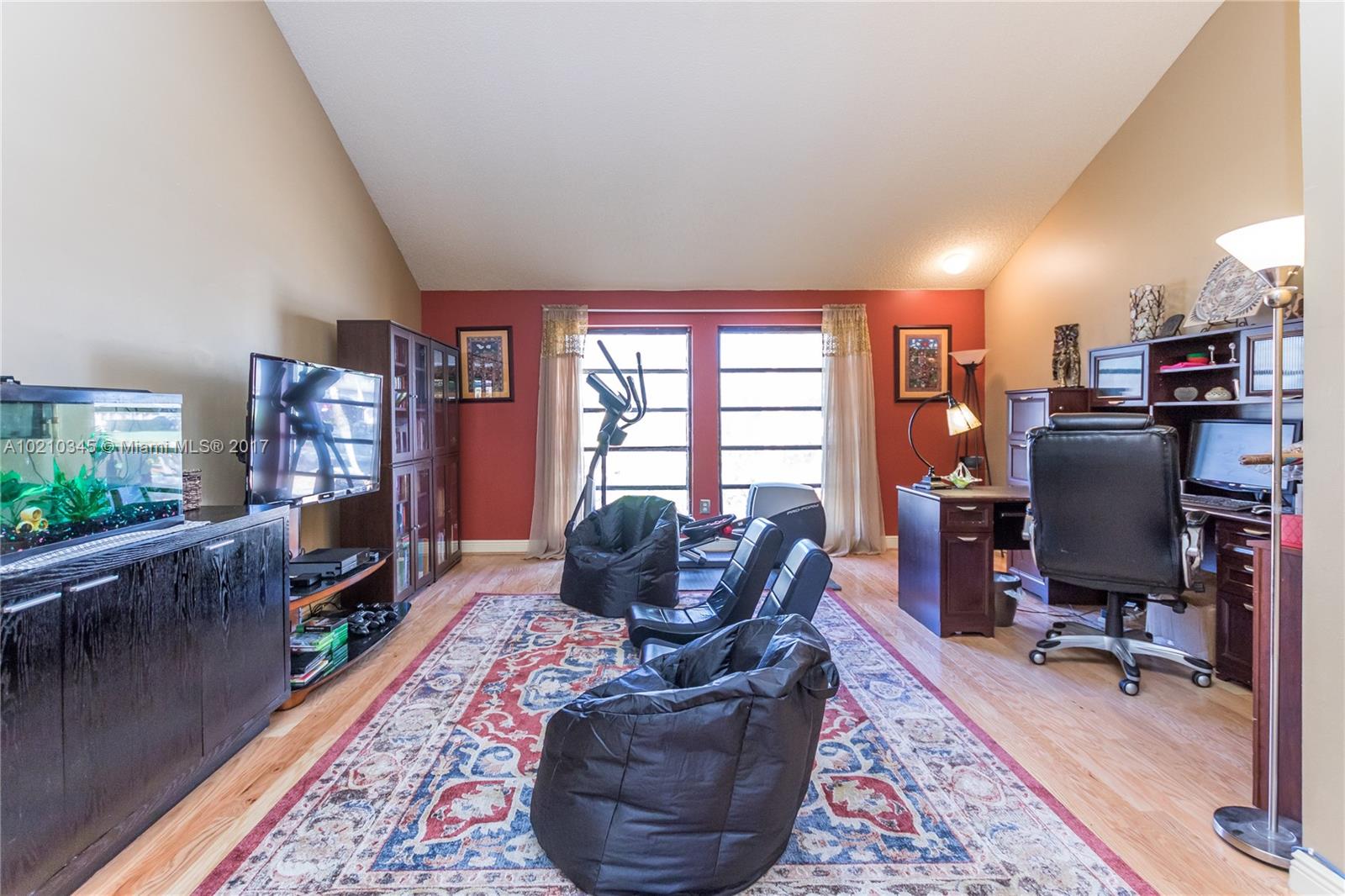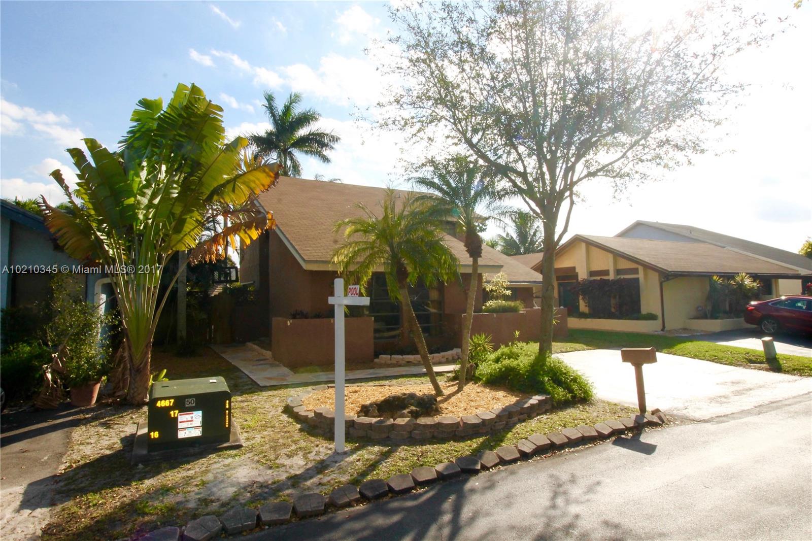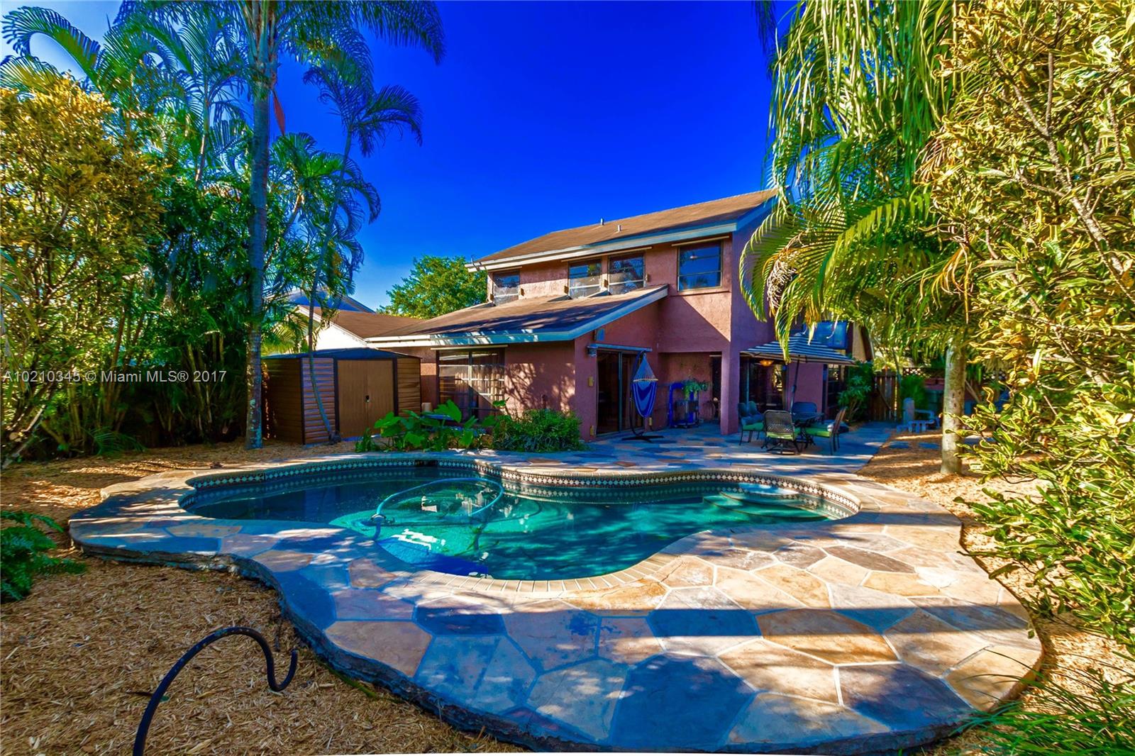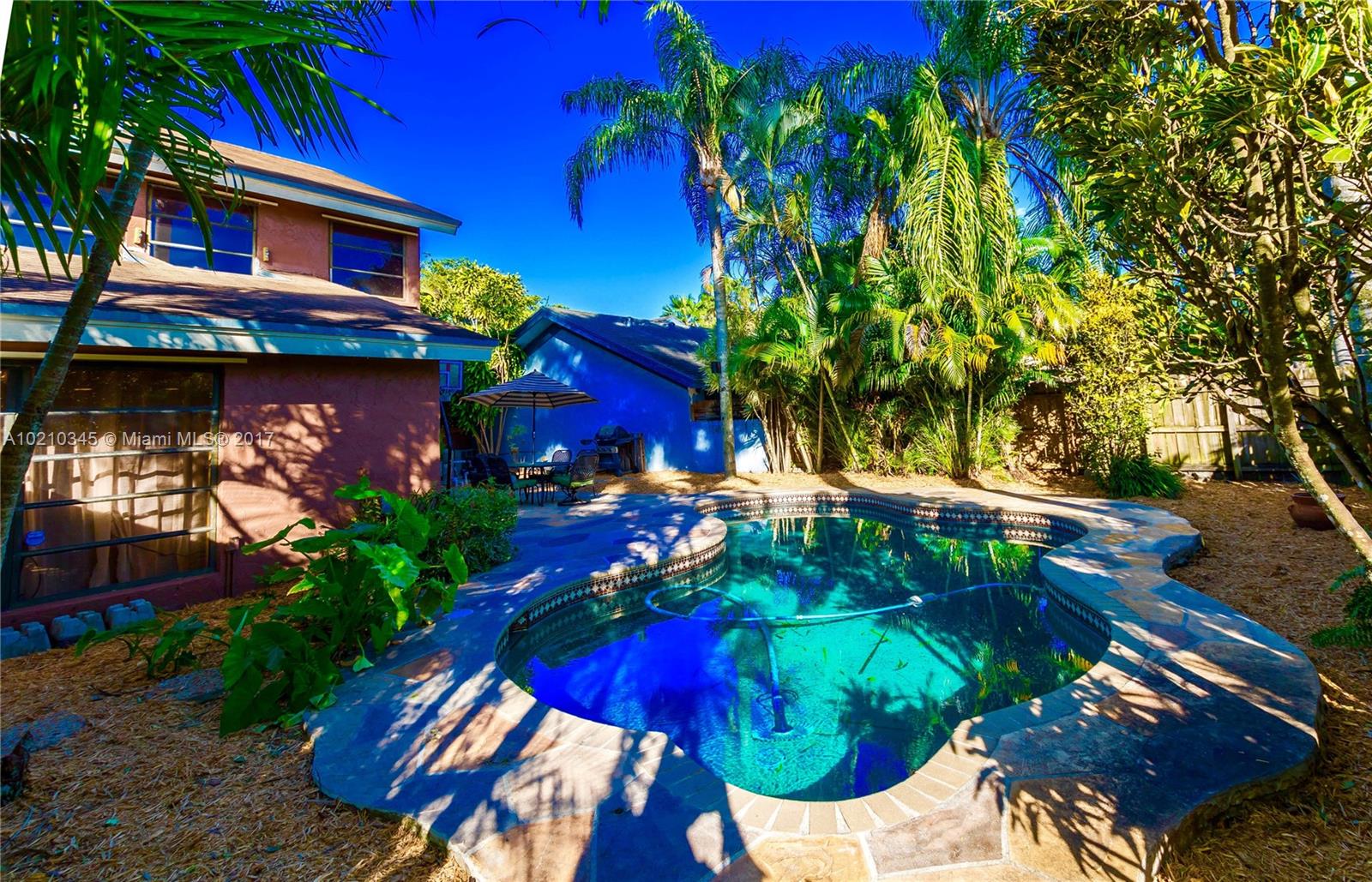 Large home in the community -original from the developer-. Beautiful and spacious, lots of light. Ideal for entertaining, private backyard with pool, extended family room, new kitchen, recently remodeled bathrooms, high ceilings in living area, plenty of space for a large family or the ones who enjoy living surrounded by nature, parks and great schools. The original model was extended through the garage and open porch to enclose and convert them in inside living spaces. Parking available in driveway