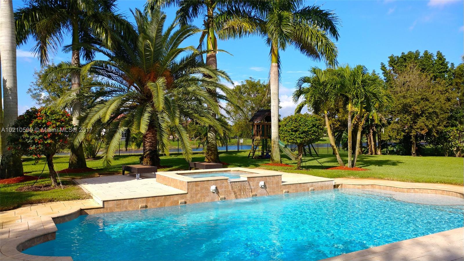 Magnificent home in prestigious Grove Creek equestrian community. Beautifully landscaped .80+/- acres on extra wide canal. Granite counters and stainless steel appliances, including built-in glass stove-top. Crown molding. Cherry-wood flooring. Large master suite with dual closets. Pool with elevated spa and gazebo. Three-car garage. Accordion shutters. 24/7 security entrance.