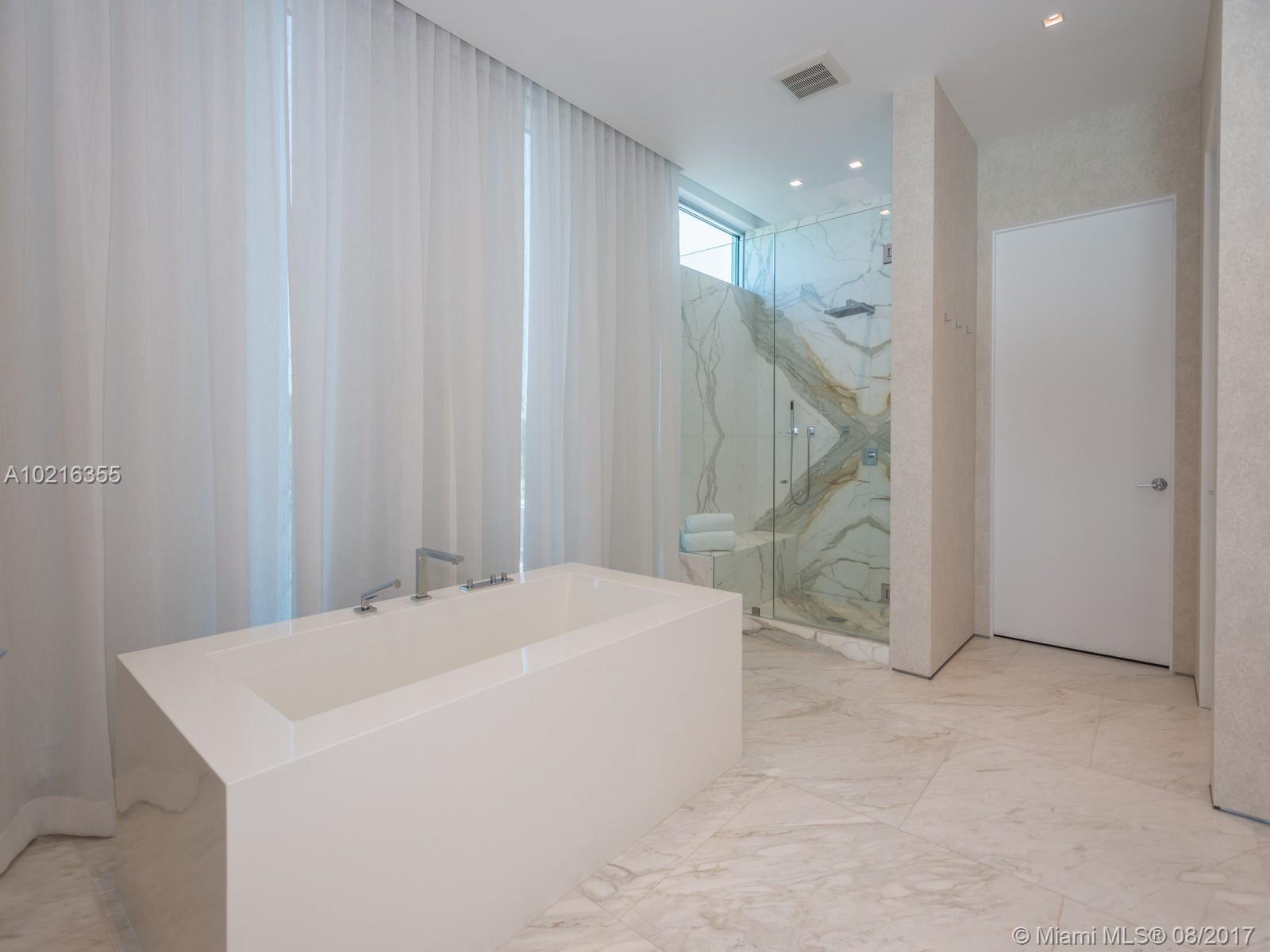 Striking modern residence built in 2013 w/150 ft of direct wtrfrnt & dock. Large lot offers wide water vus & rare dock accommodations for over 100 ft yacht. Created by sought after architect Ralph Choeff & builder Todd Glaser. Stunningly from its ground level reflection pools, light filled interiors, to the 3rd flr prvt deck, overlooking South Beach. Estate offers ideal flr plan, including a 2 bdrm attached cottage, maids quarters, 1 bdrm detached guest or Captain quarters, exercise atrium & custom garage