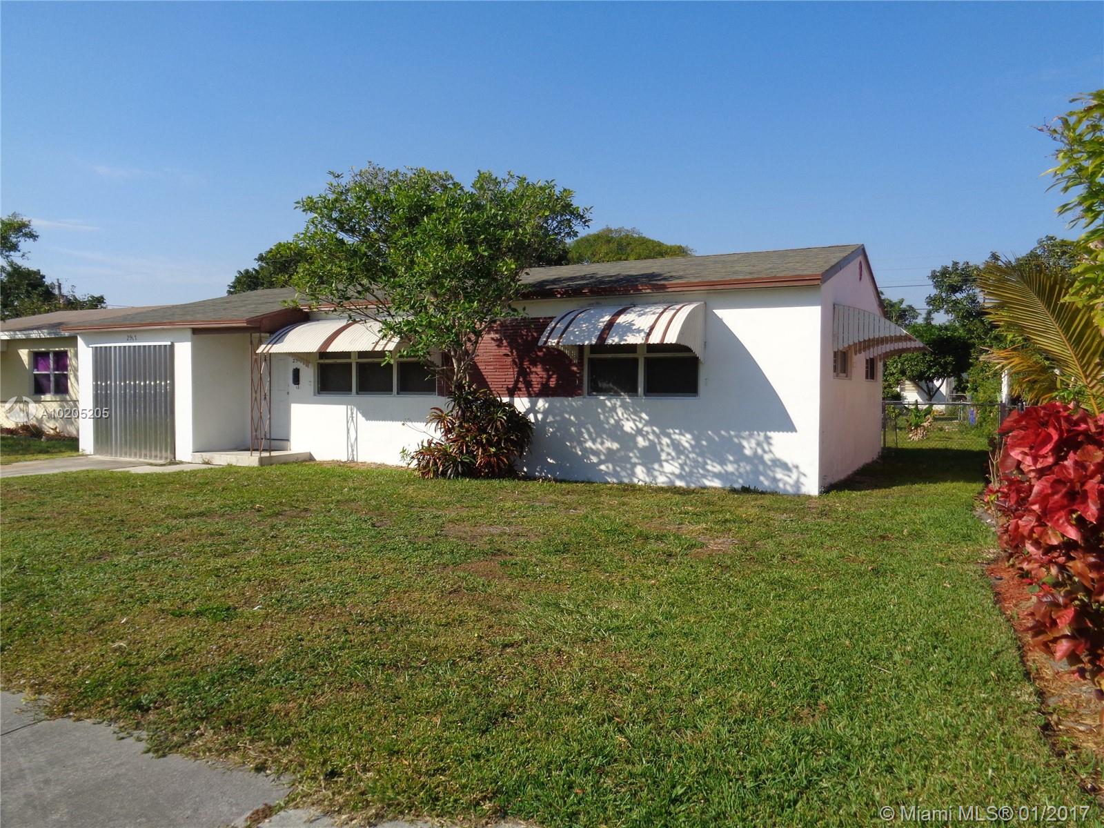 A well cozy maintained home on a lot to either expand or have a swimming pool, this home offers a nice floor plan with possibility to be converted easily to a 3 bedroom and 2 full bath home or just enjoy the current floor plan with huge formal dinning and living room areas. Terrazzo floor throughout, having car garage with additional parking spaces, new vertical blinds, newer updated windows, freshly painted, situated on a quiet street, easy access to I-95 and beaches.