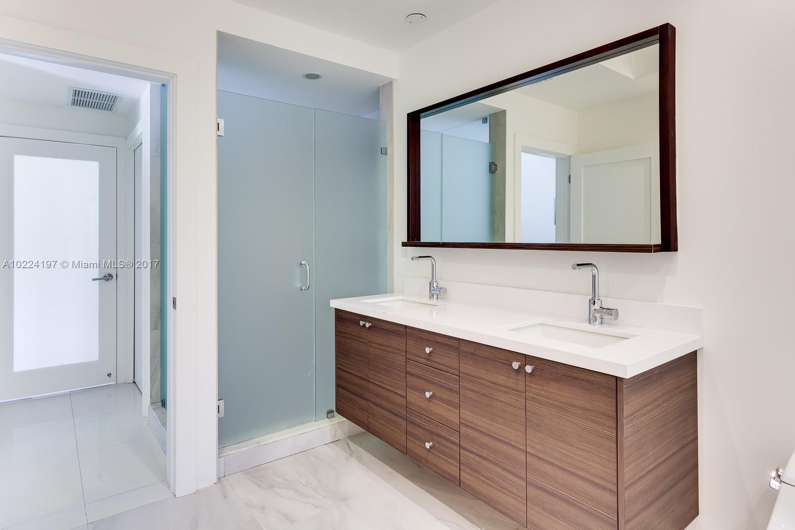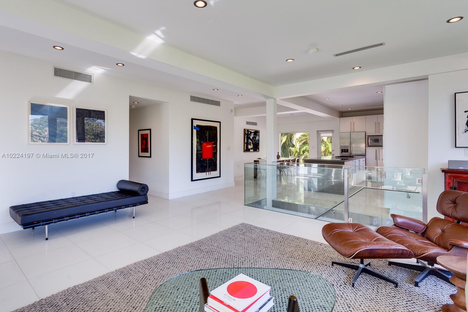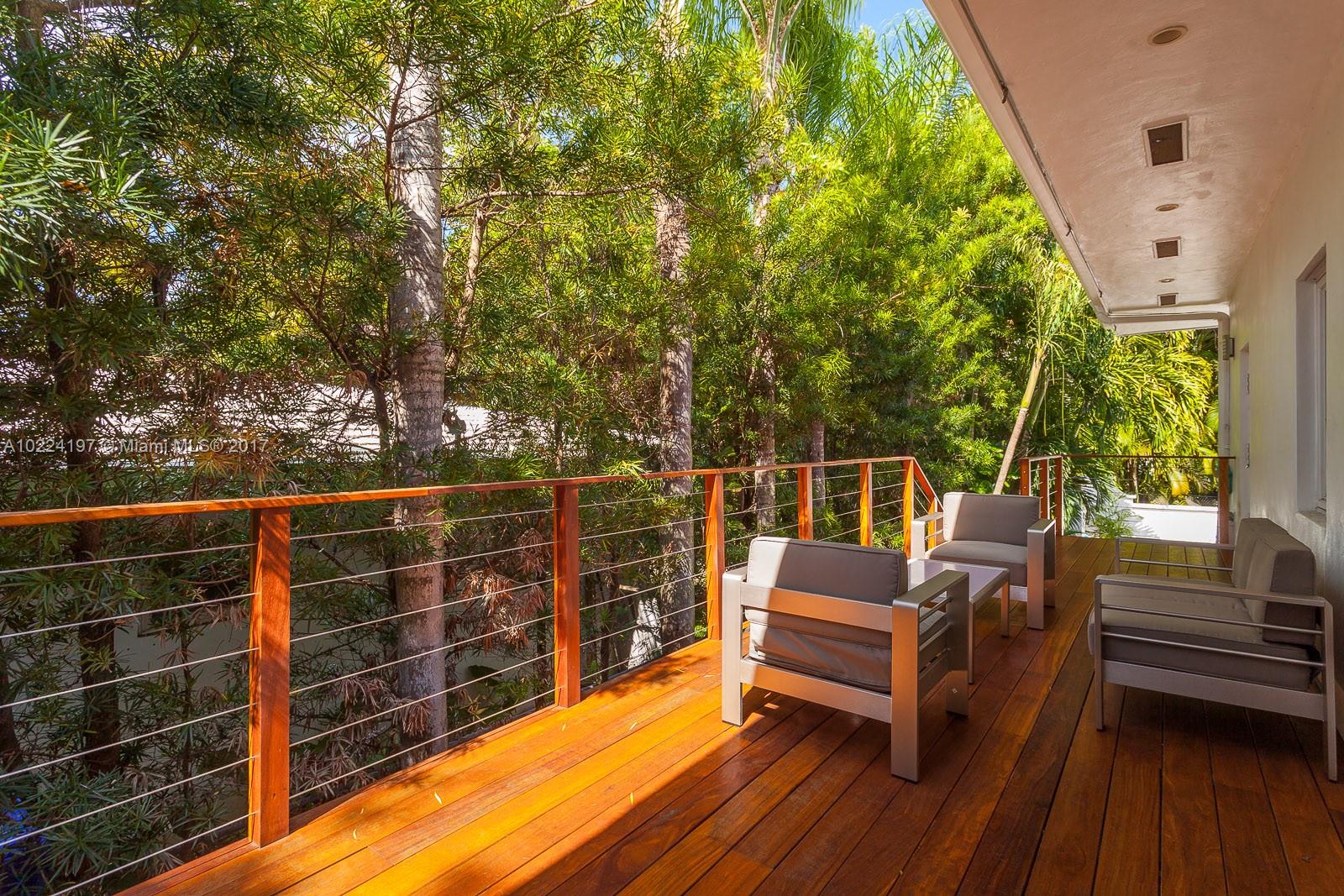 Welcome to Treetops! A stunning mid-century Modern in Coconut Grove combining light & space which create the feeling of a floating retreat. This sleek & exciting home features new kitchen & baths, impact glass, custom bookshelves, LED lighting, wet bar in media room, mosquito mist system, coral rock terraced lawn. 3/2 on first floor, 1/1 bonus downstairs + media rm, 4 car garage. Pool/guest house with kit & bath. Brazilian Ipe wood deck surrounds glorious pool & garden. A tropical paradise.