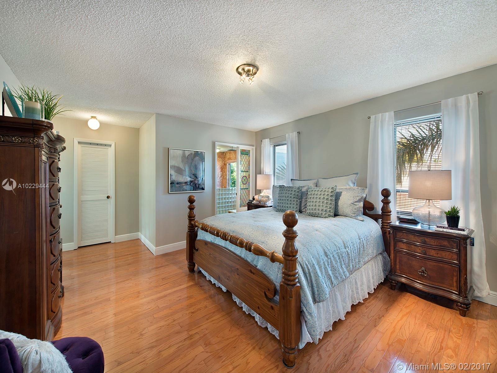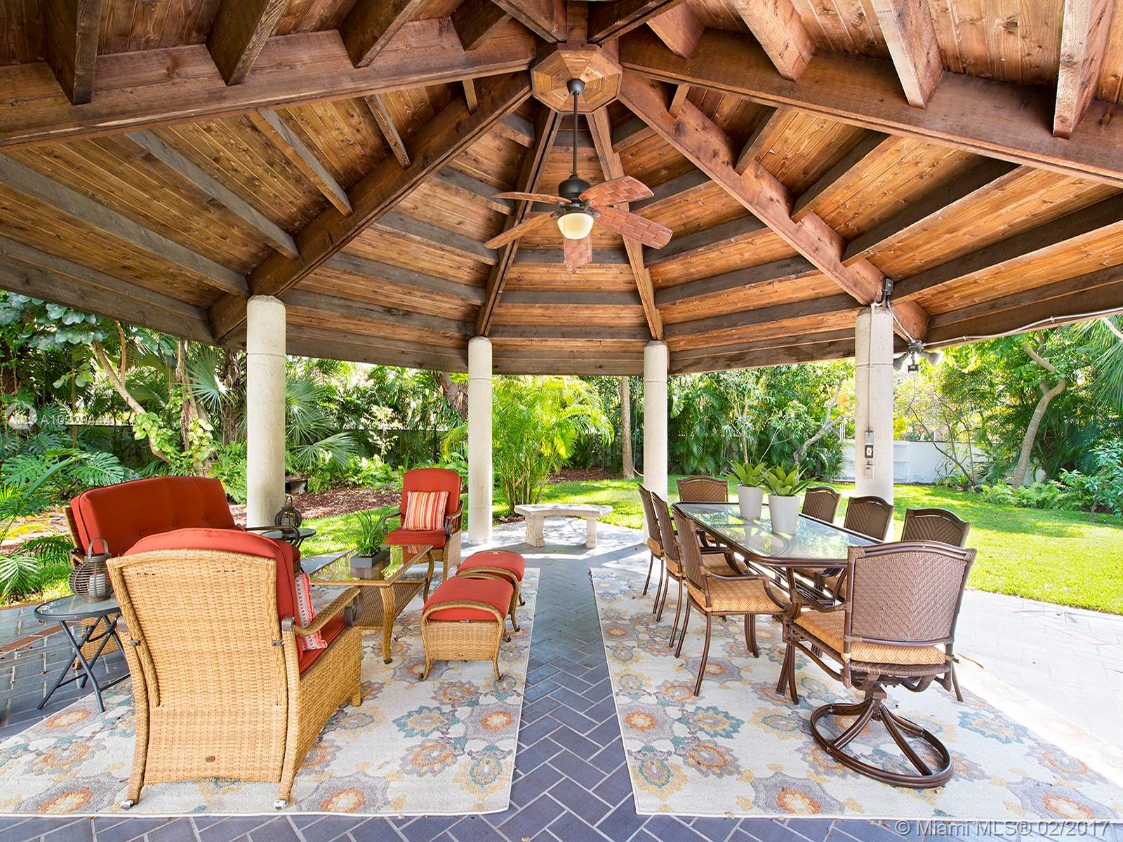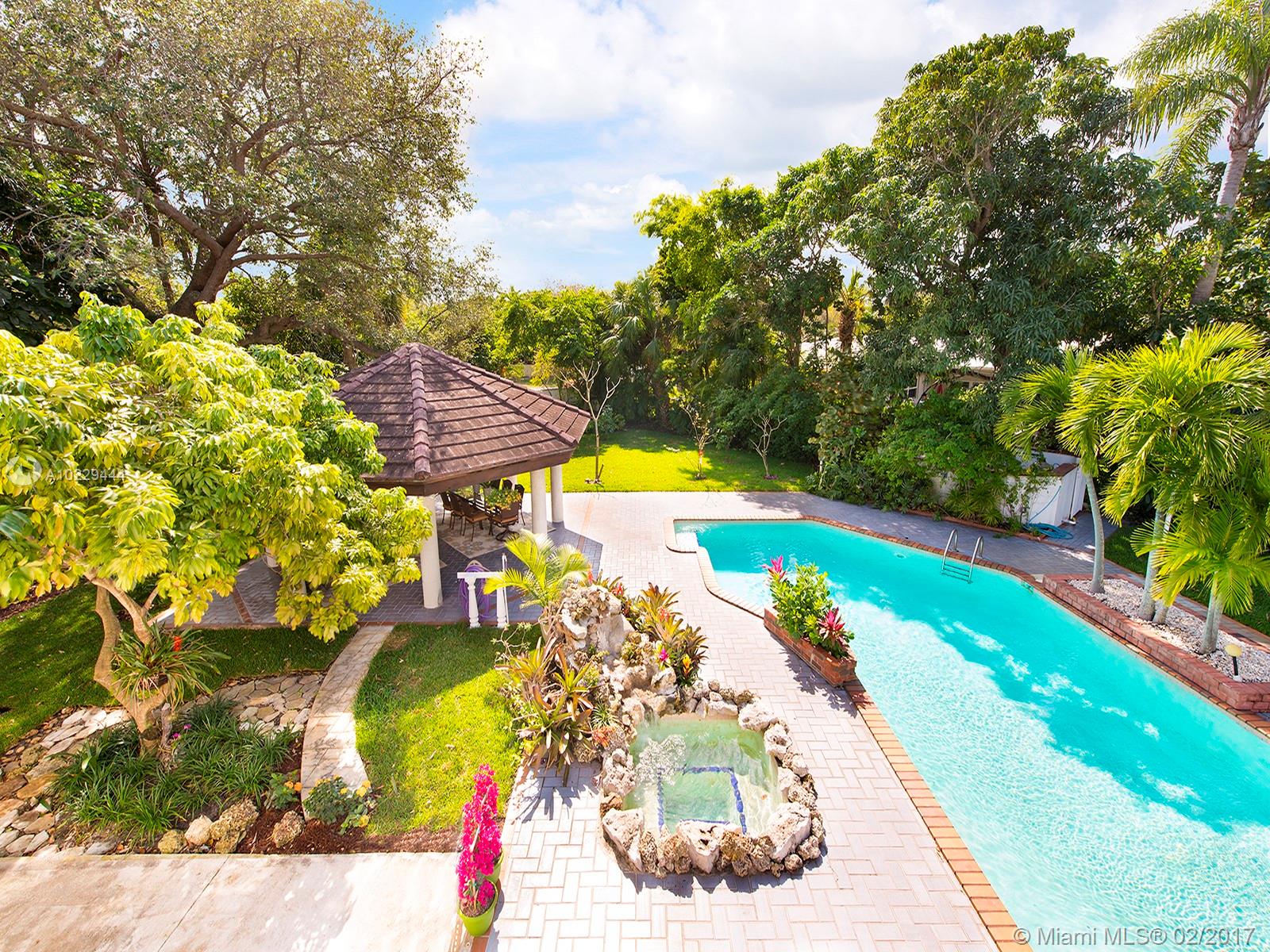 Stately 2-story Mediterranean home on huge lot. Soaring foyer, elegant LR/DR w/mahogany flrs. Upgraded eat-in kitchen w/island, SS appl, lots of cabinets/built-ins leads to large FR & 1/1 guest suite w/ laundry. Upstairs 4/2 + master suite w/walk-in closet & bath w/rain shower, double sink, bidet & soaking tub. Balconies galore! Large pool w/hot tub & extensive paving surrounded by private, lush yard. Grand gazebo & outdoor fireplace ideal for outdoor entertaining. Impact windows, sprinklers & much more!