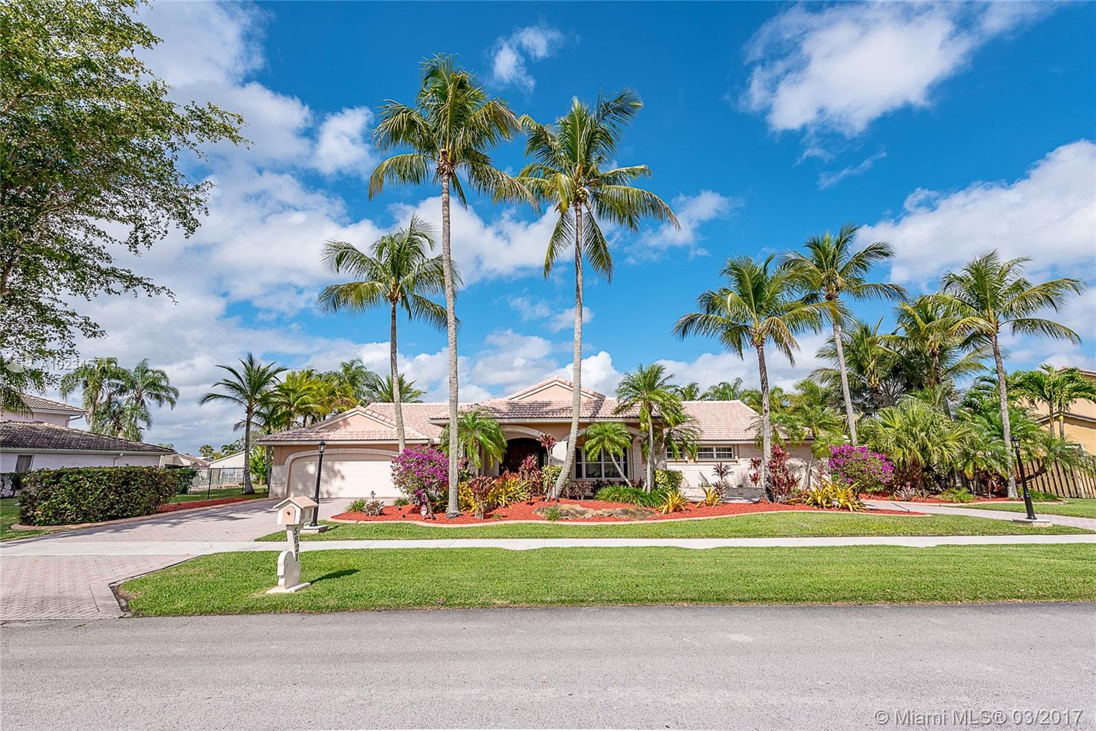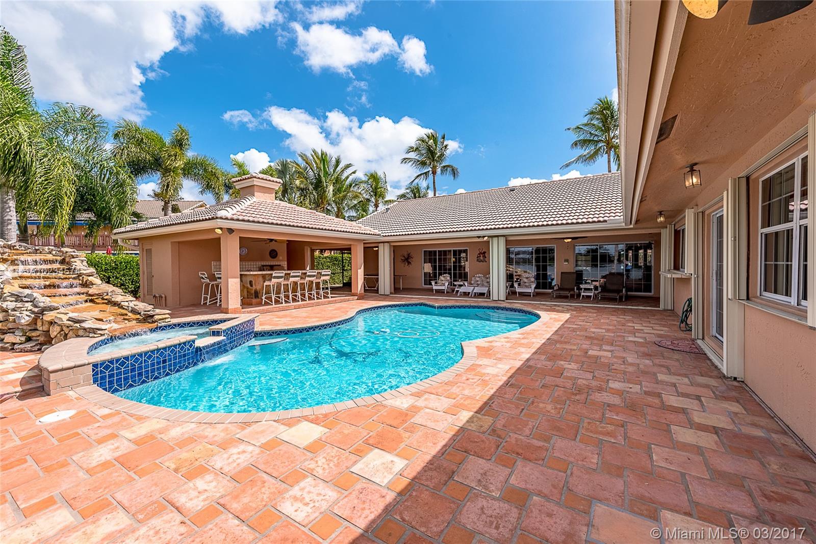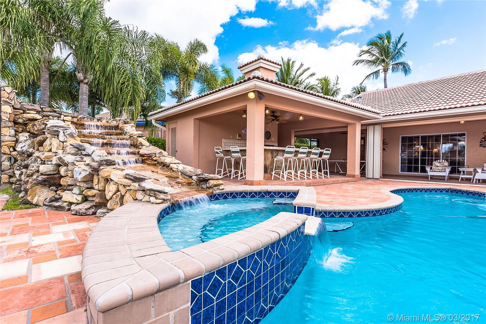 Custom Built Home in one of a kind street, beautifully updated, meticulously maintained. 4 Bedrooms with 2 and half bathrooms inside with pool,spa and spectacular waterfall overlooking lake is a dreamers delight. Great for entertaining around pool has built in BBQ area with full bathroom outside. Home has many unique features to boast about such as kitchen with granite counter tops and stainless steel appliances, cathedral ceilings, marble floors, Accordion Shutters, Backup Generator and so much more.