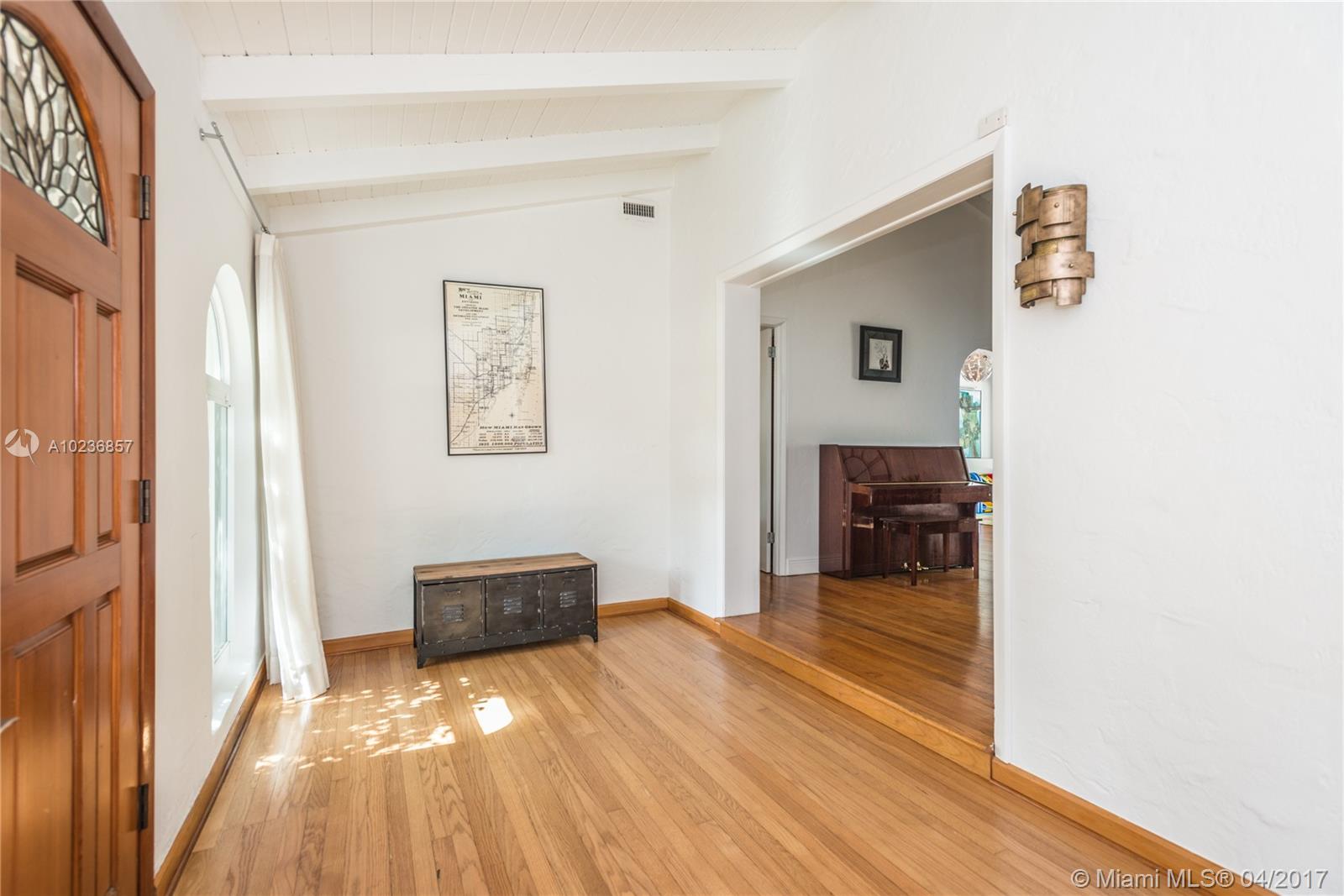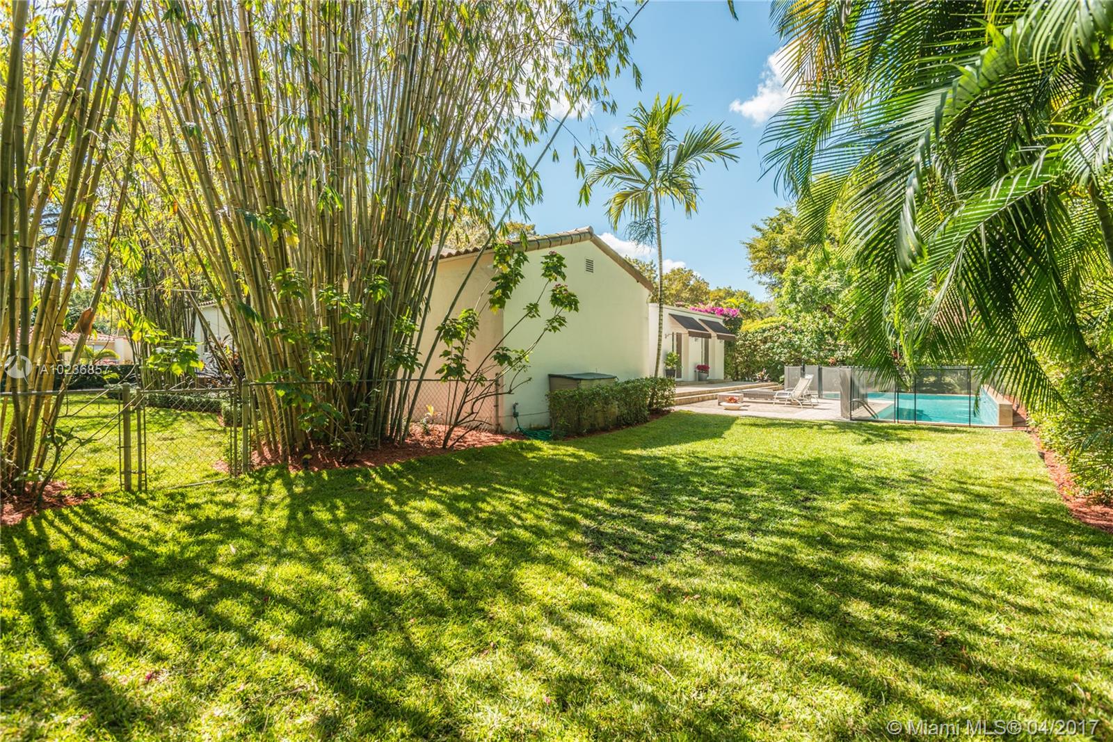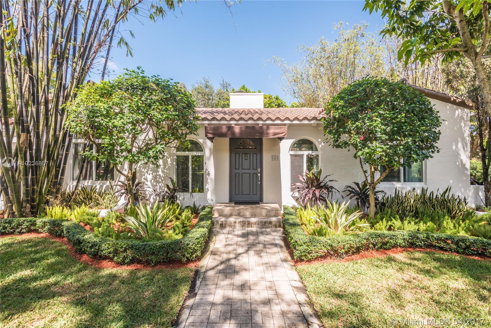 On a lush tree lined street in exclusive city of Coral Gables, modern elegance meets classic style. This charming home is surrounded by tropical landscaping & sits on an oversized 13,500 sq. ft. lot with pool & large patio, perfect for entertaining. This residence features vaulted ceilings, wood flooring, lots of light, internet wiring throughout, built in storage & computer nook, stainless steel appliances, ample storage, laundry area, new driveway with gate, spacious open kitchen & formal dinning room.